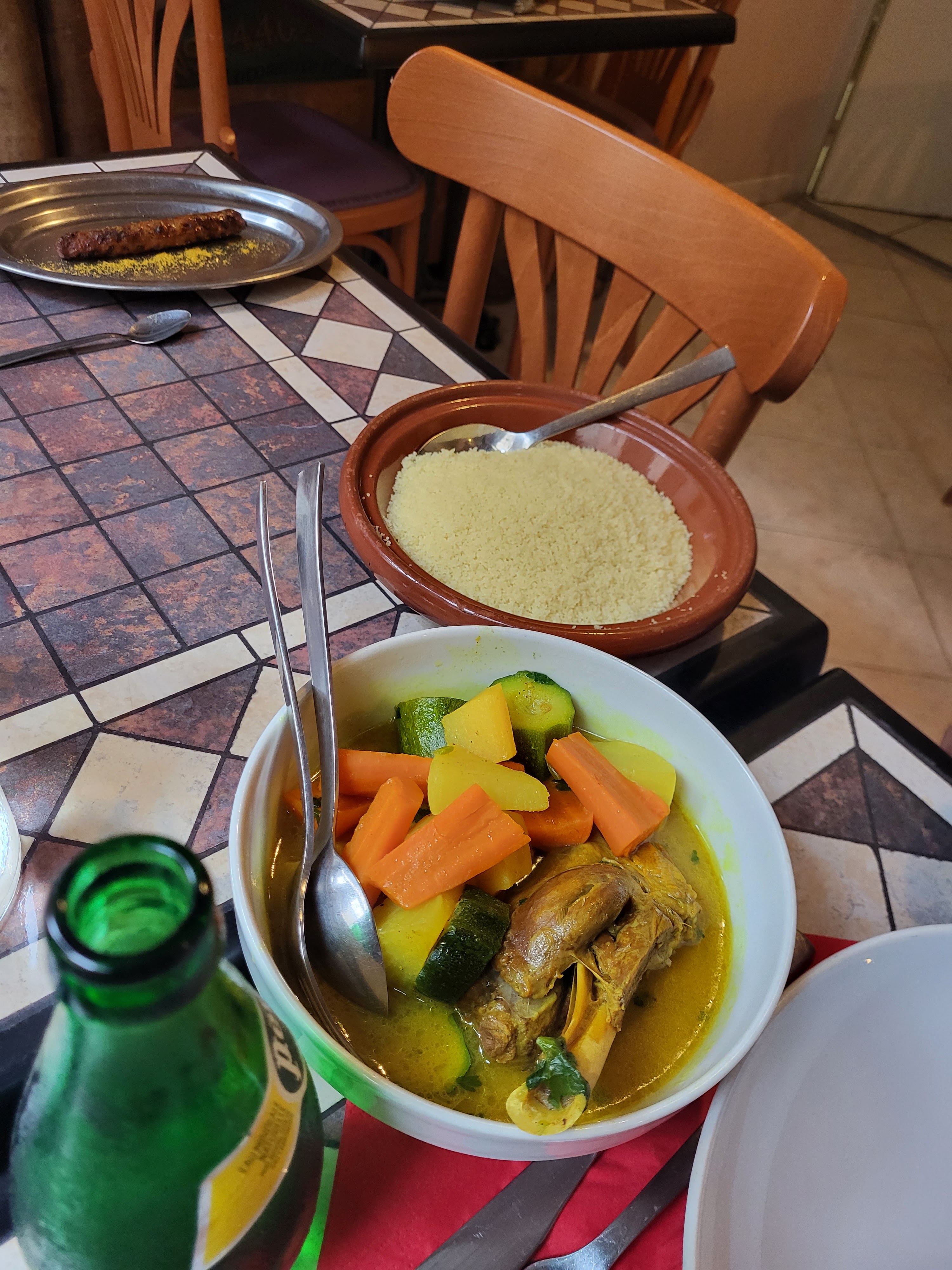 J’ai déguster un couscous avec brochettes de bœuf Tout était bon et bien épicé La rue est en travaux Mais il faut aller jusqu’au bout Je recommande !