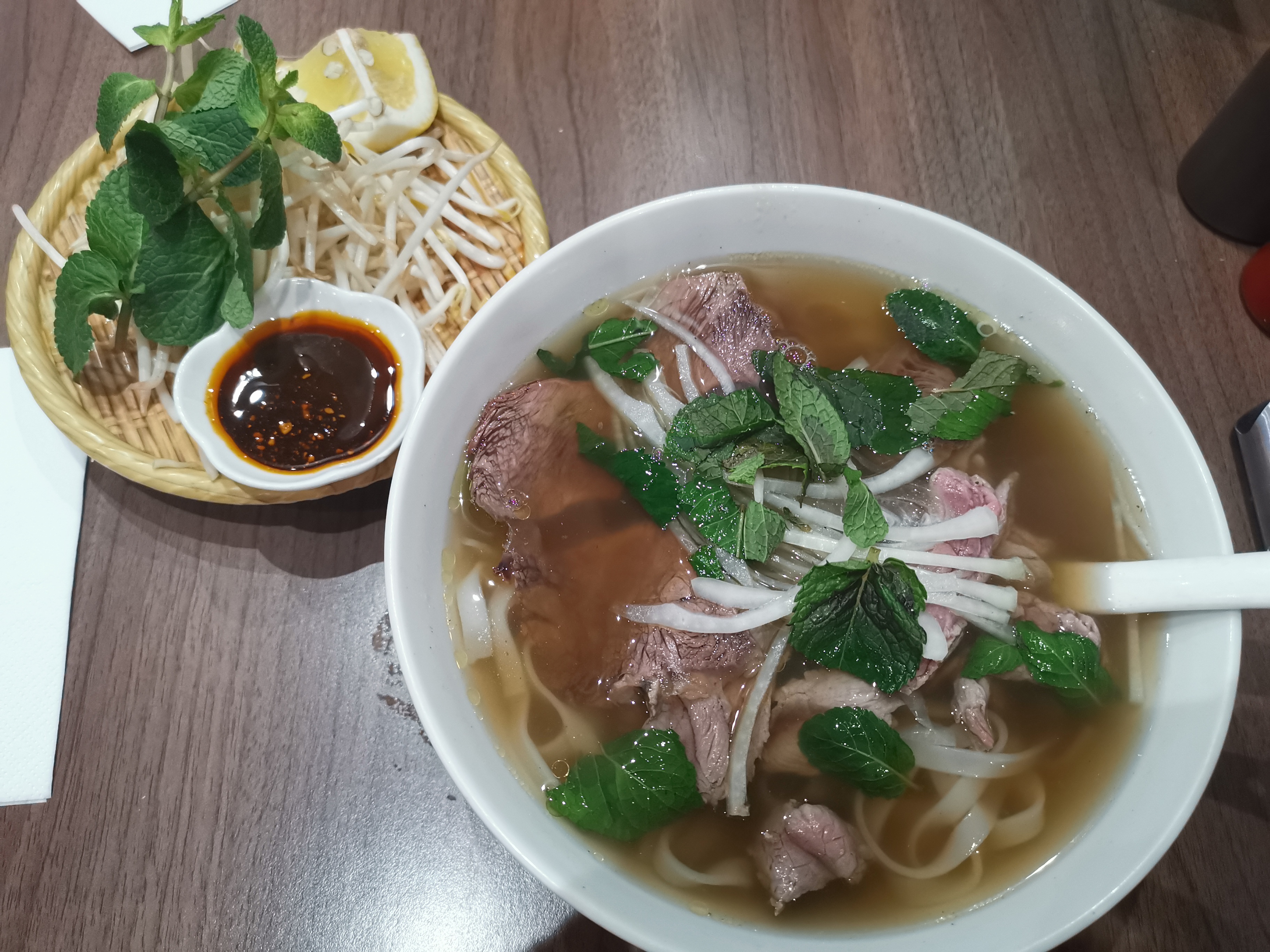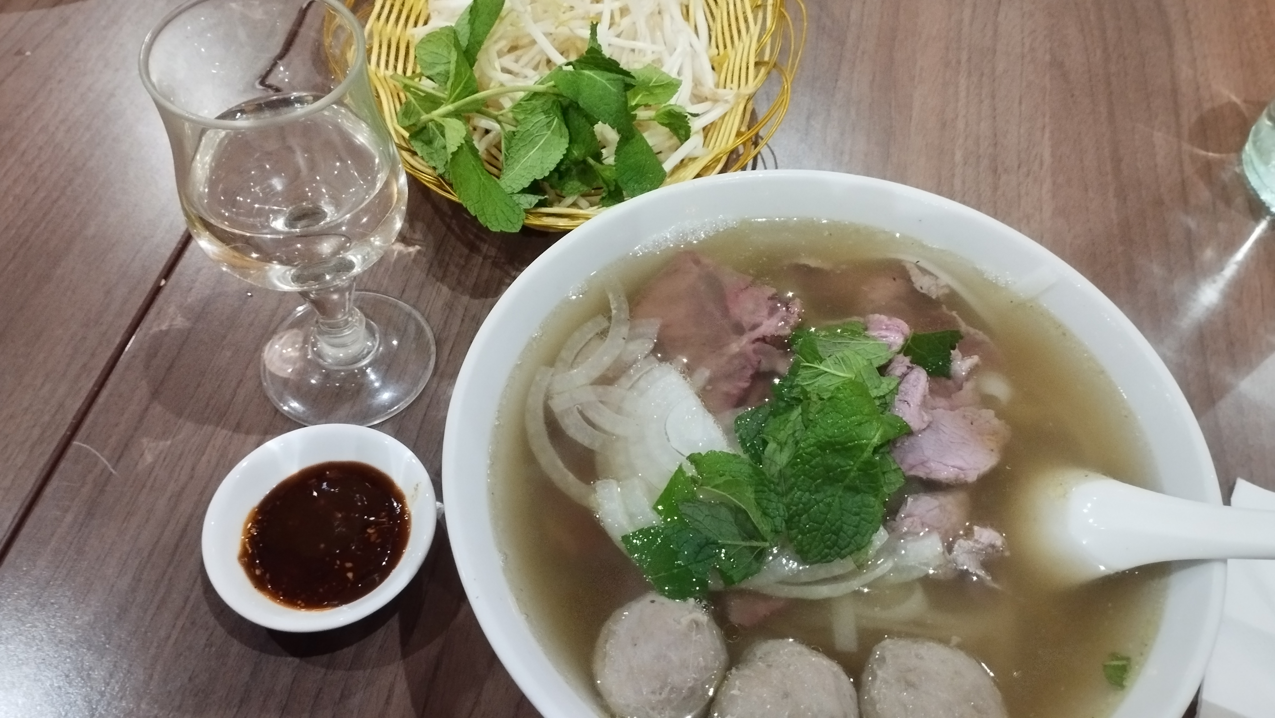 Bon pho. Le pho normal a le même prix que le pho special, ce qui est plutôt rare. J’ai bien aimé, ce n’est pas énormément cher non plus, prix plutôt correct. En plus de ça nous avons pris des boissons, coco avec des haricots rouges, un délice! Vraiment super bon mais je recommande en dessert plutôt. La boisson au lotus était vraiment bonne aussi ! Sucré et bien dosé Je recommande