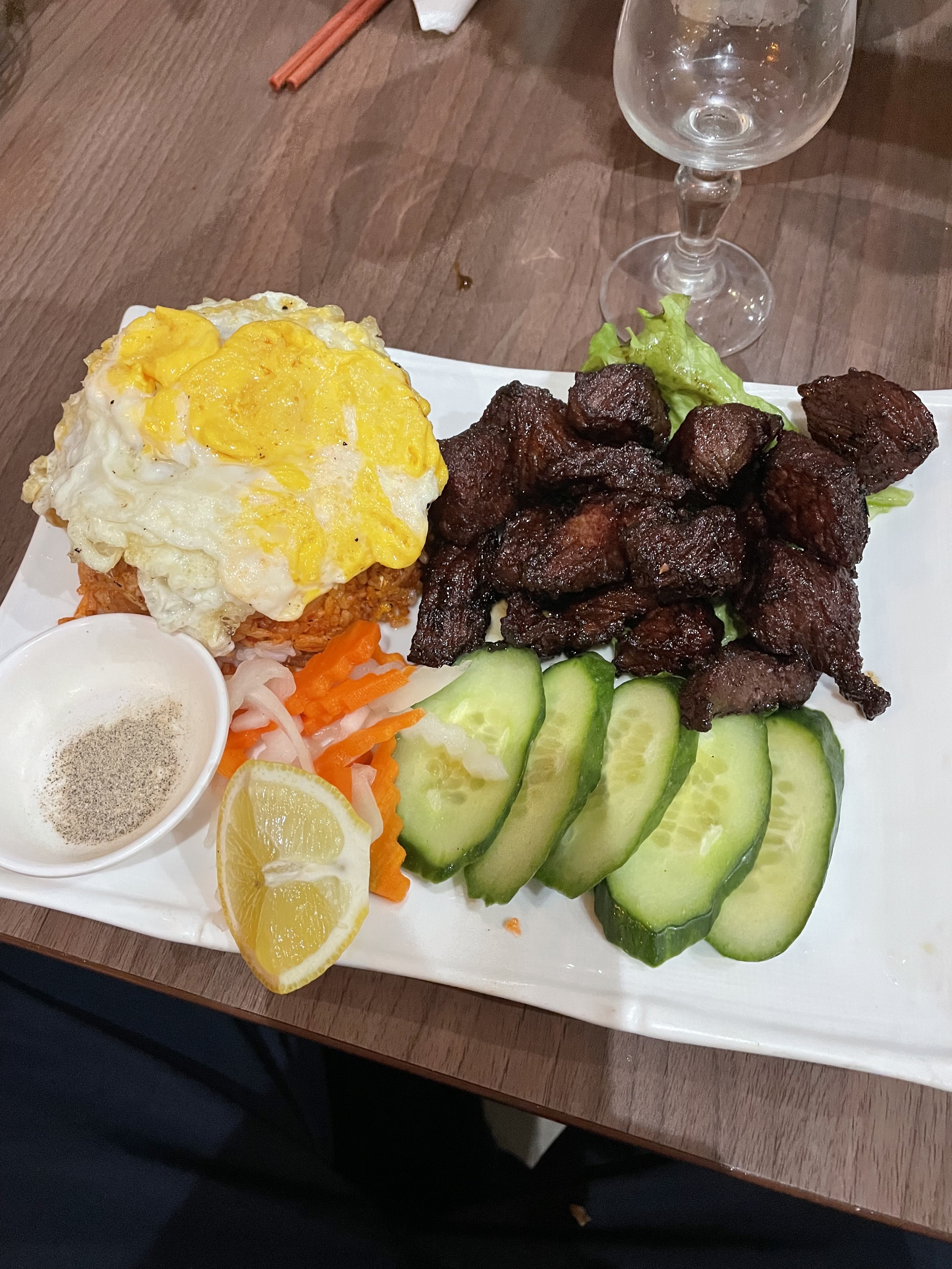Nous y avons mangé un midi à 3. Grande salle, l’odeur de la cuisine vietnamienne est présente des l’entrée, et c’est vraiment chouette car cela ouvre l’appétit 🤤. Le personnel est souriant, les plats arrivent vite. Et Franchement le rapport qualité prix est vraiment super, un bon Pho a 12€ ça fait plaisir, qui plus est, l’un des moins gras que j’ai mangé. Un collègue a pris le loc lac, très satisfait lui aussi. Et la cuisine ouverte était vraiment propre 🤗je recommande chaudement, bonne adresse 🙌