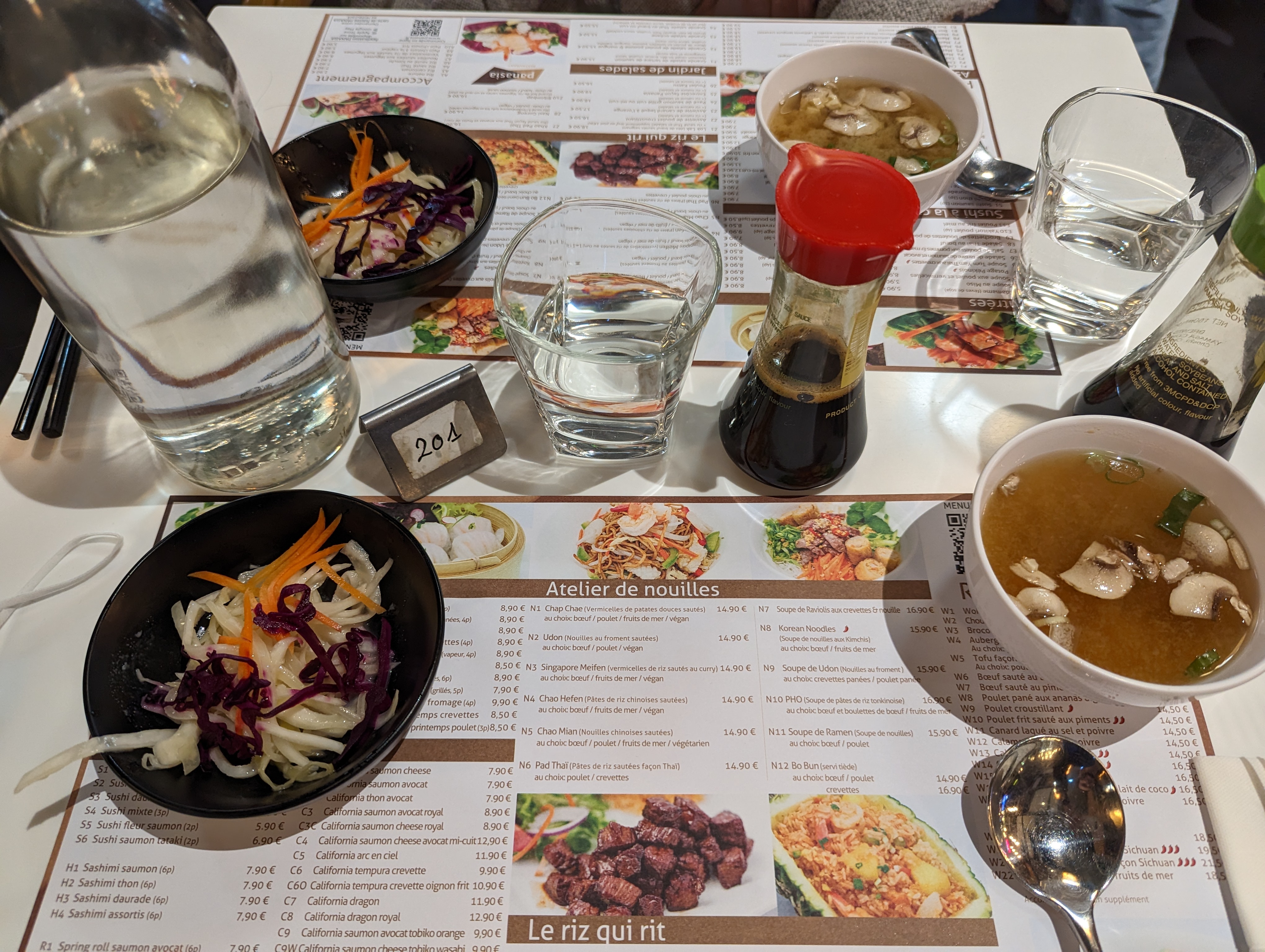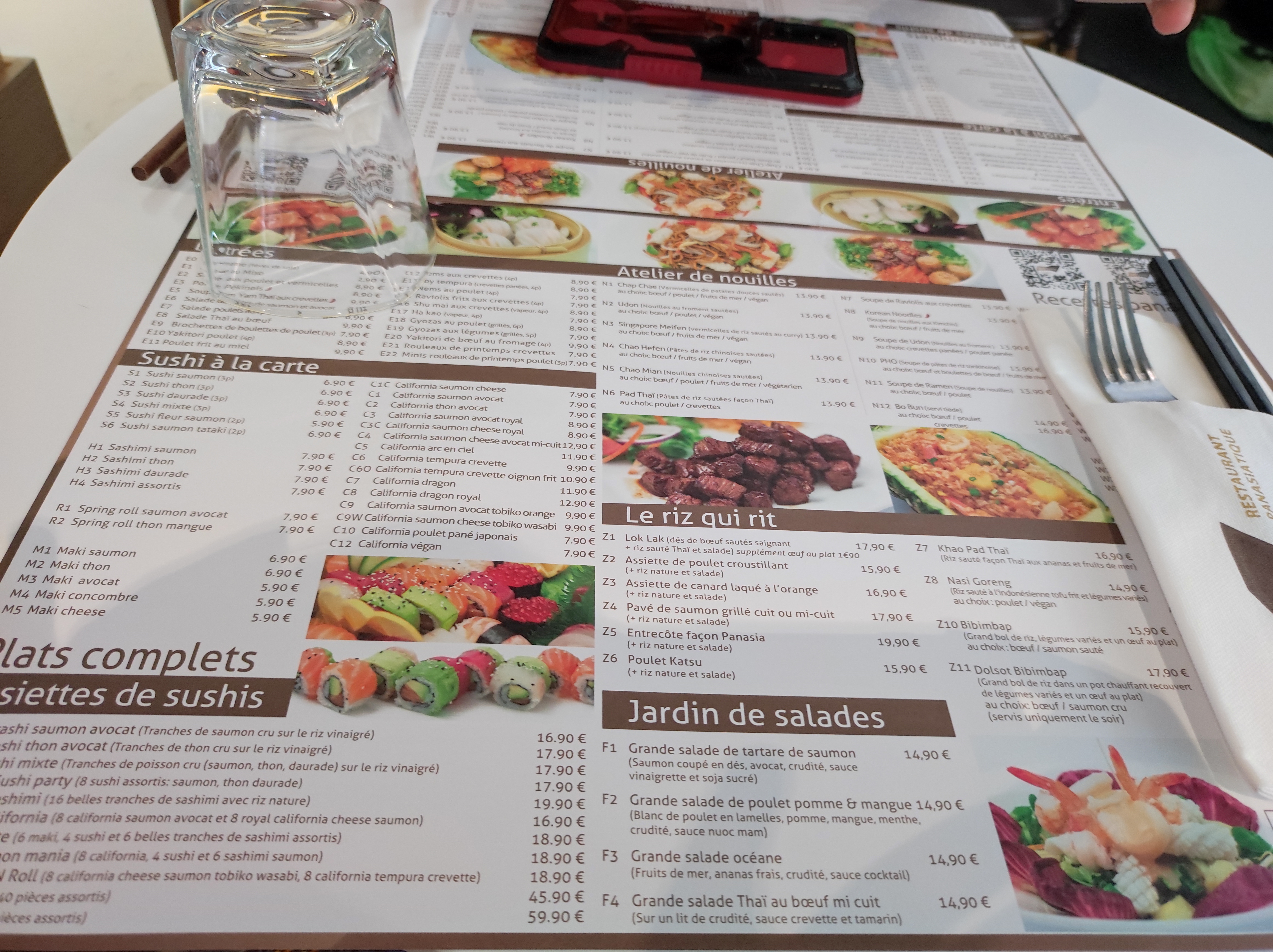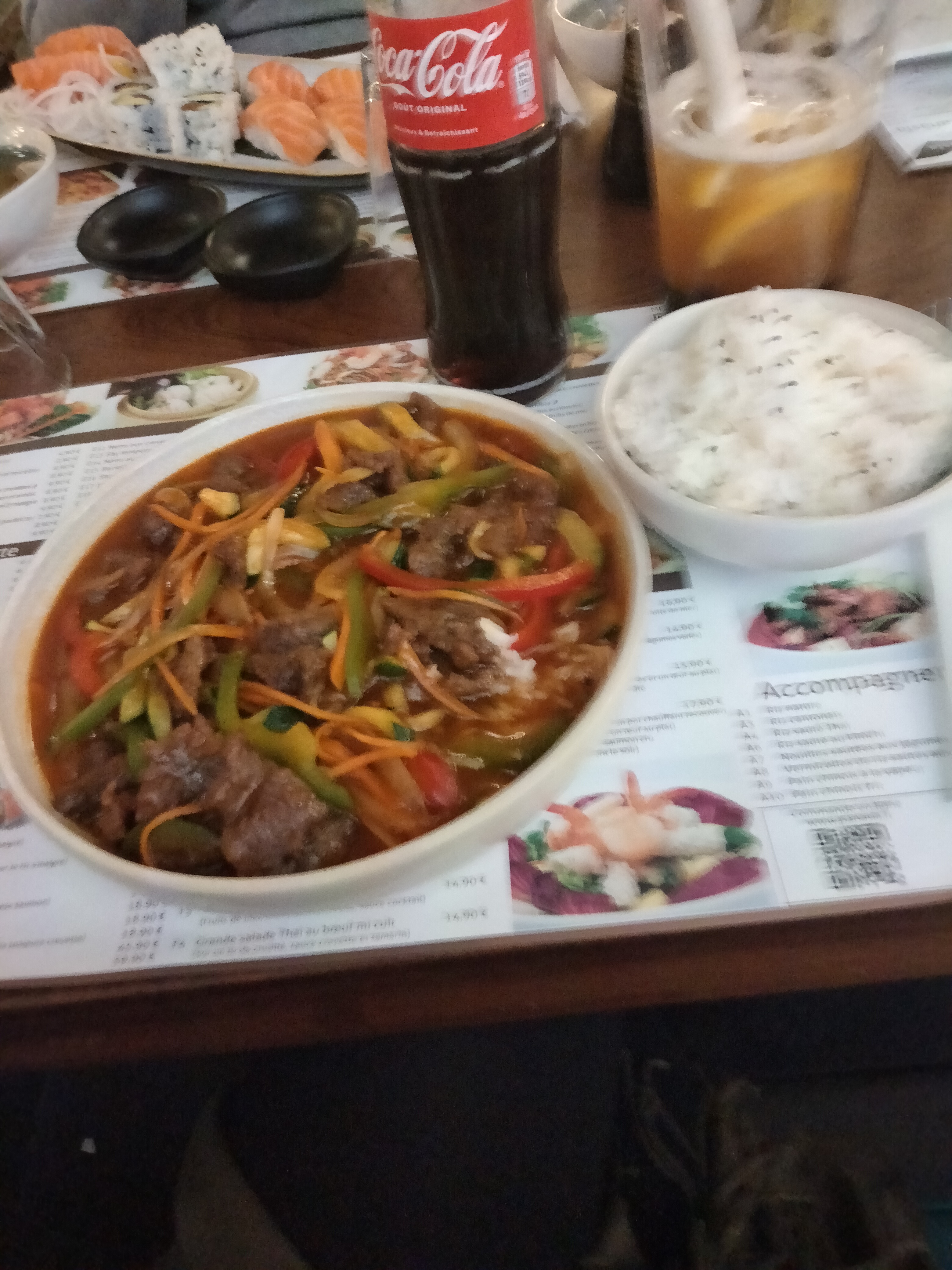 Grande carte de cuisine asiatique, beaucoup de propositions y compris végétariennes. Service correct, un peu trop mécanique. Une erreur sur un plat, qui a été refait intégralement (crevettes au lieu de noix de Saint-Jacques). Un peu d’attente et un petit décalage entre les convives. Les bémols : menu sashimis à 19,90€ (16 tranches de poisson, riz, soupe miso et salade de choux), le prix est un peu élevé pour l’endroit, le cadre et la quantité. Le serveur nous apporte l’addition à peine après avoir débarrassé les plats, nous étions proches de l’heure de fermeture mais aurions apprécié qu’on nous propose un dessert ou un café. J’ai eu l’impression d’être mise à la porte alors que nous n’étions pas les derniers attablés. Dommage !