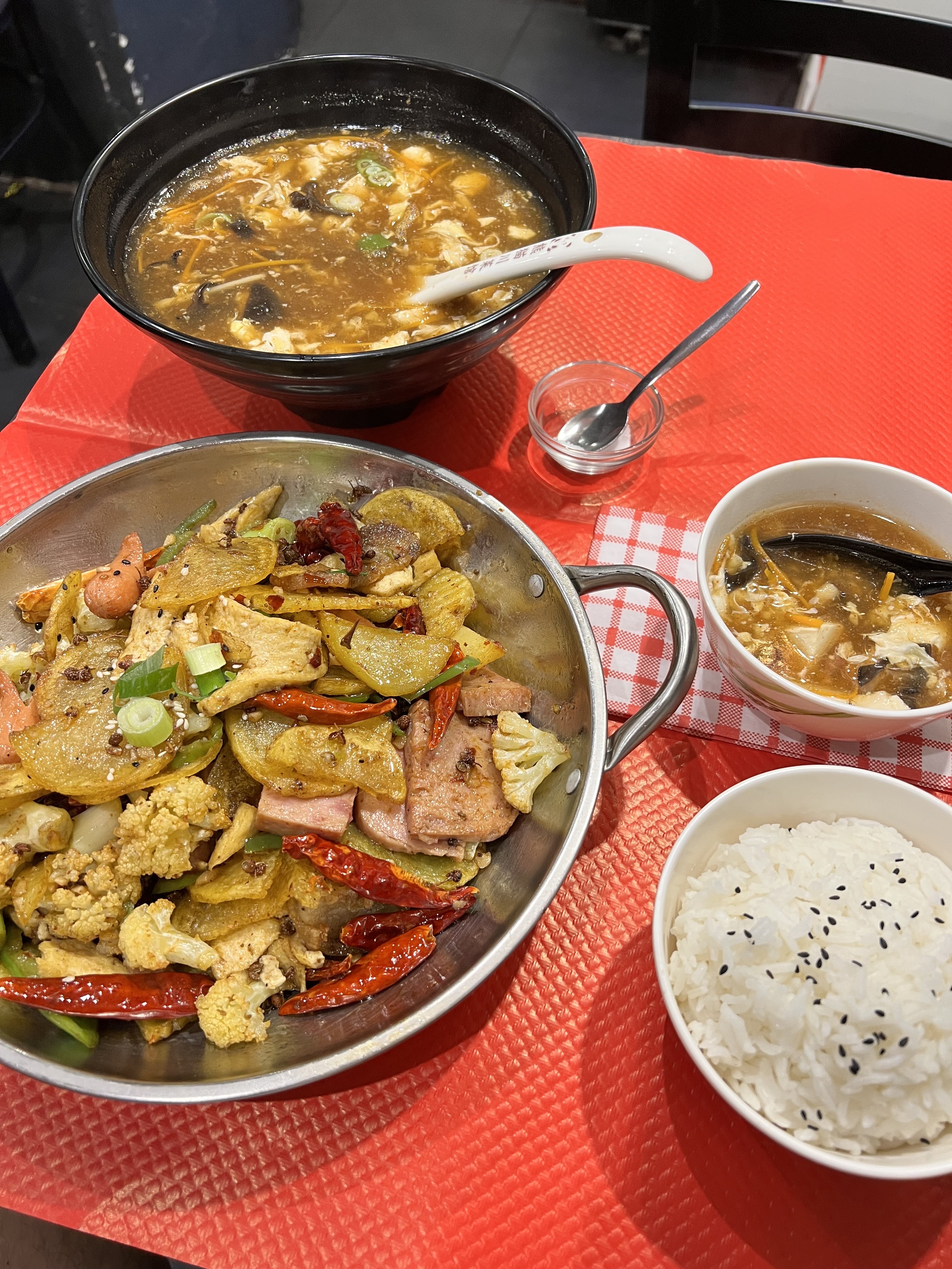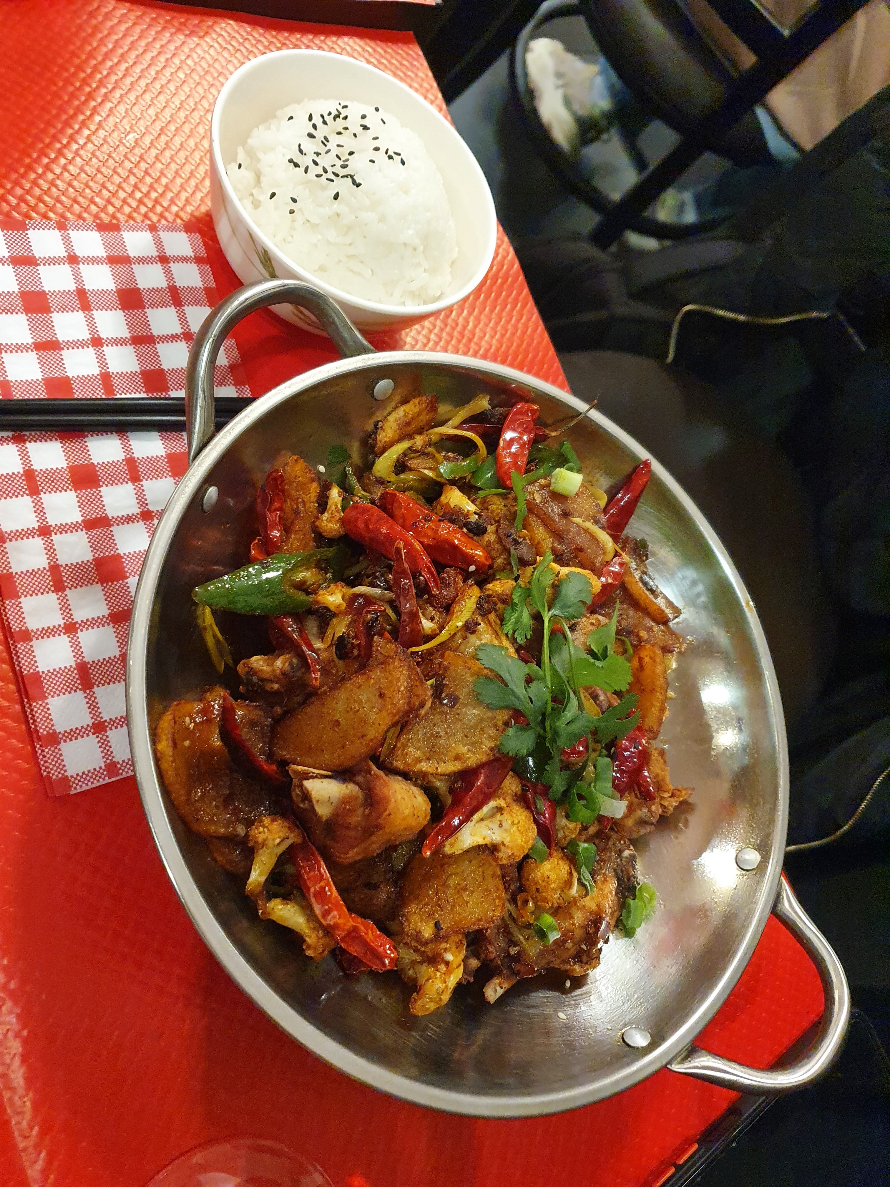 Je ne connaissais pas ce type de cuisine chinoise, et par curiosité nous nous sommes arrêtés. Les entrées étaient bonnes, mais les plats étaient vraiment très très TRÈS TRÈS HUILEUX : le mapo tofu, plat à base de tofu et de viande de porc, baignait/pataugeait dans l'huile... impossible à manger ! J'ai regardé des vidéos sur la préparation de ce plat une fois à la maison, et je pense que la soupe d'huile que l'on m'a servie n'était pas normale...