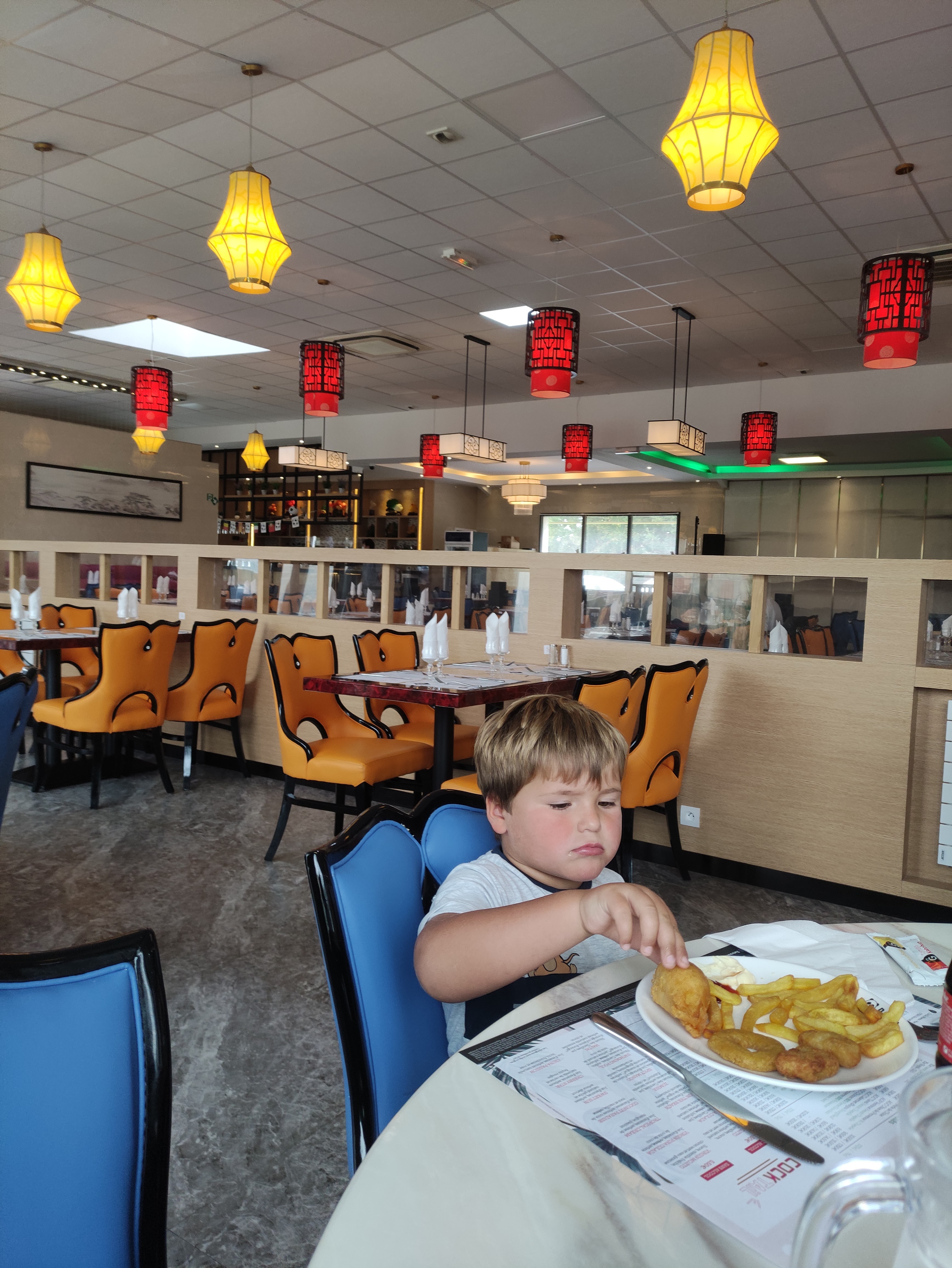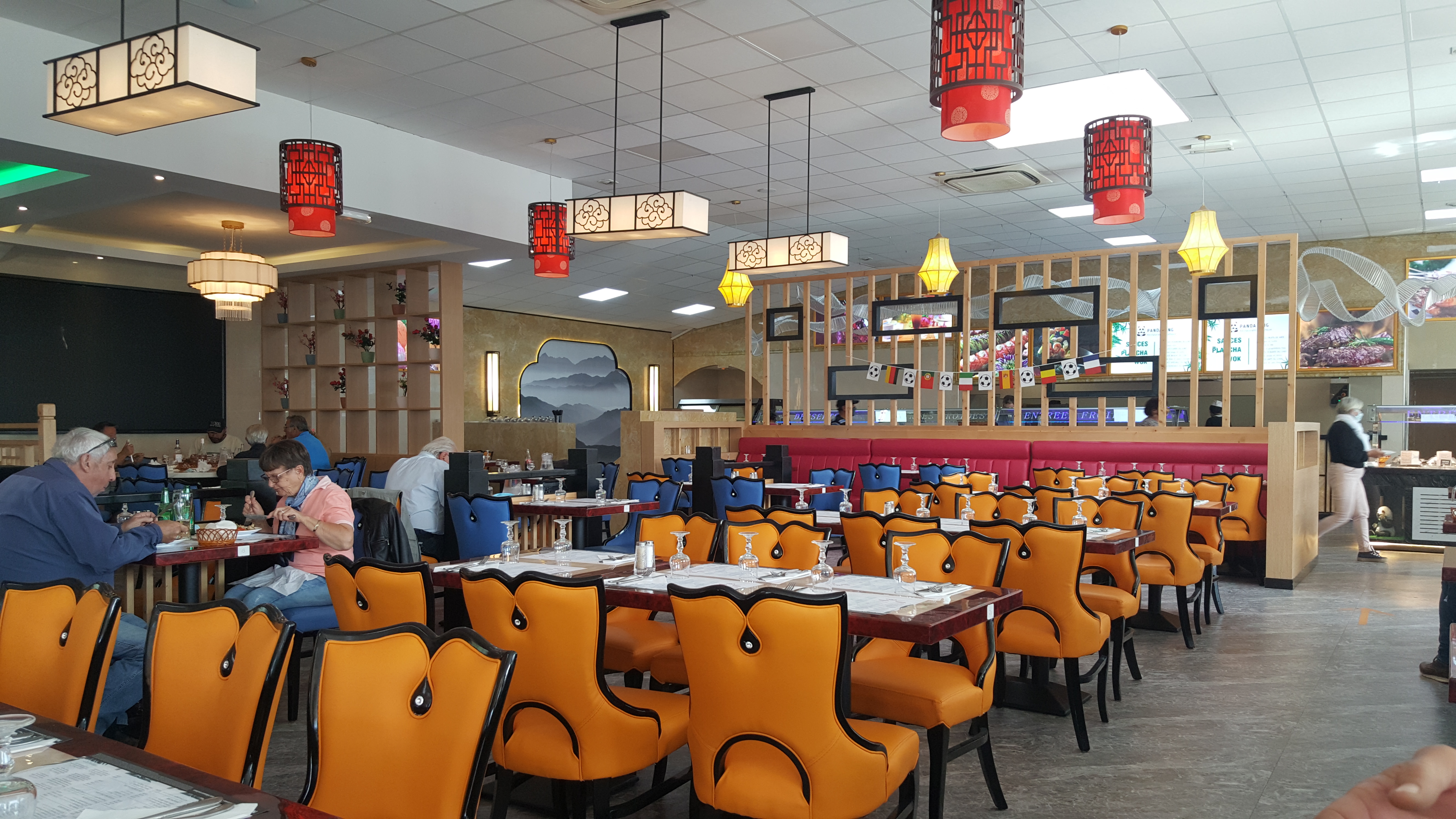 Excellent restaurant , décor intérieur très chic dans une très grande Salle Avec des tables spacieuses . Endroit propre . Le buffet est super bon : huitres, bulots, grosses crevettes et crevettes grises, langoustines... Beaucoup de viandes en sauce, beignets , coin salade, coin sushis, coin charcuterie, coin wok avec beaucoup de choix de viande ( mouton, boeuf, poulet...) , gambas , coquilles st Jacques .... que le cuisinier cuit devant nous ( delicieux) . Frites, riz cantonais, nouilles avec petits legumes ... bref beaucoup de choix. Pour Les desserts aussi tout est delicieux: Ile flottante, pleins de tartes ( pommes, chocolat, citron, noix de Coco...) , Glaces ( 5 parfums) , bonbons, pleins de fruits préparés ( melons, pasteque, pêche ..) De quoi faire un très bon repas à un bon Prix. Restaurant qui vaut le deplacement. Nous étions une table de 5 adultes et avons vu des enfants aussi et des chaises bébés.
