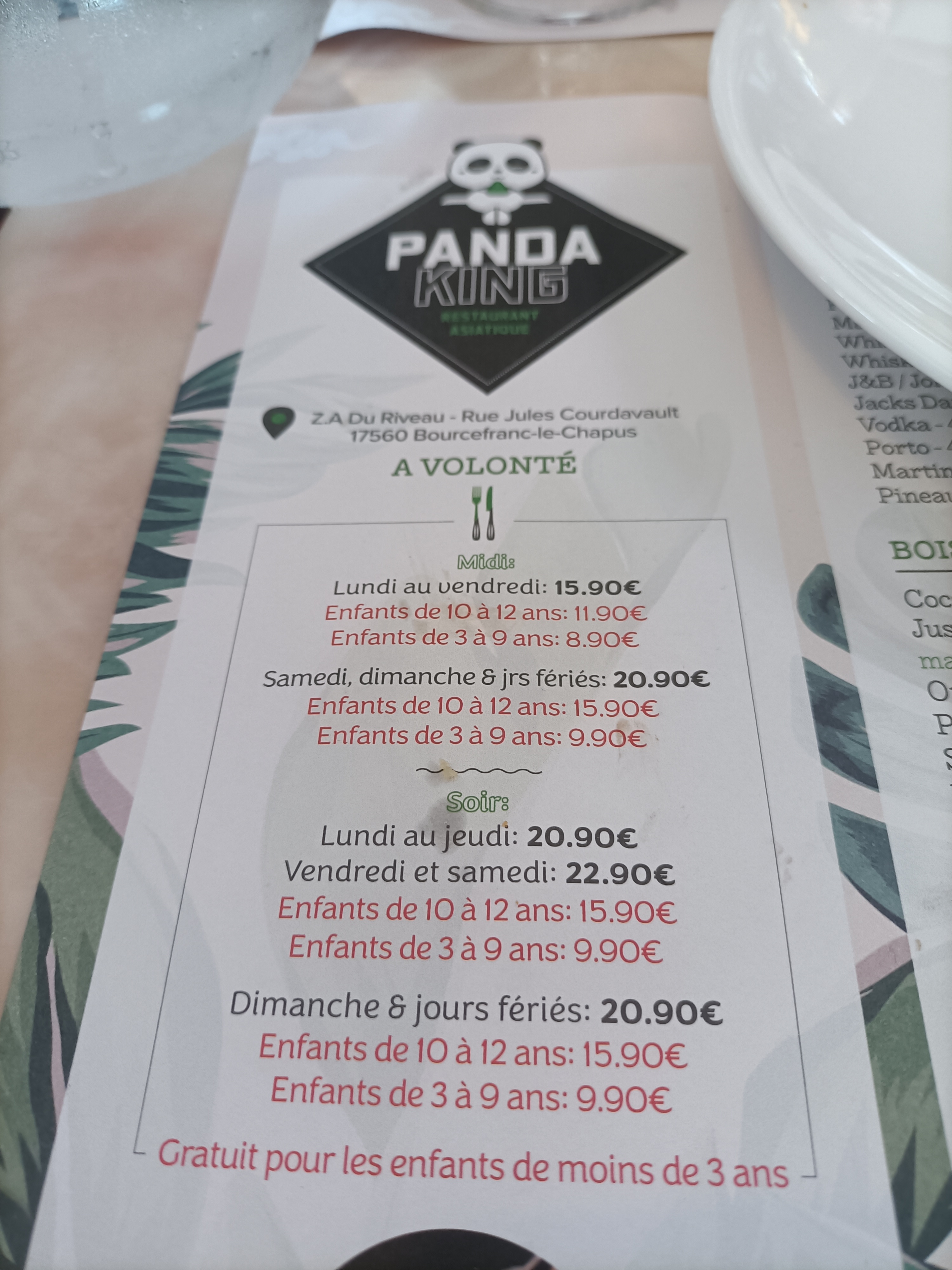 Je suis allé dîner le 19/06/22 pour la fête des pères, très bon accueil, restaurant propre, menu à volonté pour moins de 21 euros le dimanche soir. Entrées (spécialités asiatiques, charcuterie, fruits de mers...), plats et desserts variés. La partie wok est bien agencée, le personnel souriant. J'ai bien apprécié ce restaurant qui permet de bien se régaler à un tarif plus que correct. Je suis un peu surpris par quelques avis ditiranbiques que j'ai pu lire avant de me rendre dans cet établissement. Ce n'est pas un resto avec autant de choix que dans l'enseigne Shao mais c'est aussi bon. Je reviendrai lors de mon prochain séjour sur l'île d'Oléron.