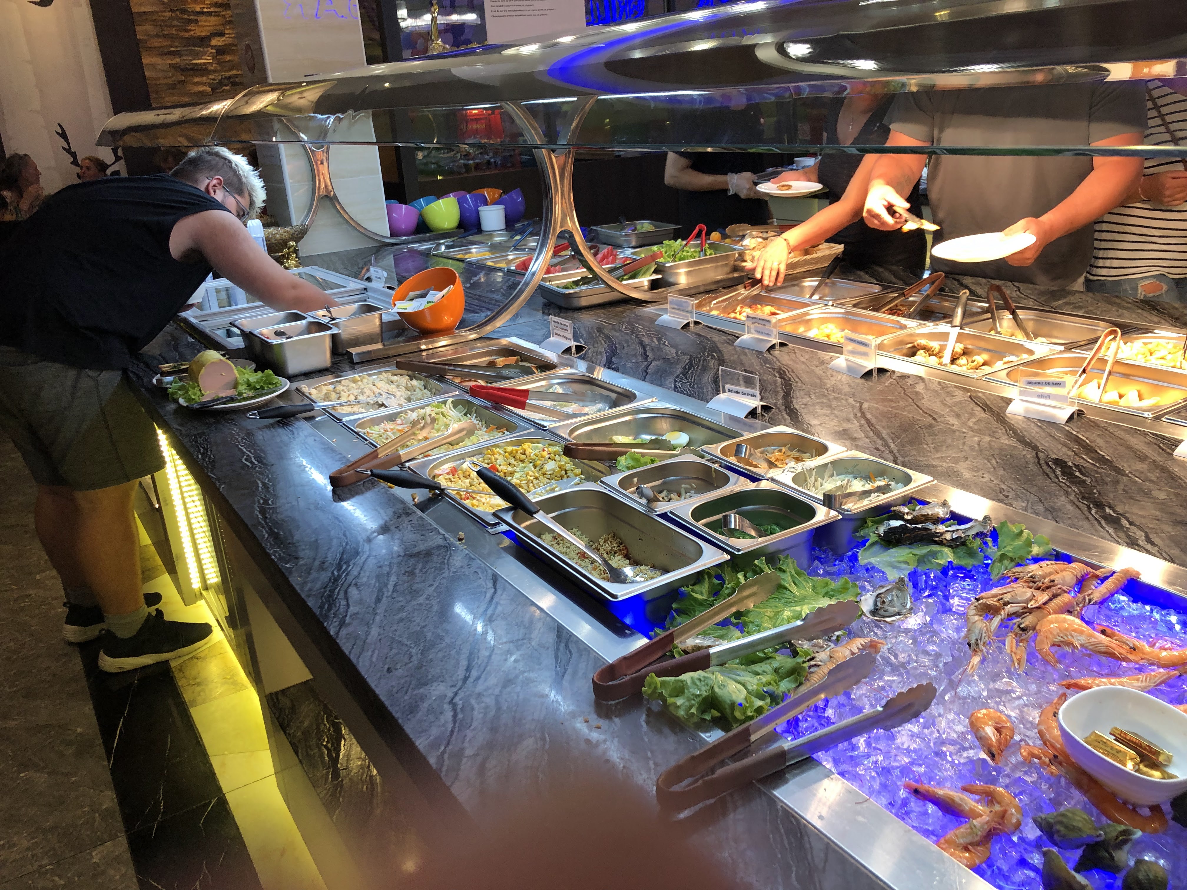 Le buffet est bon, même si parfois juste chaud, et les desserts décongelés industriels sont limites sur la fraîcheur (vu parfois la chaleur en salle pour la conservation c'est limite). La bonne note vient pour les sushis qui eux sont bons.