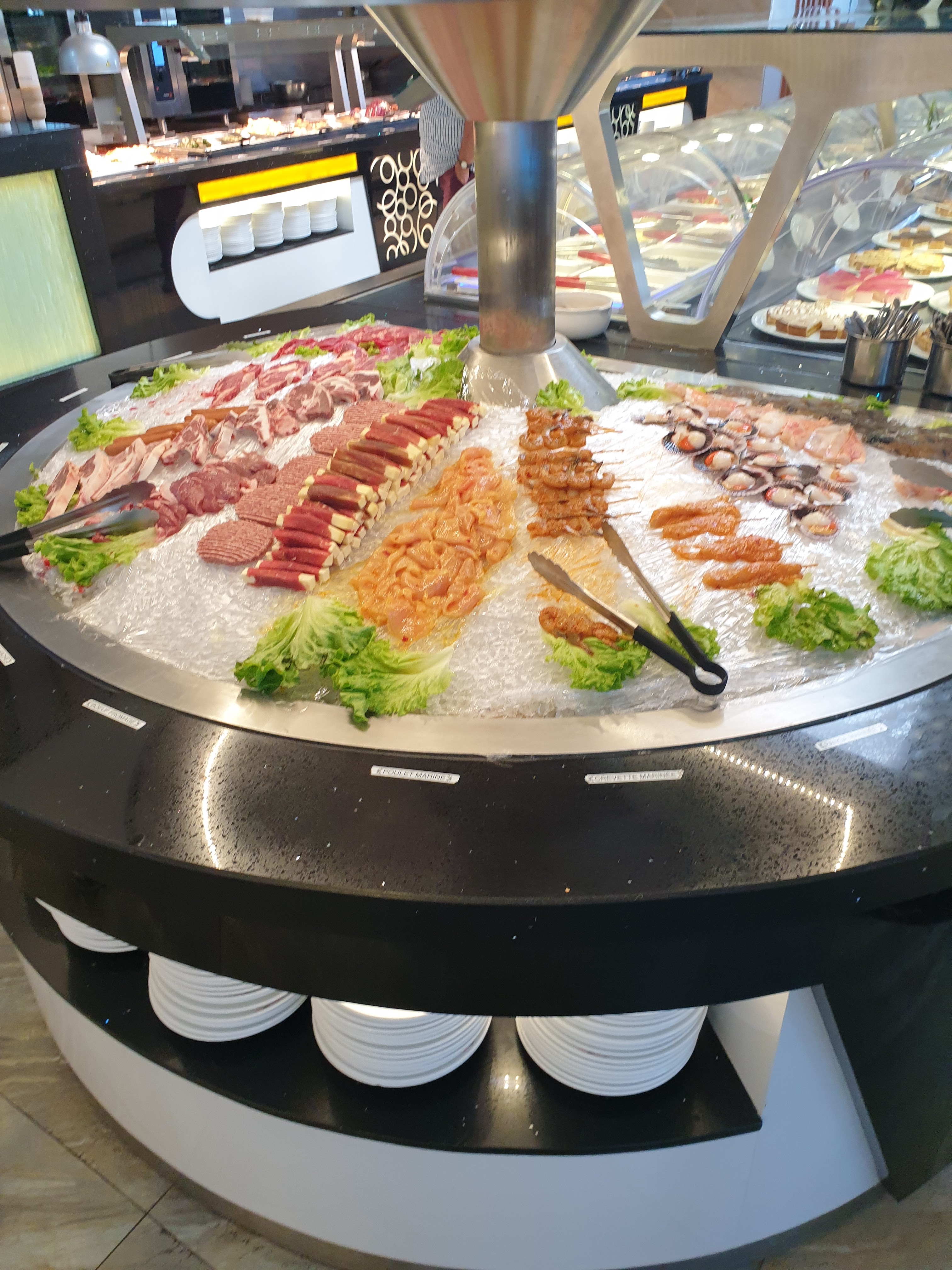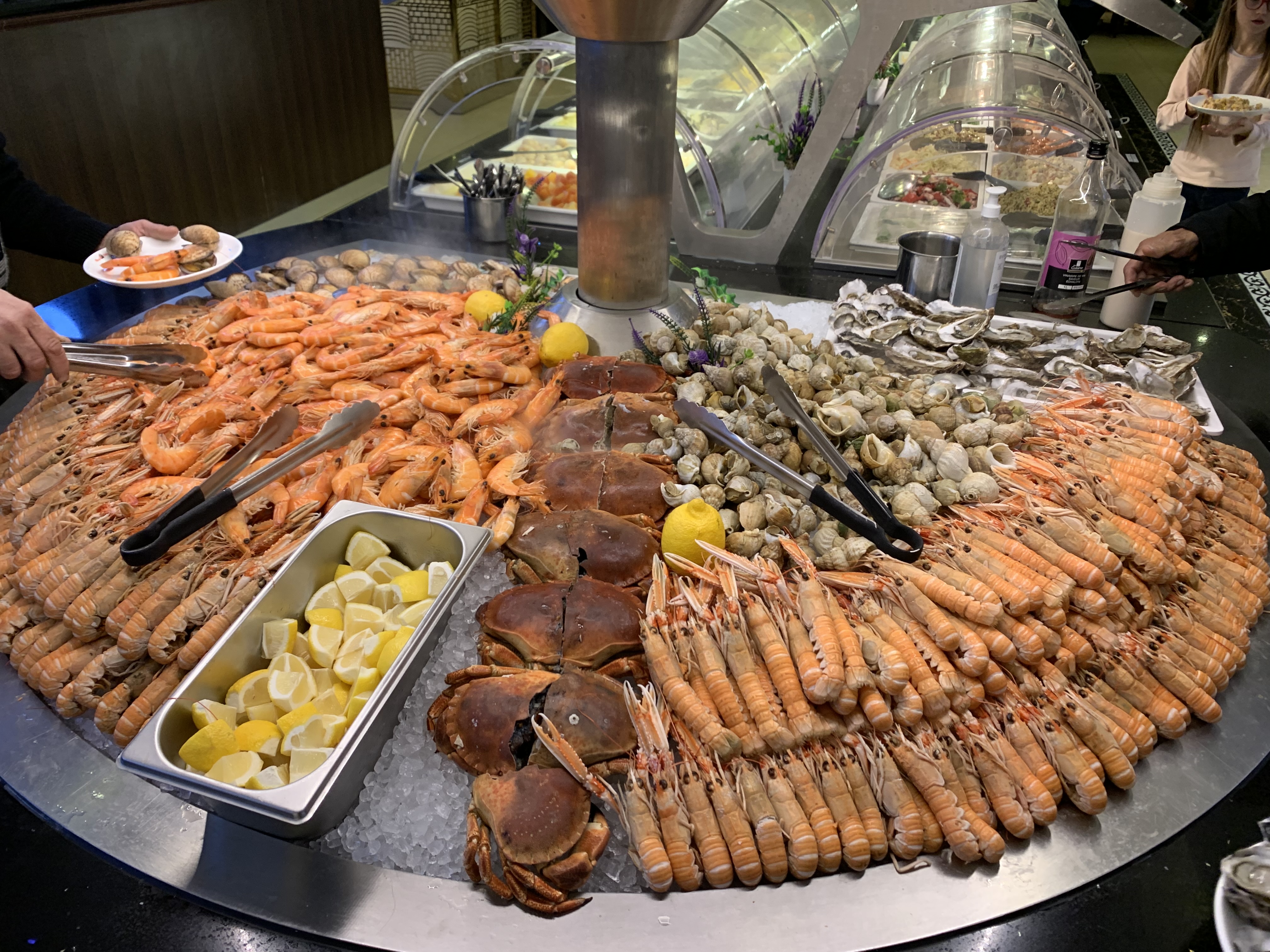 Énormément de choix, ce qui est appréciable, mais les plats chauds sont froids malheureusement. La salle est très grande mais beaucoup de tables trop proches les unes des autres, ce qui rend l'ambiance trop bruyante.