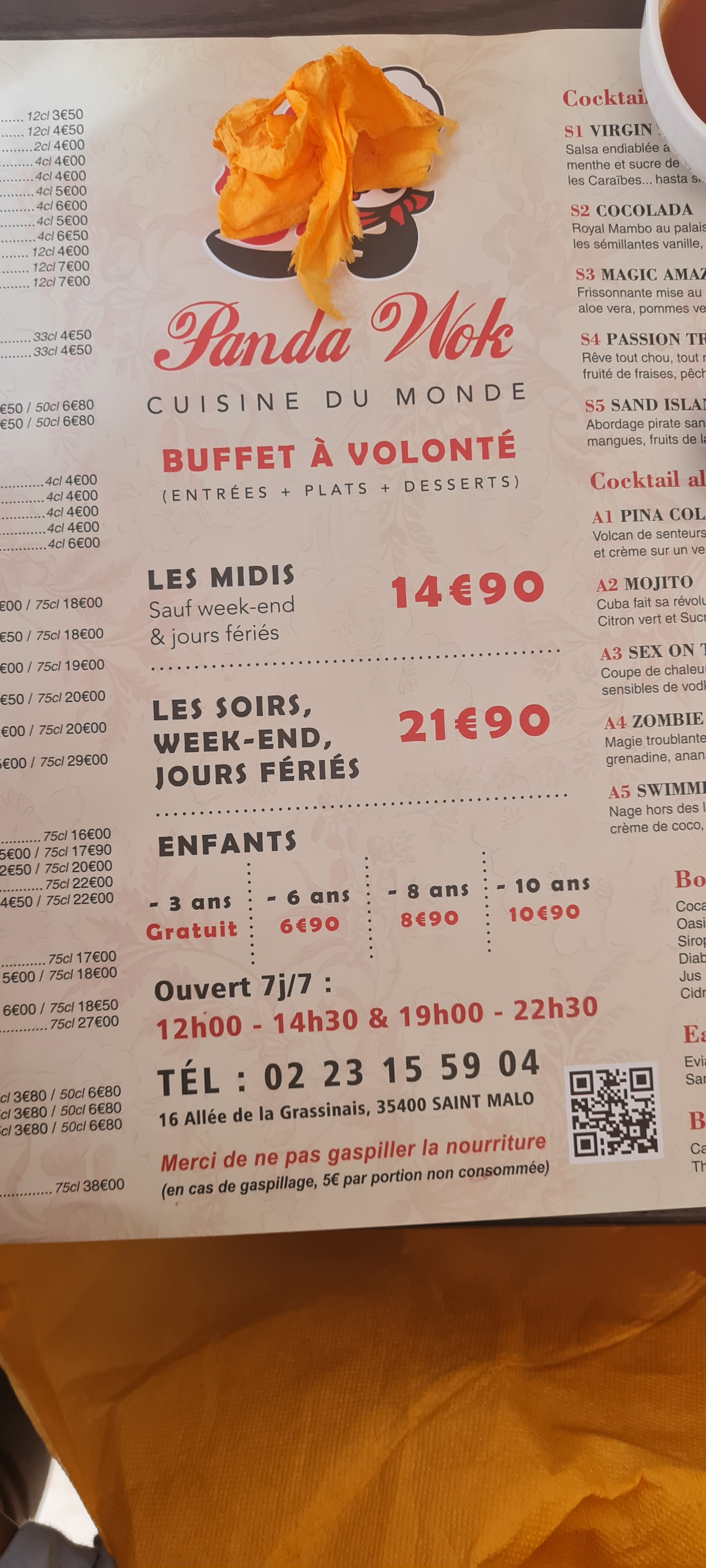 Véritable coup de cœur de ce restaurant à volonté dans lequel je me rends chaque fois que je passe sur St malo, Un choix illimité de produits de qualité, possibilité de grillades, wok, etc Restaurant adapté au végétarien, produits principalement orienté asiatique mais également disponibilité de produits plus locaux ainsi que fruits de mer etc Avec un personnel très réactif et aimable, un cadre chaleureux et lumineux, assez spacieux, Vraiment rien à redire.