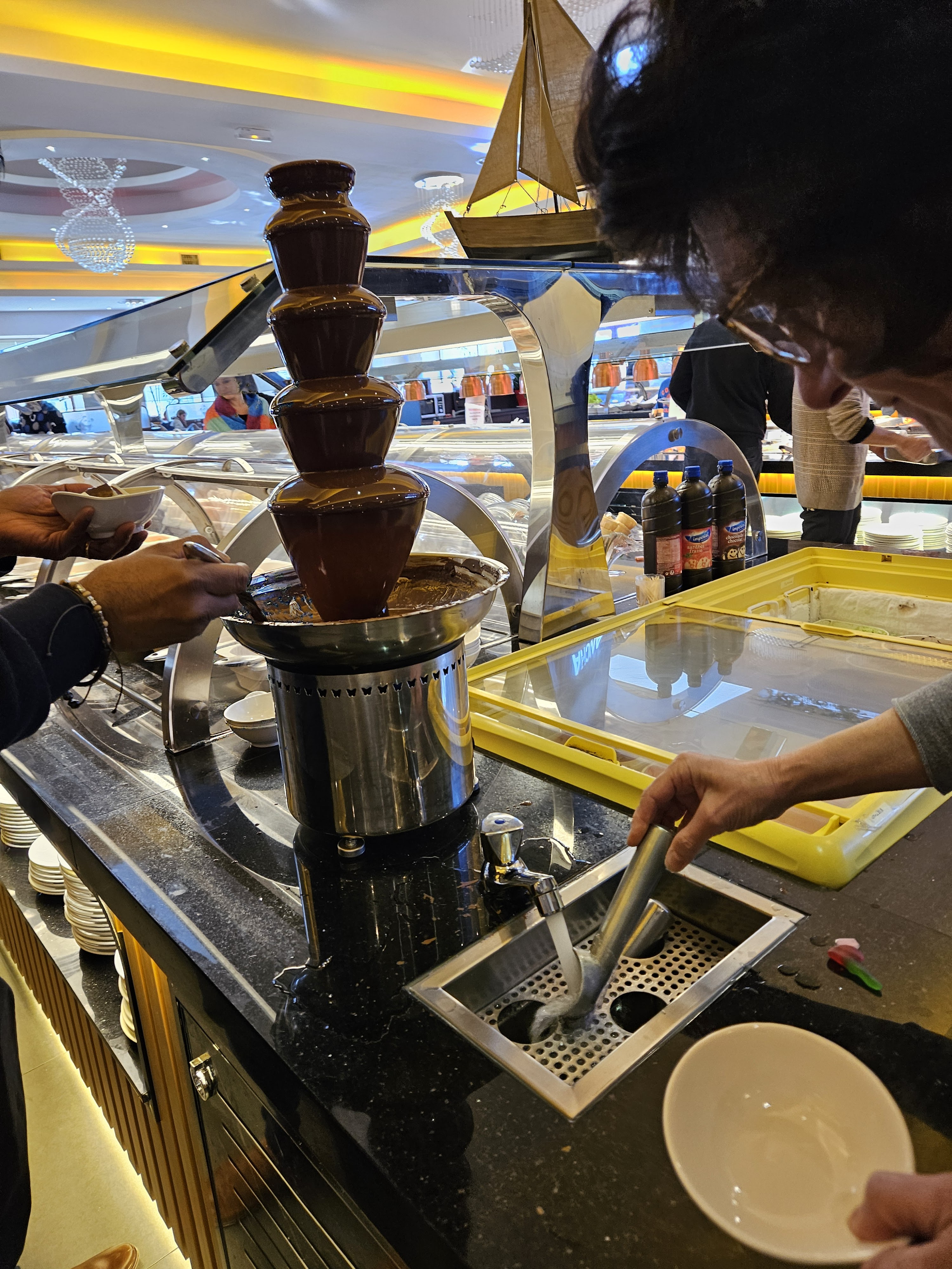 La salle est vraiment magnifique et les toilettes sont plutôt propres (il faudrait ajouter du papier absorbant pour se sécher les mains). La partie wok/plancha est correcte avec une bonne variété de fruits de mer. Le personnel était sympathique et disponible. Par contre, la qualité de la nourriture est vraiment mauvaise... la recette des churos n'est pas maîtrisée et beaucoup d'autres plats salés sont beaucoup trop salés. J'ajouterais également qu'ils ne remplacent pas les récipients vides assez rapidement, car beaucoup étaient toujours vides même si je suis revenu plusieurs fois pour des portions supplémentaires.