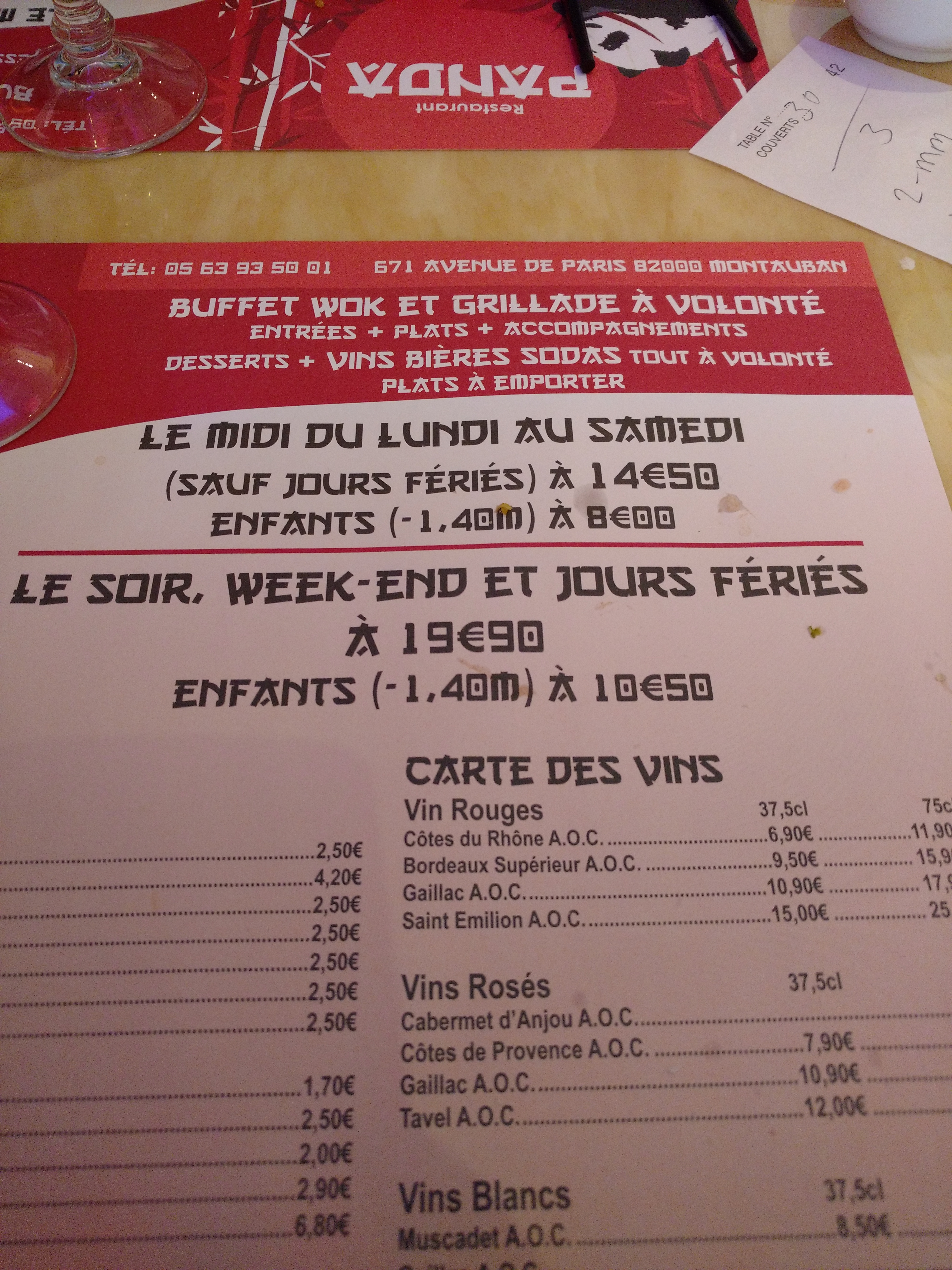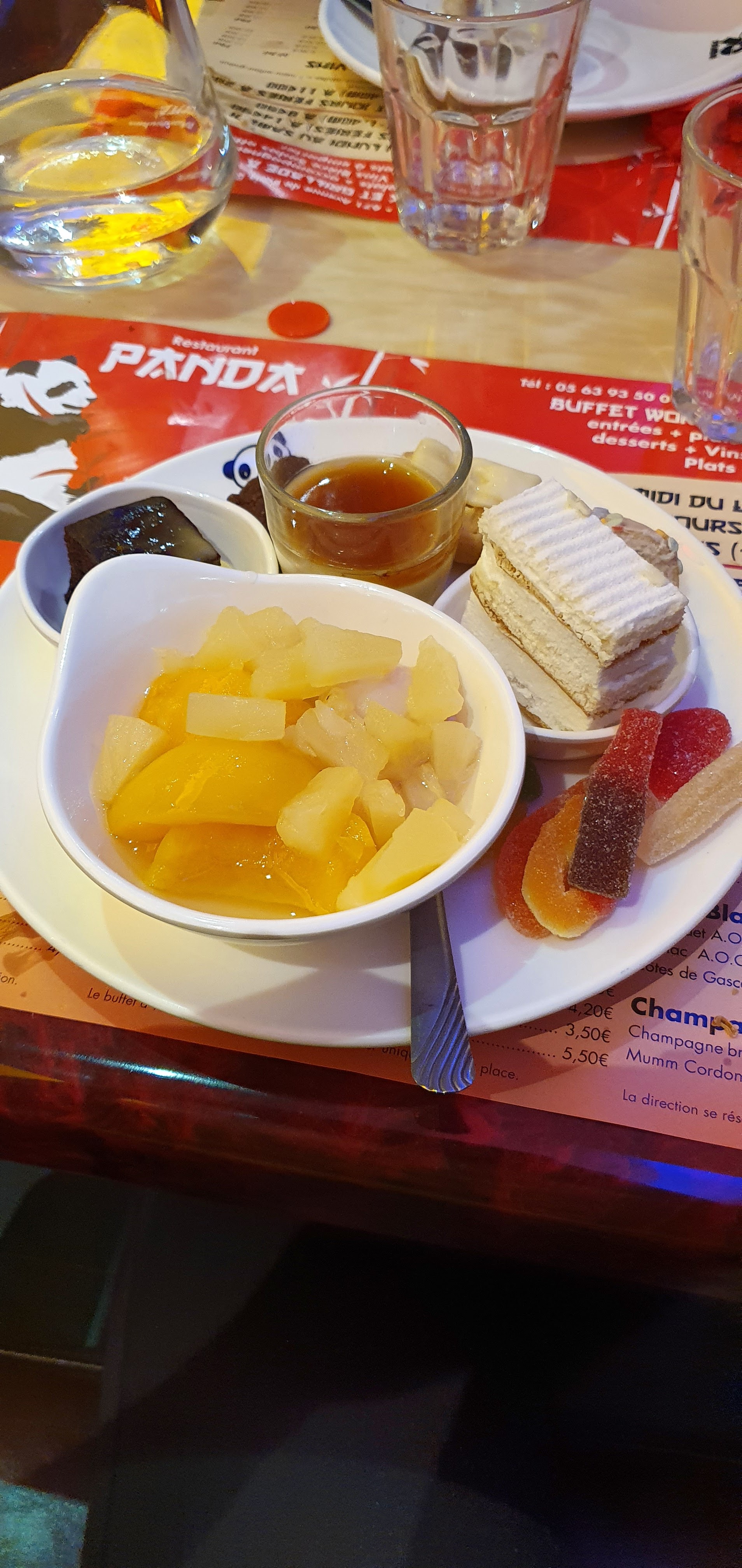 Un bon éventail de choix que se soit en entrées plats ou desserts. Plancha/grill également. Un buffet chinois assez classique en fait. Dans le menu est inclus une boisson Même les bonbons y sont.. Pour être tatillon je dirais qu il manquerait la chantilly pour les desserts. La dernière fois que nous y sommes allé la fontaine de chocolat n était pas en fonction (chocolat dedans, dut car pas allumé.) Nous y reviendrons probablement lors d un passage a Montauban