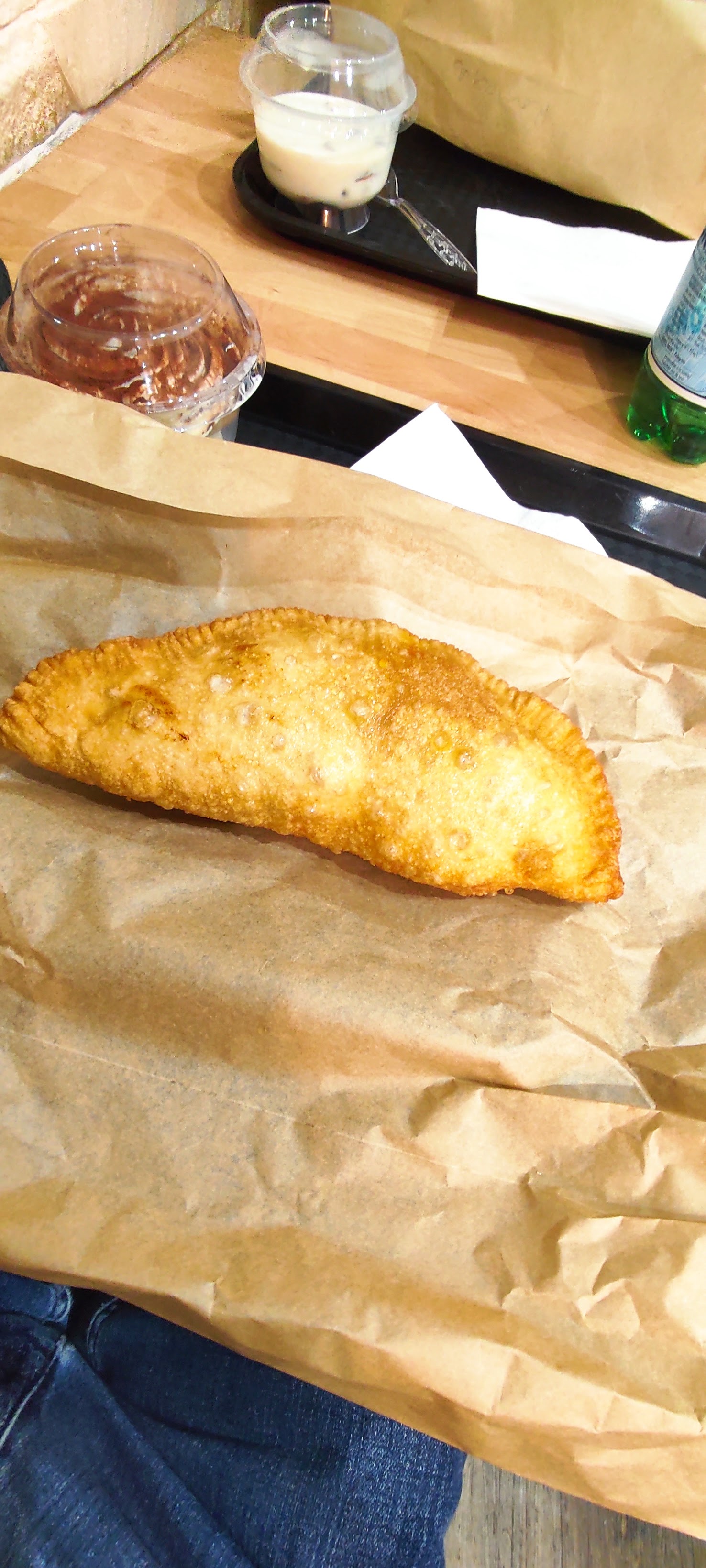 Très bon panzerotti mais il faut faire attention lorsqu'il est servi, celui-ci est brûlant! Il vaut mieux l'ouvrir un peu pour laisser s'échapper la chaleur et le liquide de la farce avant de le déguster. Soda italienne au raisin également de très bonne facture. Panzerotti + soda à 8 euros.