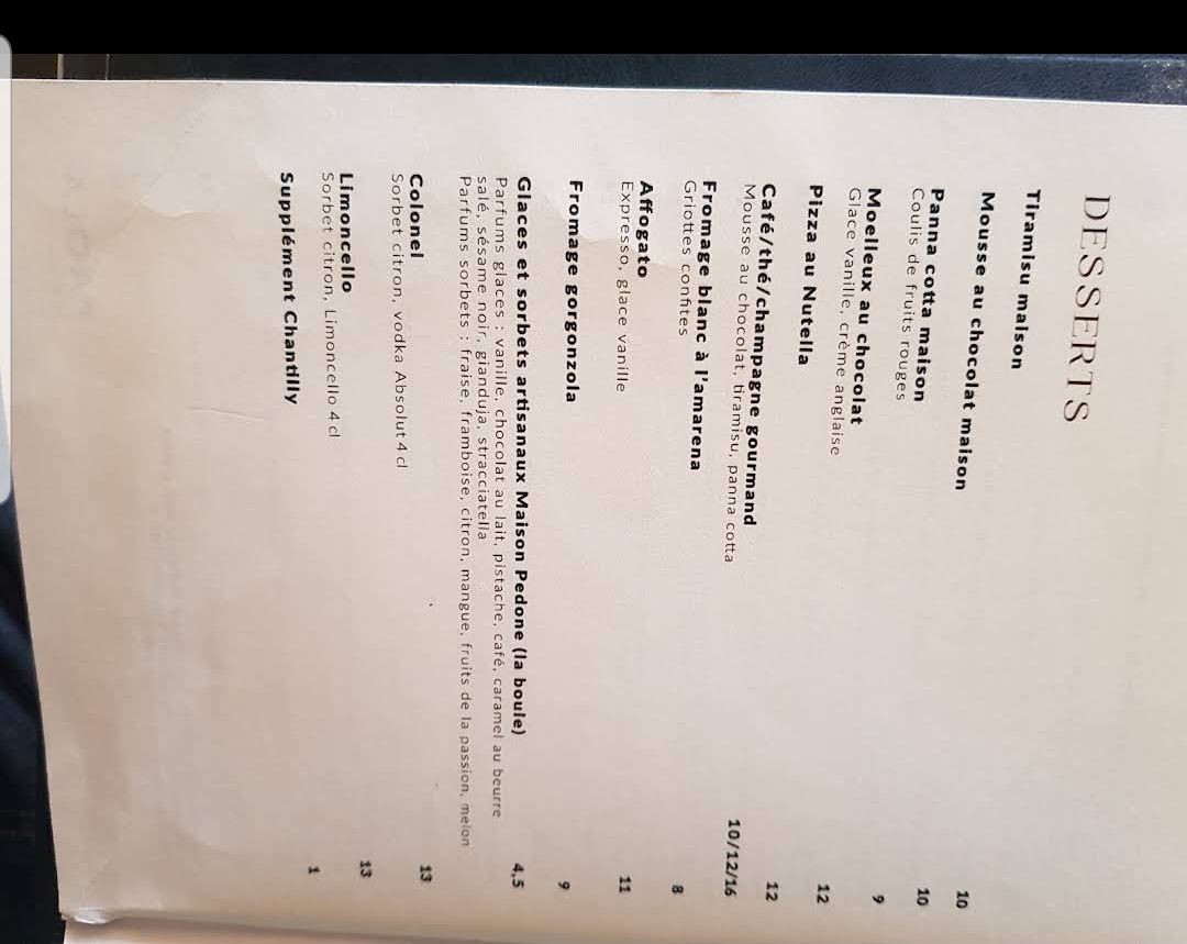 Très bonnes pizzas ! Un peu deçue par les pâtes aux poulpes ( morceaux peu nombreux !) Par ailleurs les desserts sont chers en comparaison des plats (10€ en moyenne)