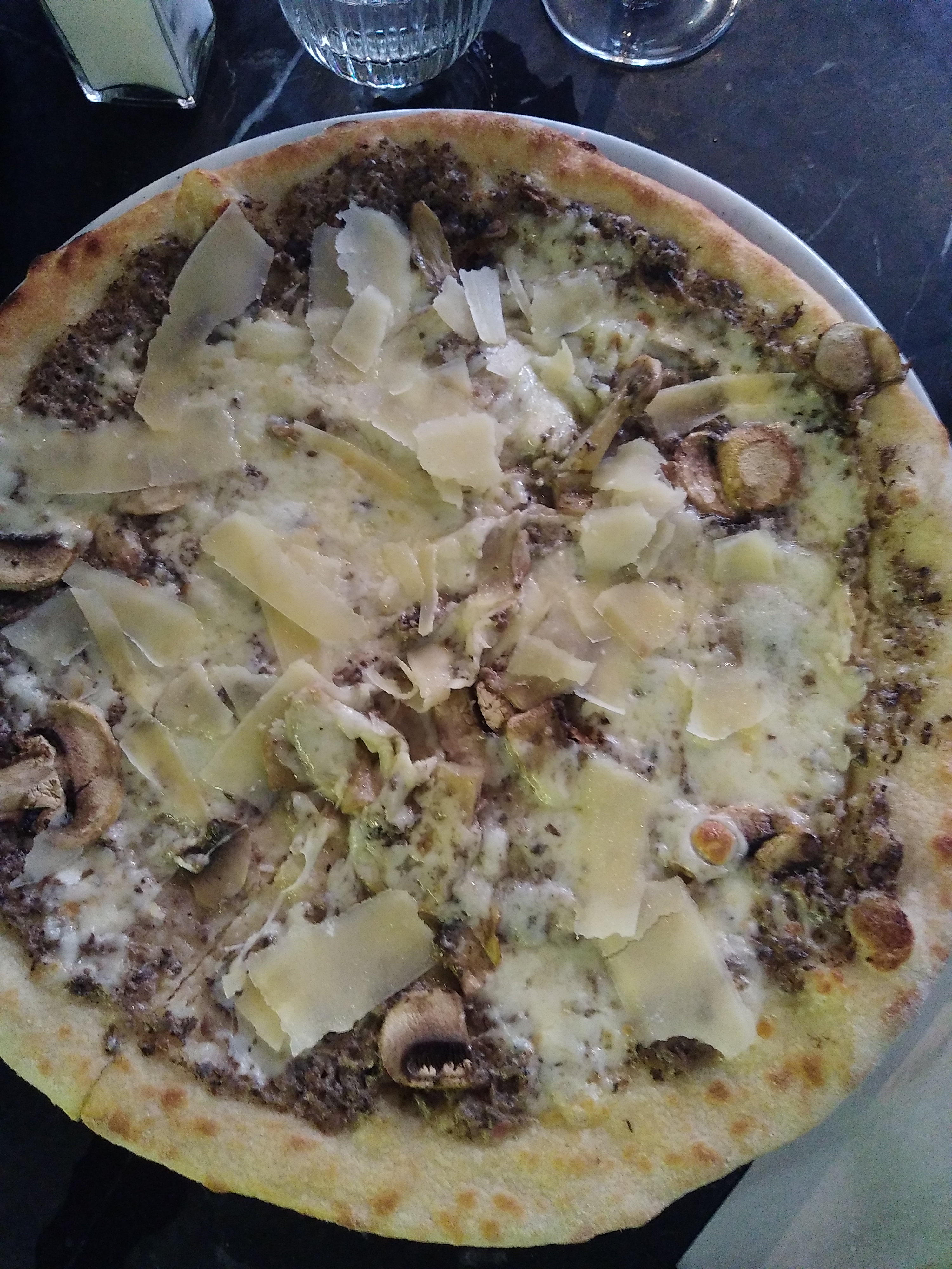 Bon accueil, pizza délicieuse (Parma et 4 fromages) dans tous les cas à notre goût de même que les pâtes à la truffe. Nous avons passé une belle soirée