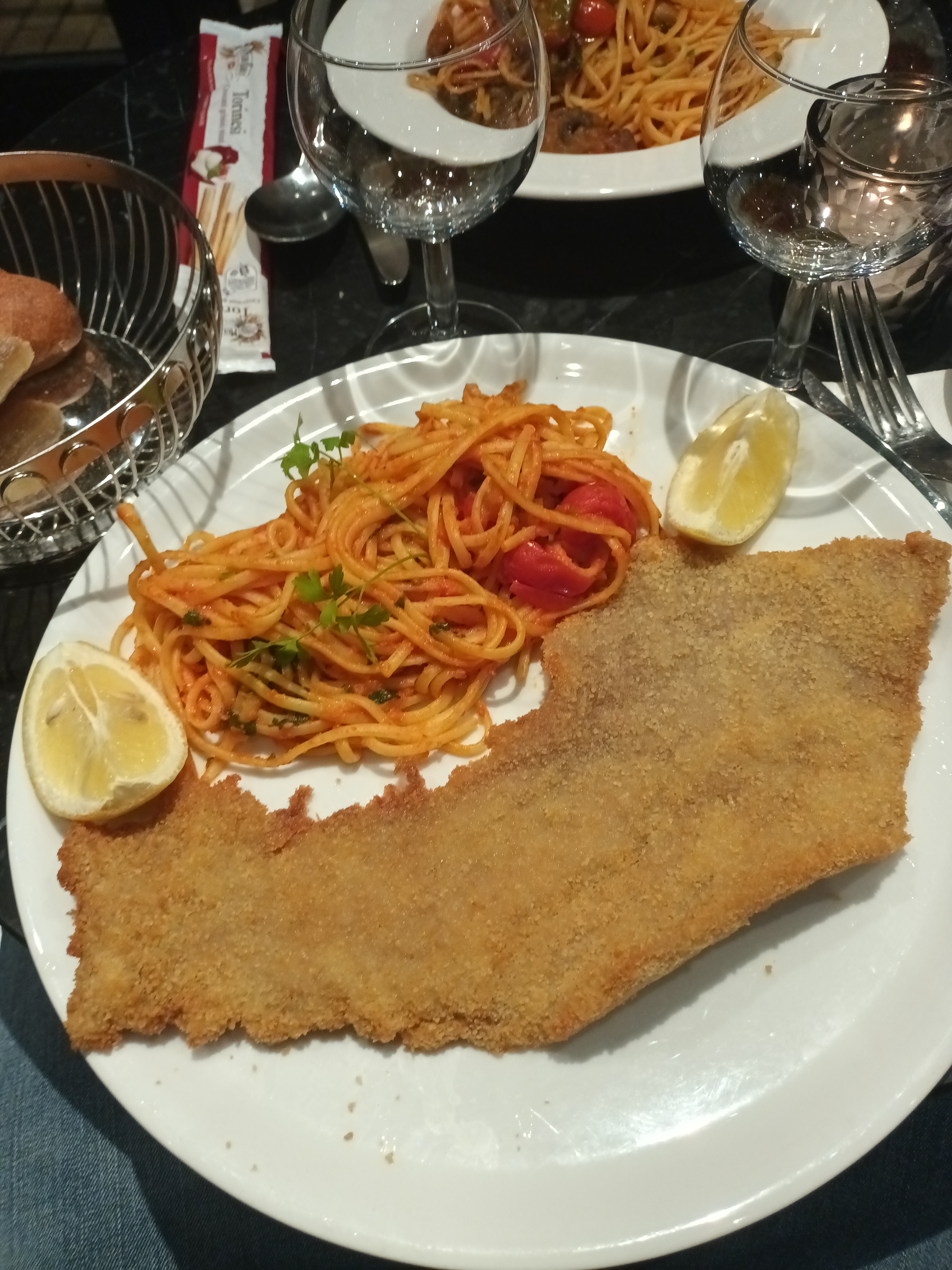 - Réservation pour 2 personnes non prise en compte à notre arrivée. - Escalope à la milanaise : escalope correcte mais pâtes trop cuites et sauce tomate fade, pas à la hauteur d'un restaurant italien. - Service rapide. - Tables minuscules ou il est difficile de manger confortablement. - Personnel sympathique, décor intimiste et classe.