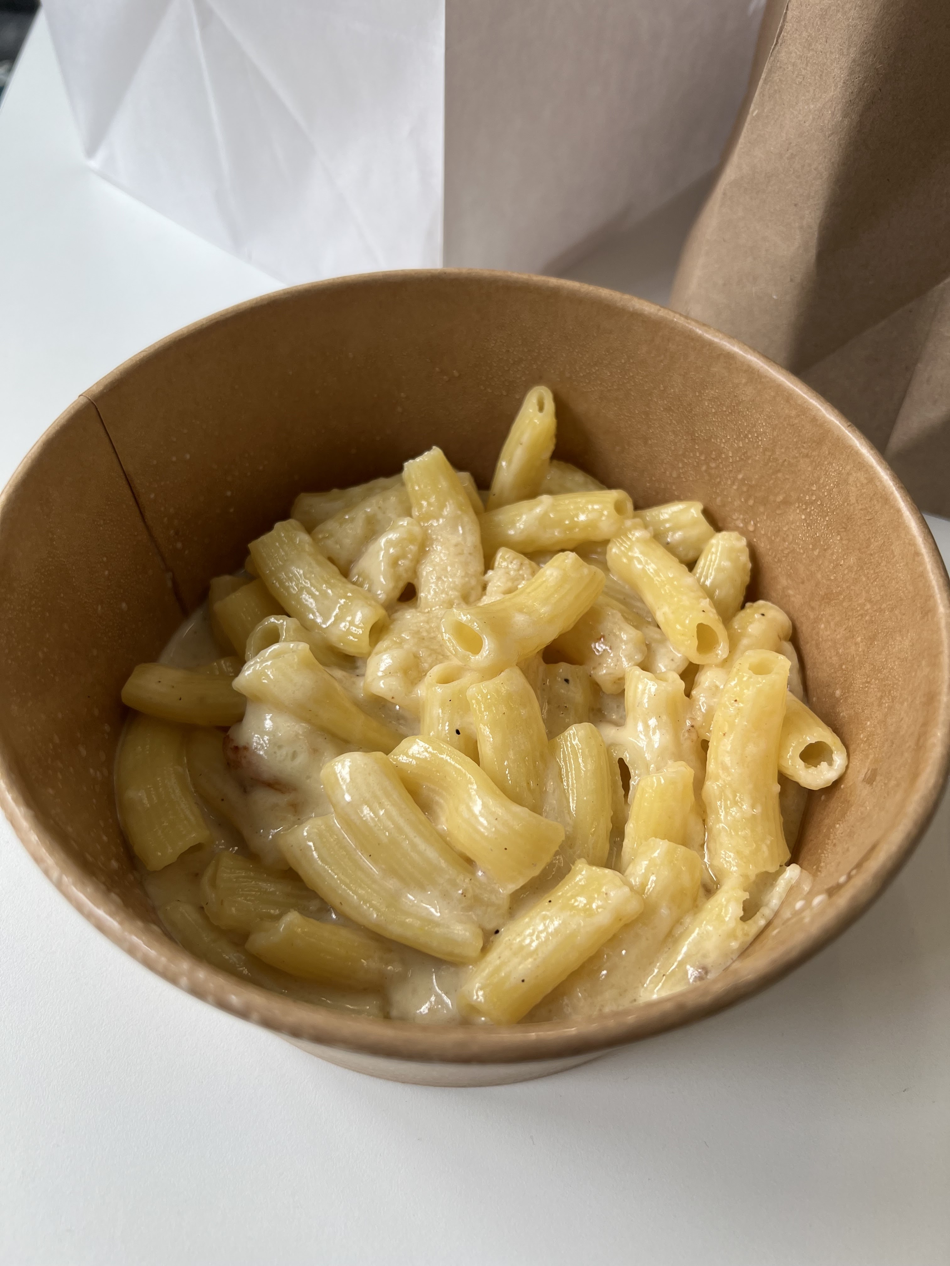 Plat emporté, j’ai pris les pâtes 4fromages. C’était bon, mais pour le prix de 15€ la quantité était très juste je trouve