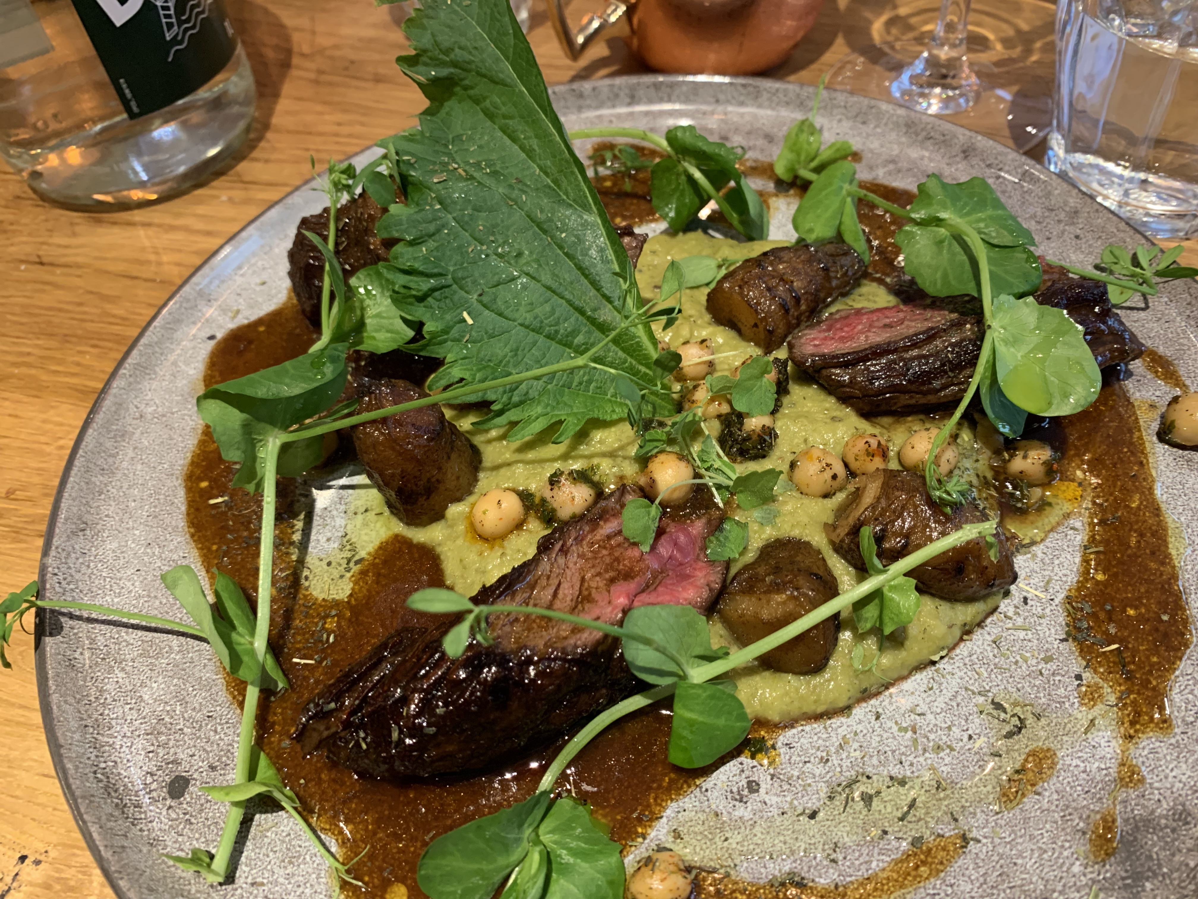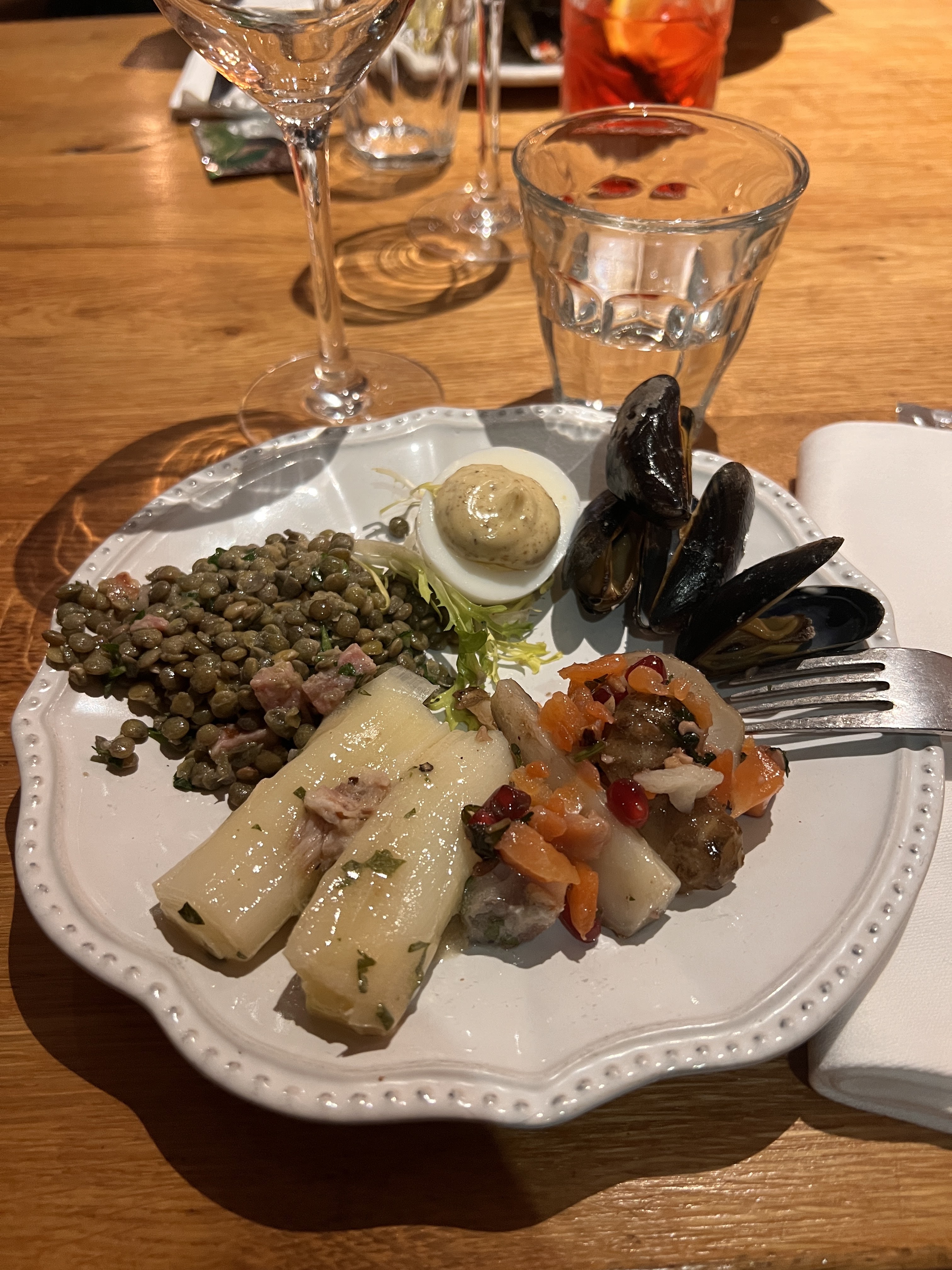 Accueil sympathique, joli restaurant, pas trop bruyant ça reste agréable. Le principe est que pour l’entrée vous ne choisissez rien, on vous apporte plusieurs tapas terre et mer. C’est bon. Les plats sont bons aussi, la viande est cuite comme il faut, surtout le veau. Je recommande moins les cocktails, le Hugo spritz n´était vraiment pas bon.