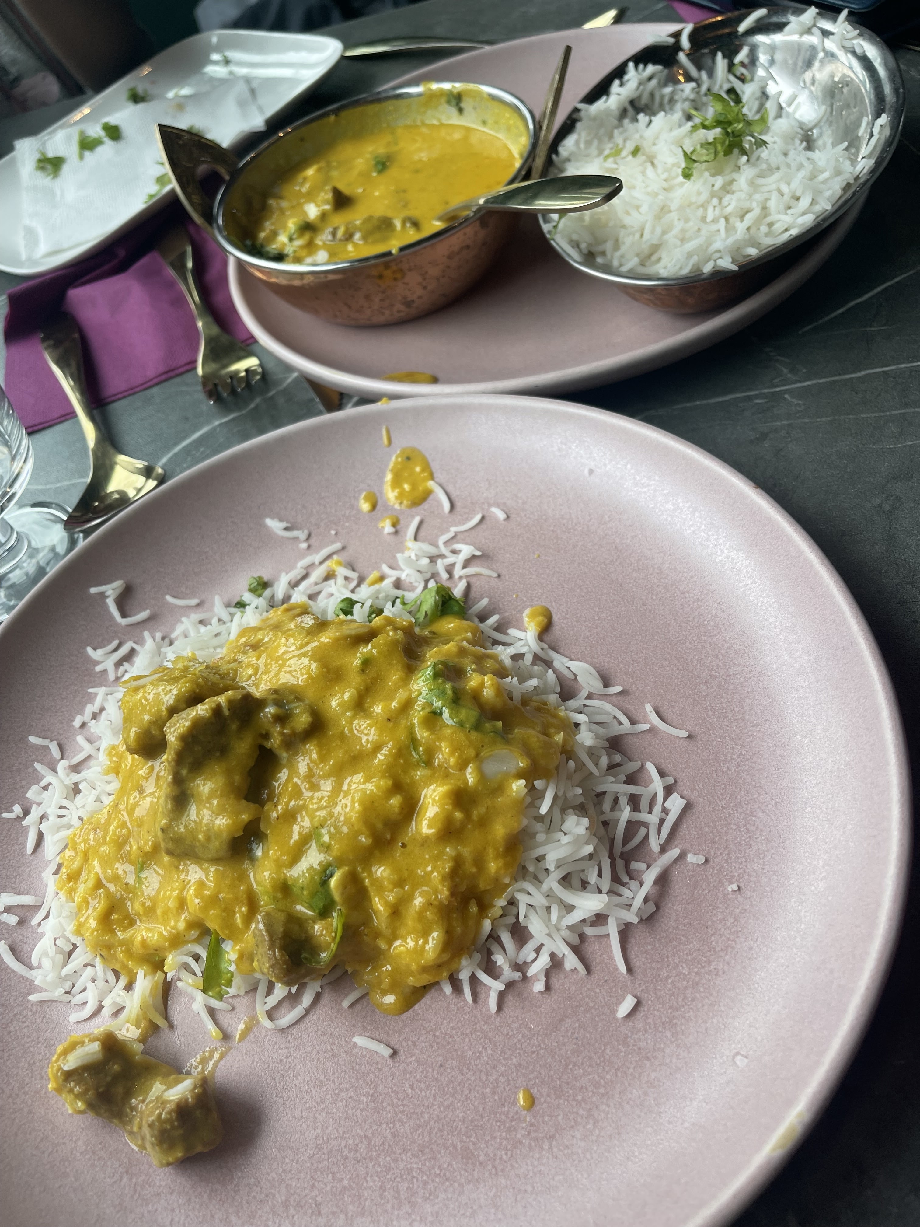 Première fois qu’on vient, l’accueil est impeccable ! J’ai pris du poulet sauce korma avec du riz c’était super bon !