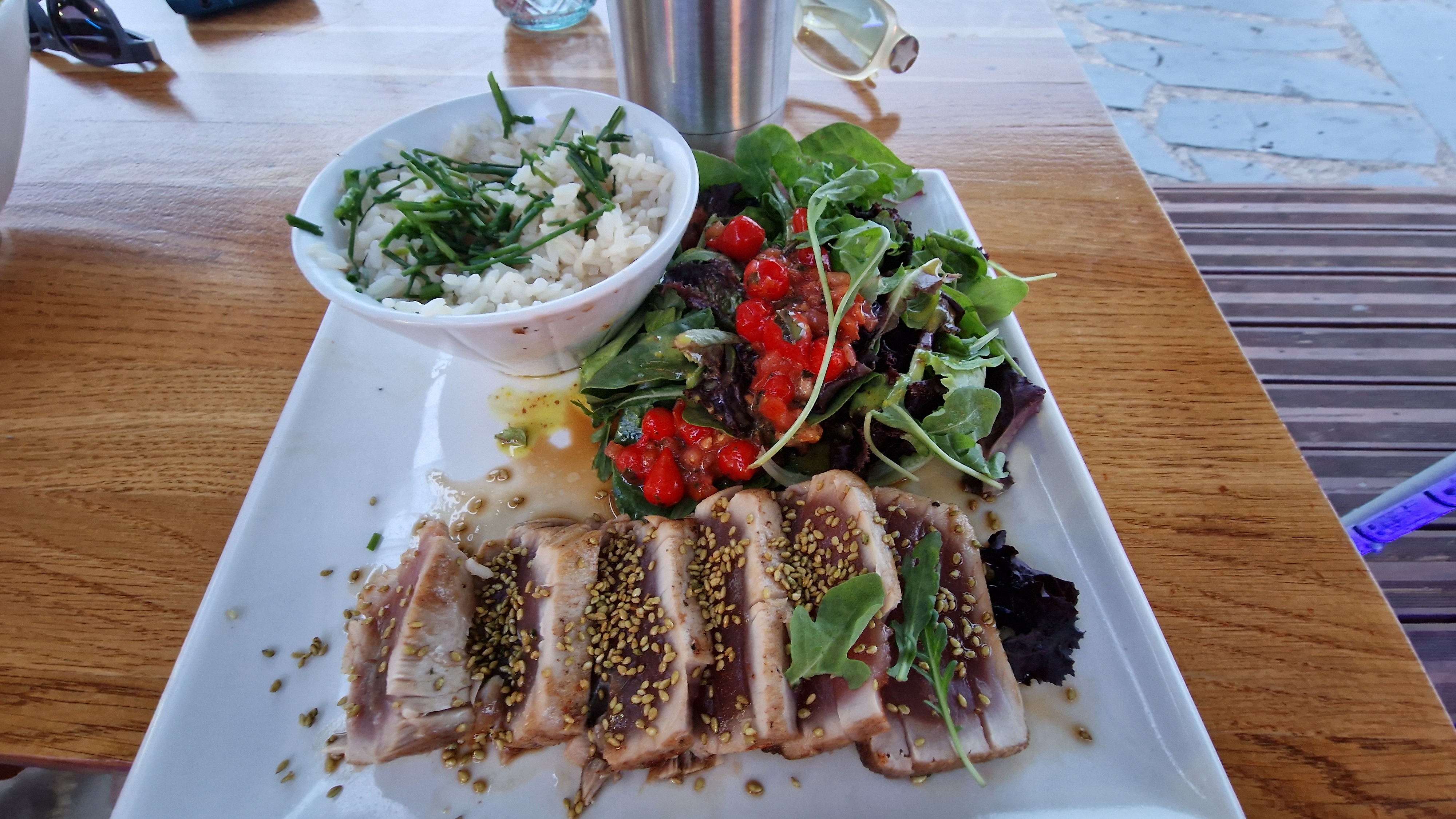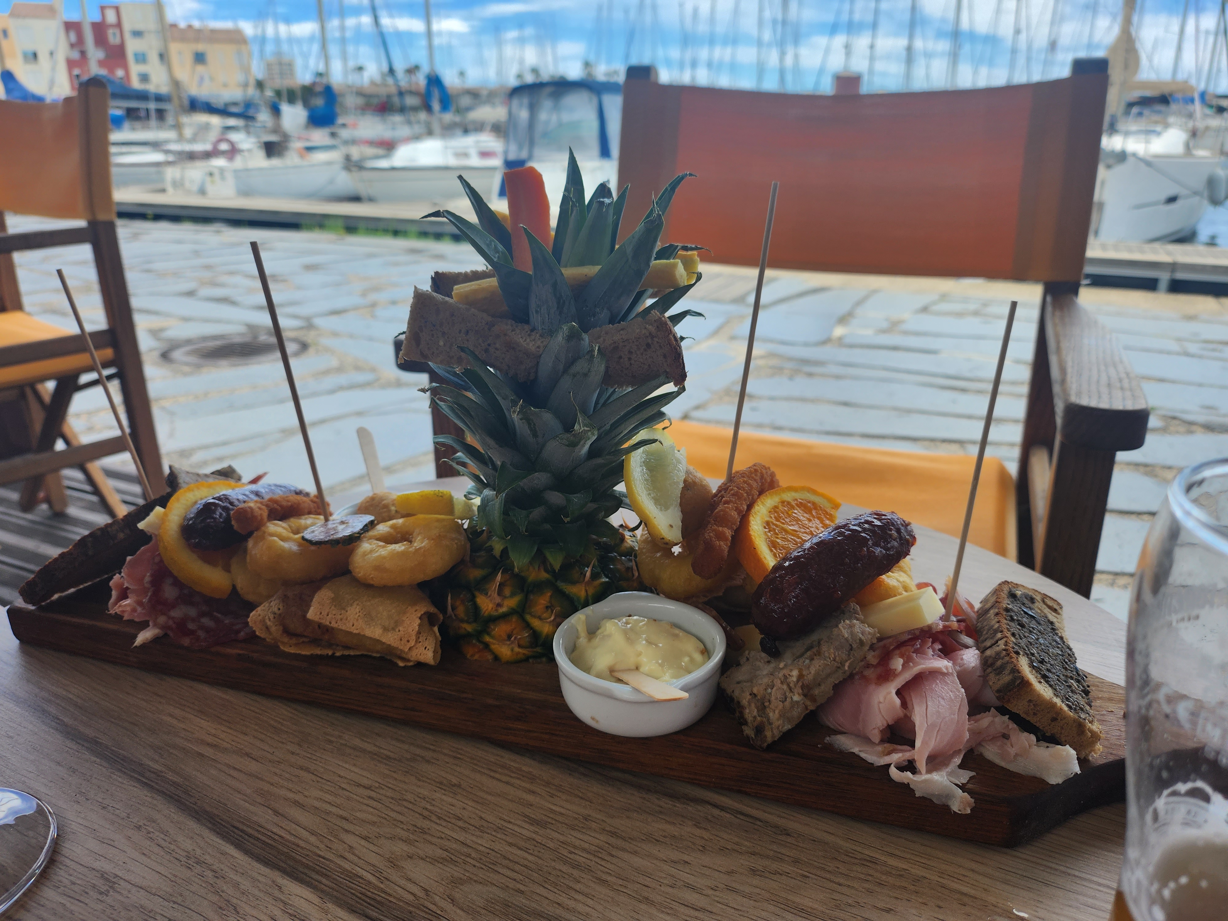 Petit coin de paradis au port avec la vue sur le bateau. Cocktail excellent (lune de miel) et salade généreuse (caesar).