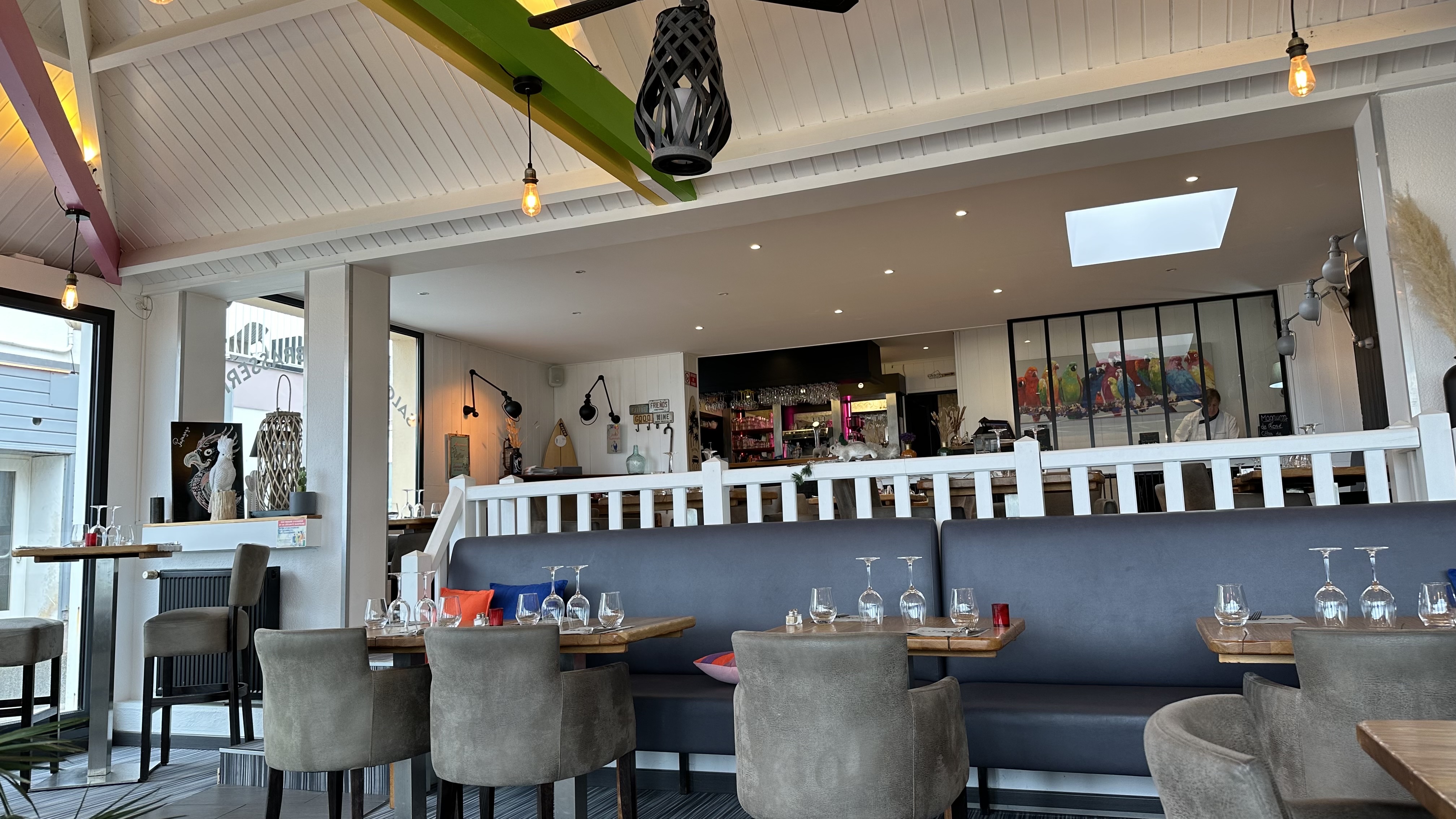 Restaurant face à la mer avec une superbe vue. Nous étions très bien placé en hauteur, la vue est meilleure qu’en bas. La décoration est aussi vive que son personnel. Ils sont souriants et performants. Les plats sont excellents, nous avons apprécié les cromesquis de camembert une belle découverte, la pièce du boucher est fondante en bouche, une sauce camembert que j’ai rarement goûté. Une réussite nous reviendrons avec plaisir