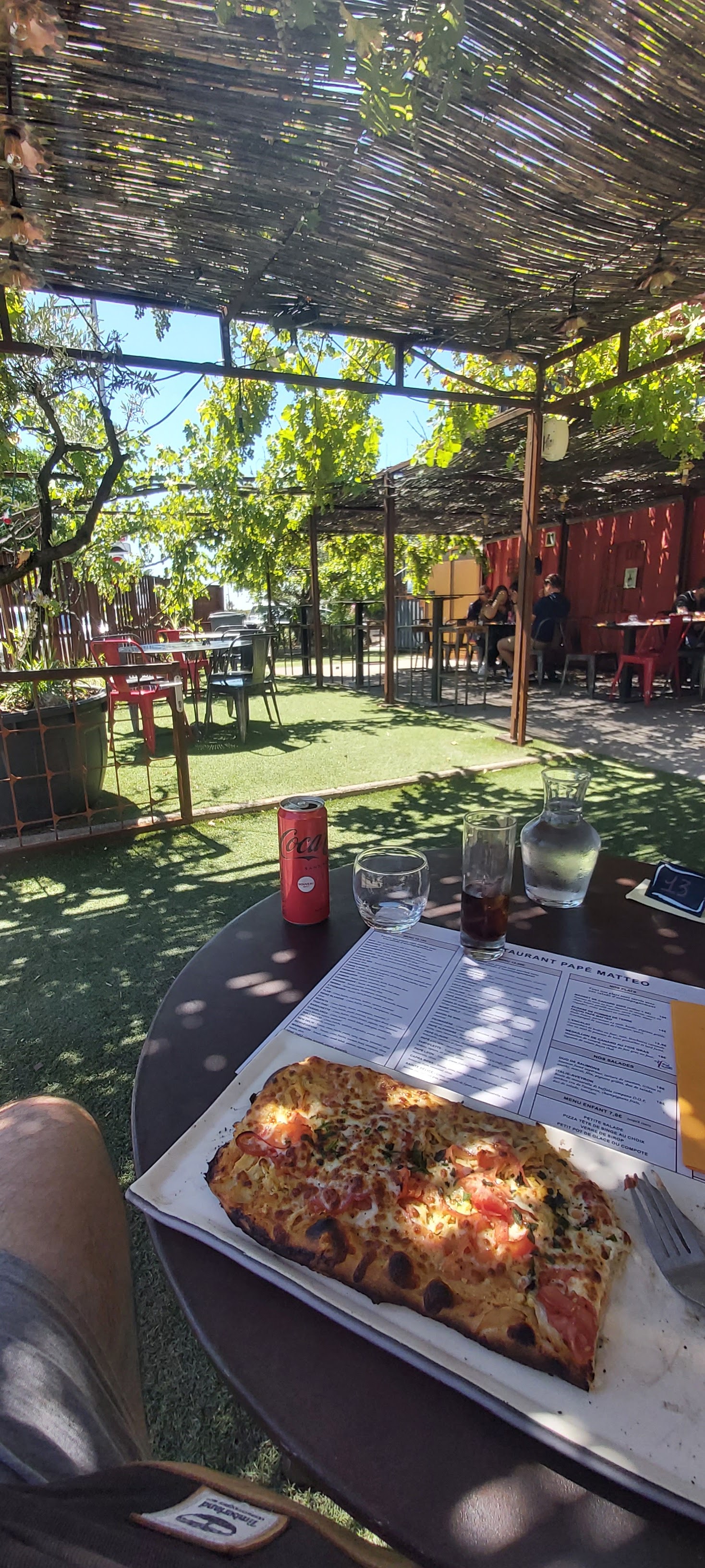 Le site n'est pas extraordinaire, mais je le préfère à celui de Gignac qui est sur un trottoir et qui a comme décor en face, des enseignes lumineuses, des magasins et des voitures qui passent (pizzas très bonnes). Les formules pizzas salades sont très bien qui se situent entre 12 et 14 euros, la présentation de l'assiete à salade est très bien et les jeunes serveuses, sont mimi comme tous. Merci aux pizzaiolos qui nous ont fait de très bonnes pizzas. Un truc cool, les souches de vignes qui montent sur la pergola avec les grappes de raisins qui retombent, ce qui fait qu'au passage, vous grappillez du raisin. je passe à un petit point négatif, il serait bien de passer un coup d'aspirateur sur la fausse pelouse.