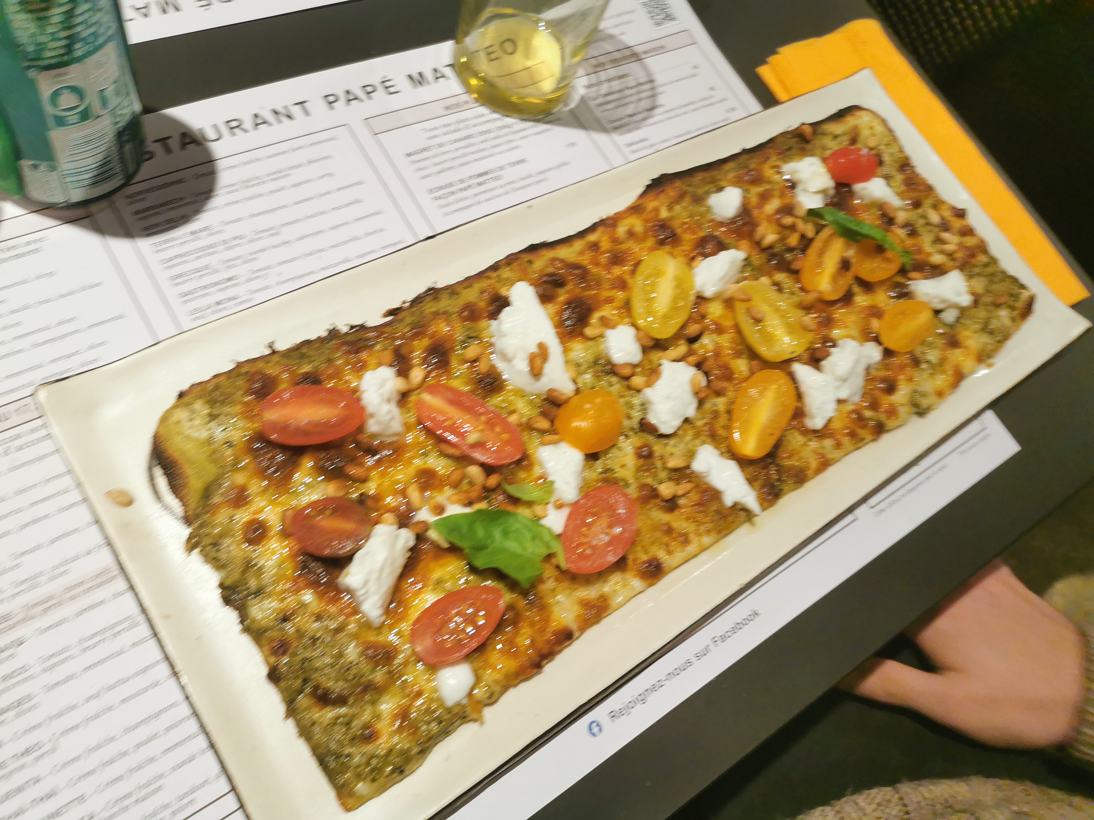 Très bonnes pizzas, dans un format « papyrus « .( Comprendre des rectangles très allongés). Une salade d’accueil servi avec toutes les pizzas. Des accords sucrés salés parfait. Un espace réservé pour les enfants avec des livres et de jeux pour leur permettre de patienter jusqu’au service. Attente courte car le service est rapide.