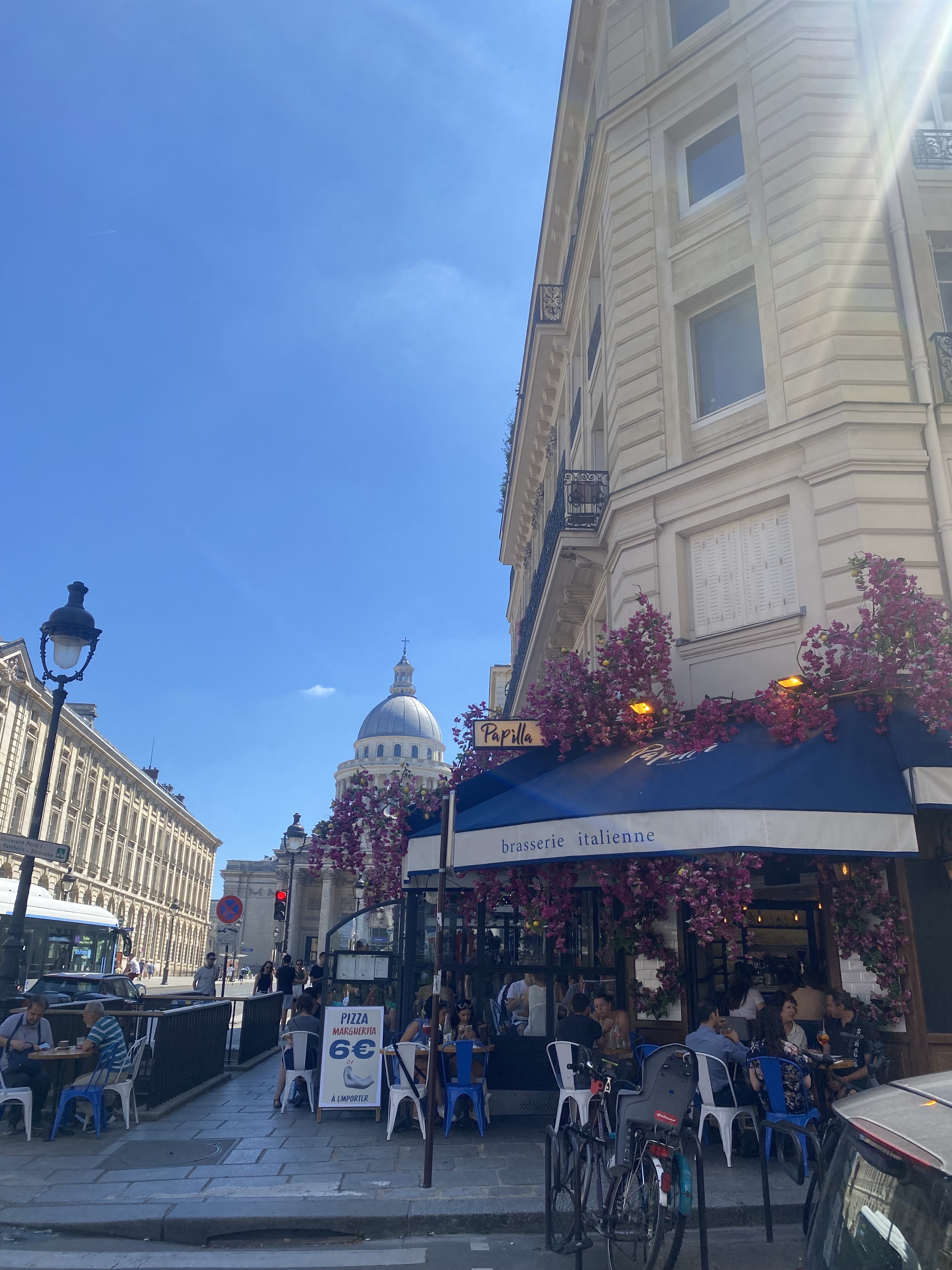 Nous sommes tombés par hasard sur ce restaurant qui a attiré notre œil par sa devanture fleurie et colorée. Les plats sont tous très bons, nous avions commandés la salade cesar, la pizza du moment et les pâtes à la truffe. La décoration du restaurant et très joli, et la terrasse offre une vue sur le panthéon d’un côté, et sur la Tour Eiffel de l’autre. Le serveur que nous avons eu était vraiment très aimable. Nous avons passés un très bon moment et reviendrons sûrement !