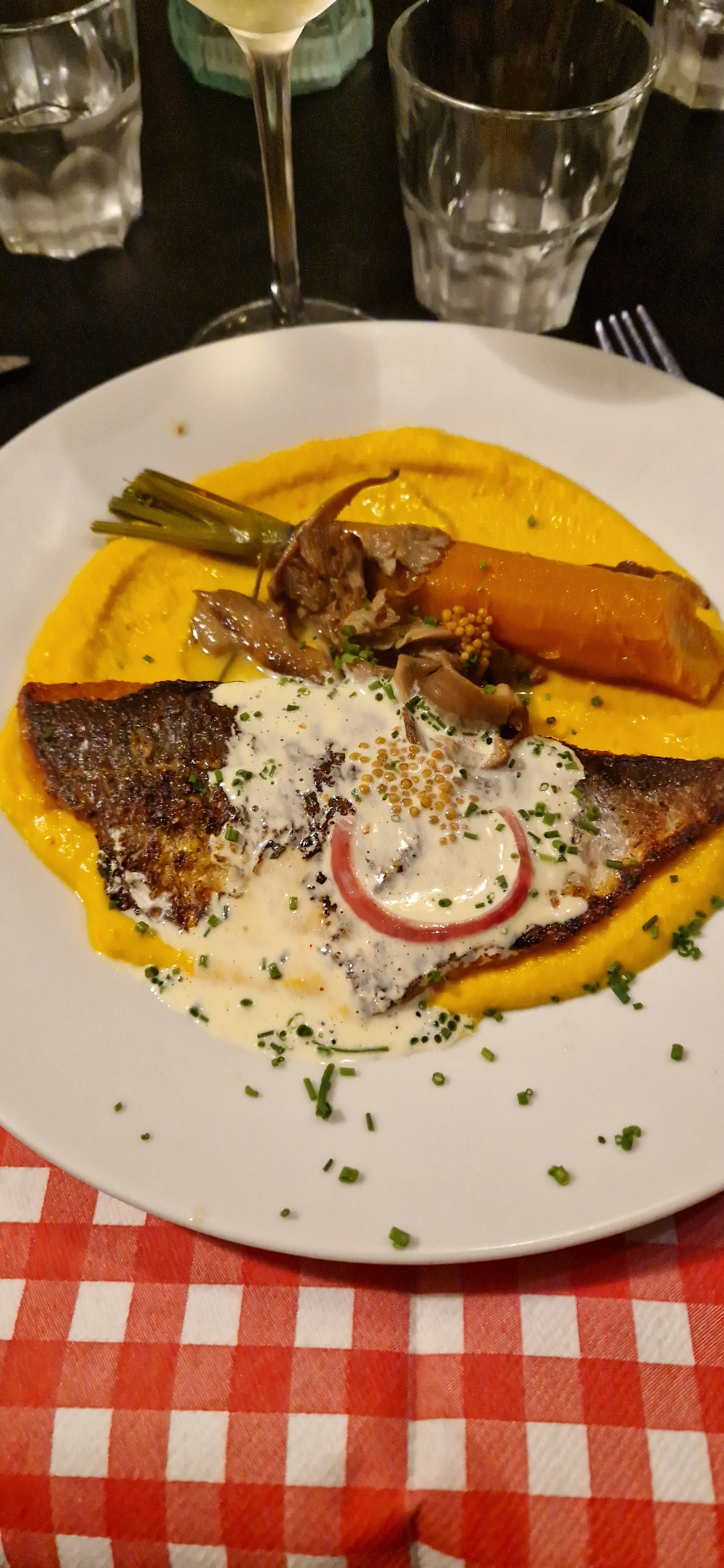 Équipe jeune sympathique et dynamique ,poisson cuit à la perfection , terrine de lapin inoubliable ajouter à cela une déco rétro vintage (allez au toilette ! 😅) Bref une soirée épatante !
