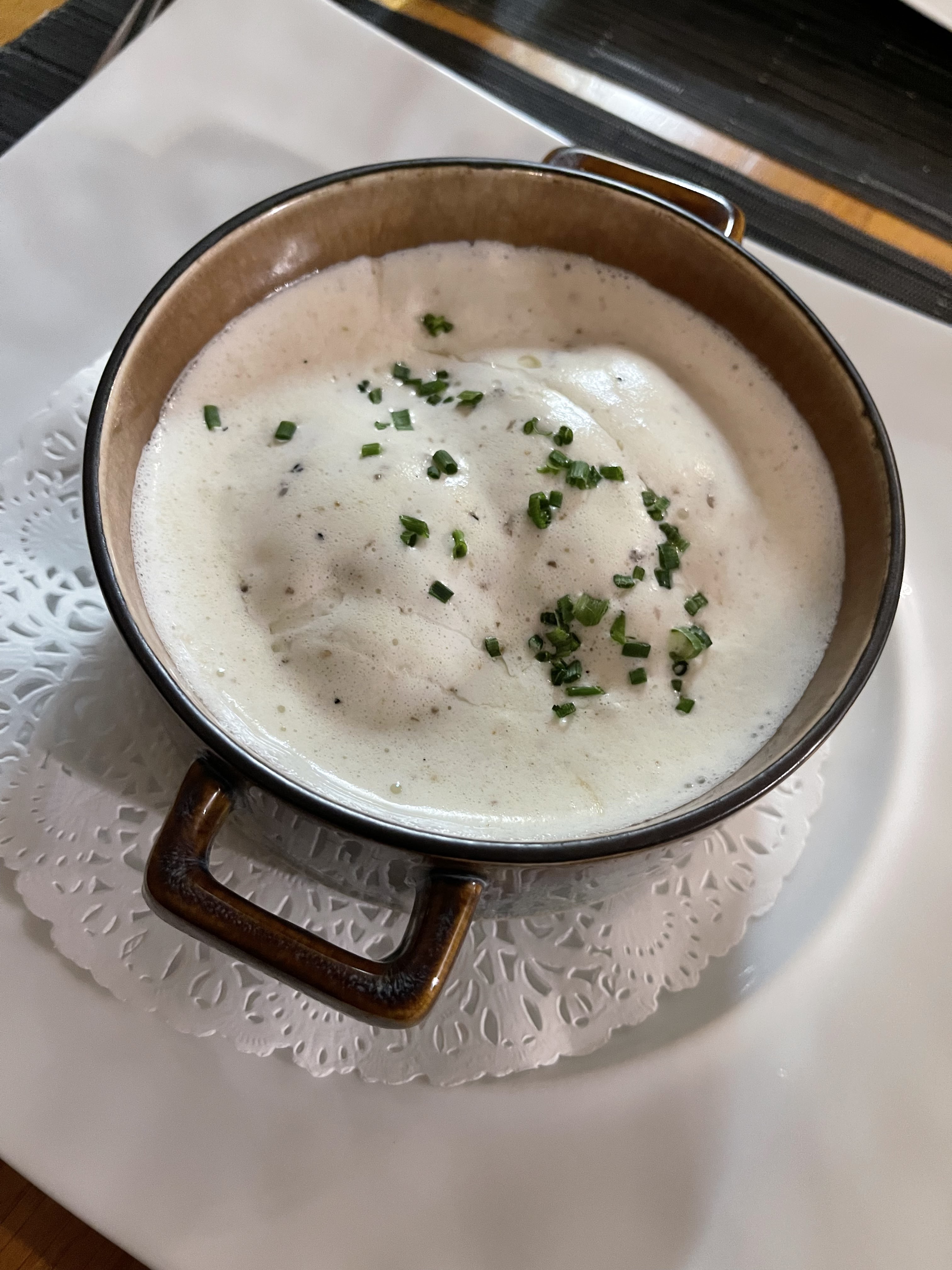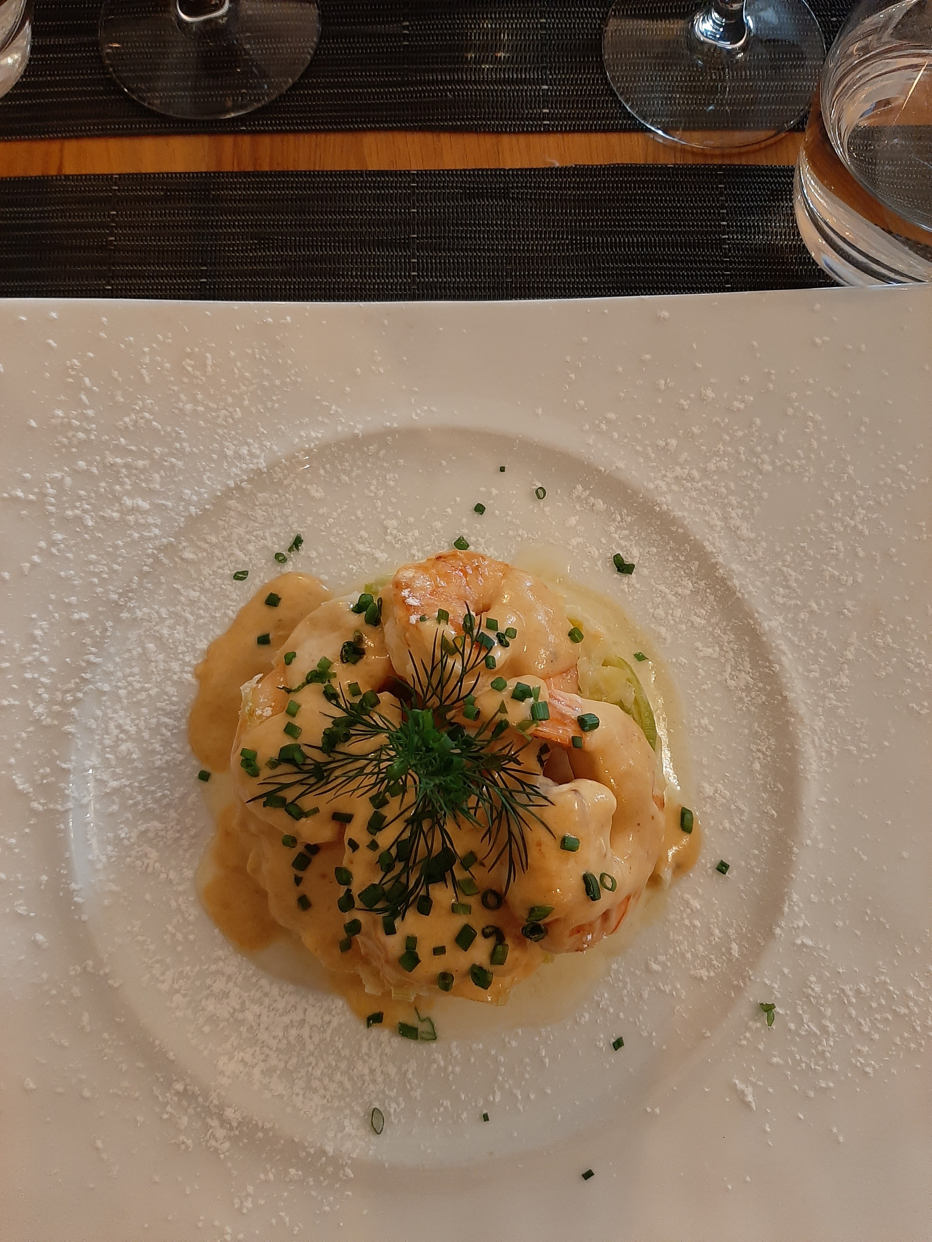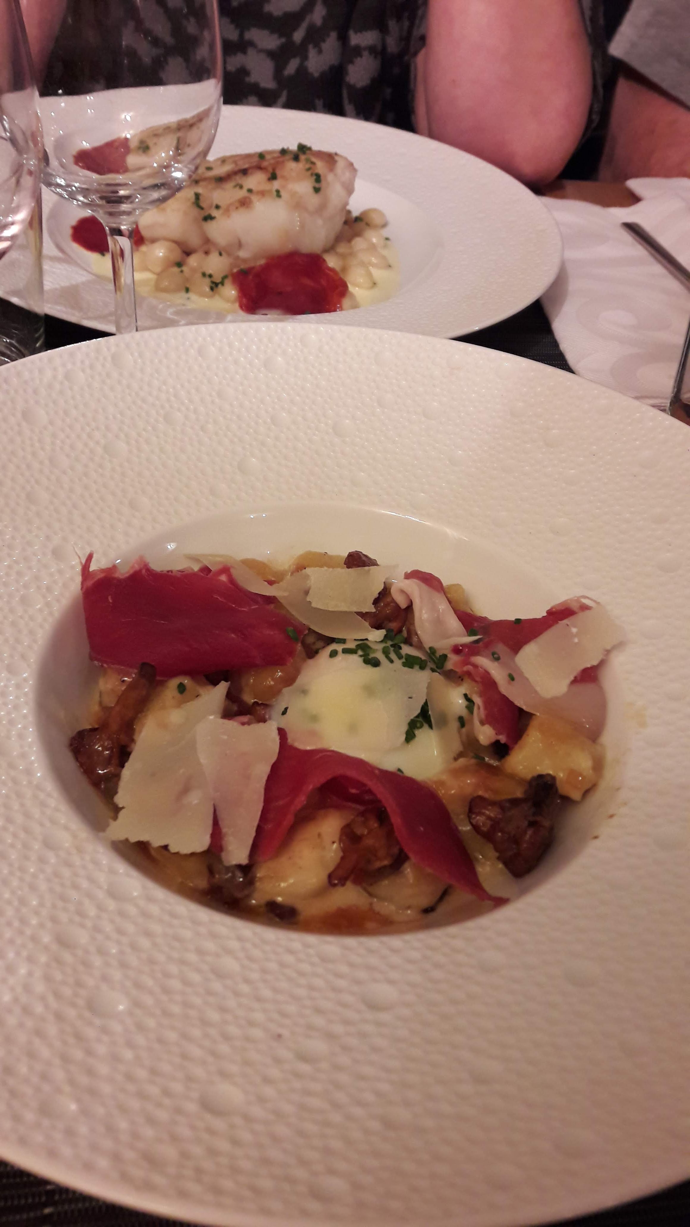 J’ai pris en entrée un tartare de saumon aux truffes Puis des pennes aux gambas et en dessert un chou citron meringué. Vraiment extra. Chaque plat était super. Le service impeccable et très sympa. 60€ par pers. Grand merci !