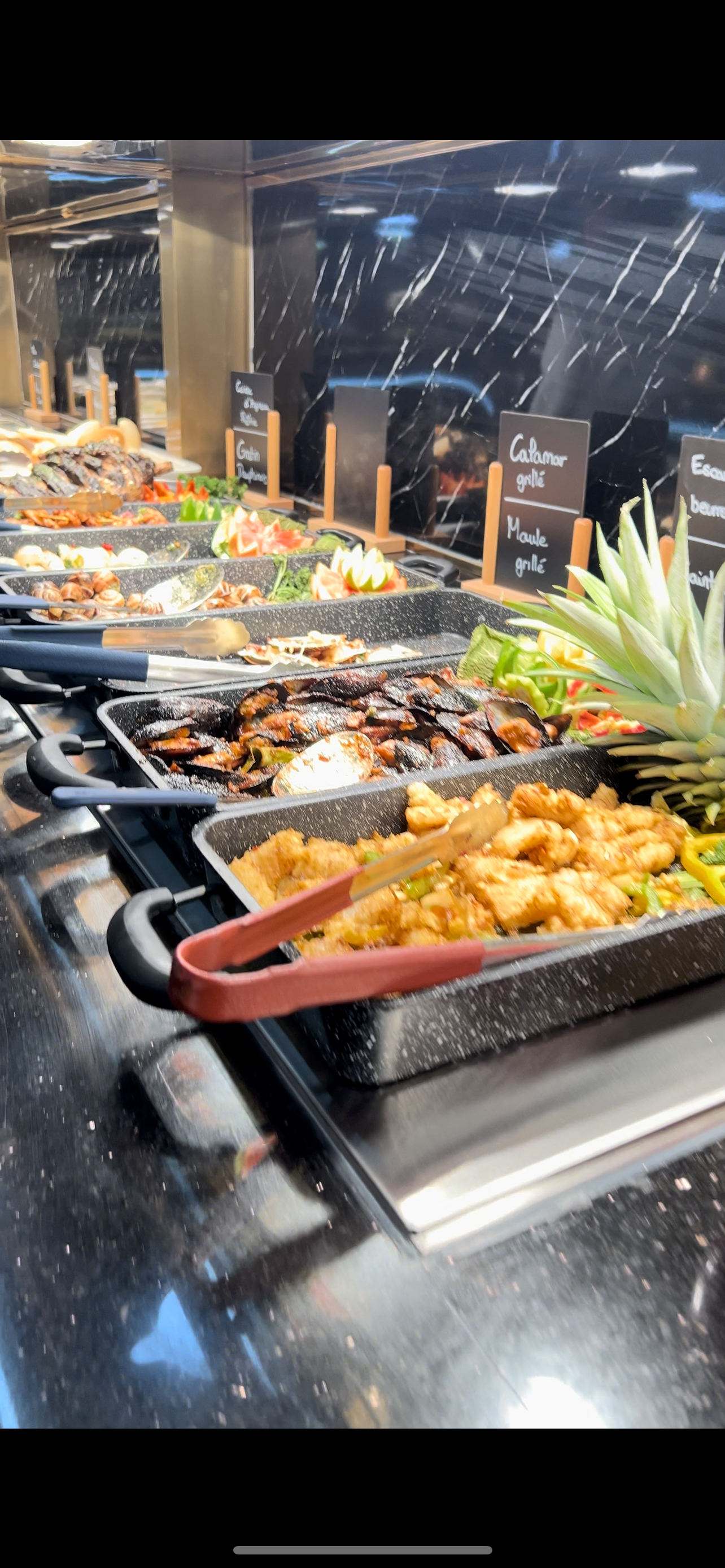 Magnifique décor, un choix énorme au bar à sushi, très bon et originaux. Les fruits de mer sont super frais, le coin asiatique délicieux et de qualité. Idem pour le coin indien. Mention spécial pour le stand à Naan et cheese Naan, fabriqué devant nous dans un four traditionnel. Pleins de choix de fruits et desserts également. Le meilleur buffet à volonté d’Ile de France