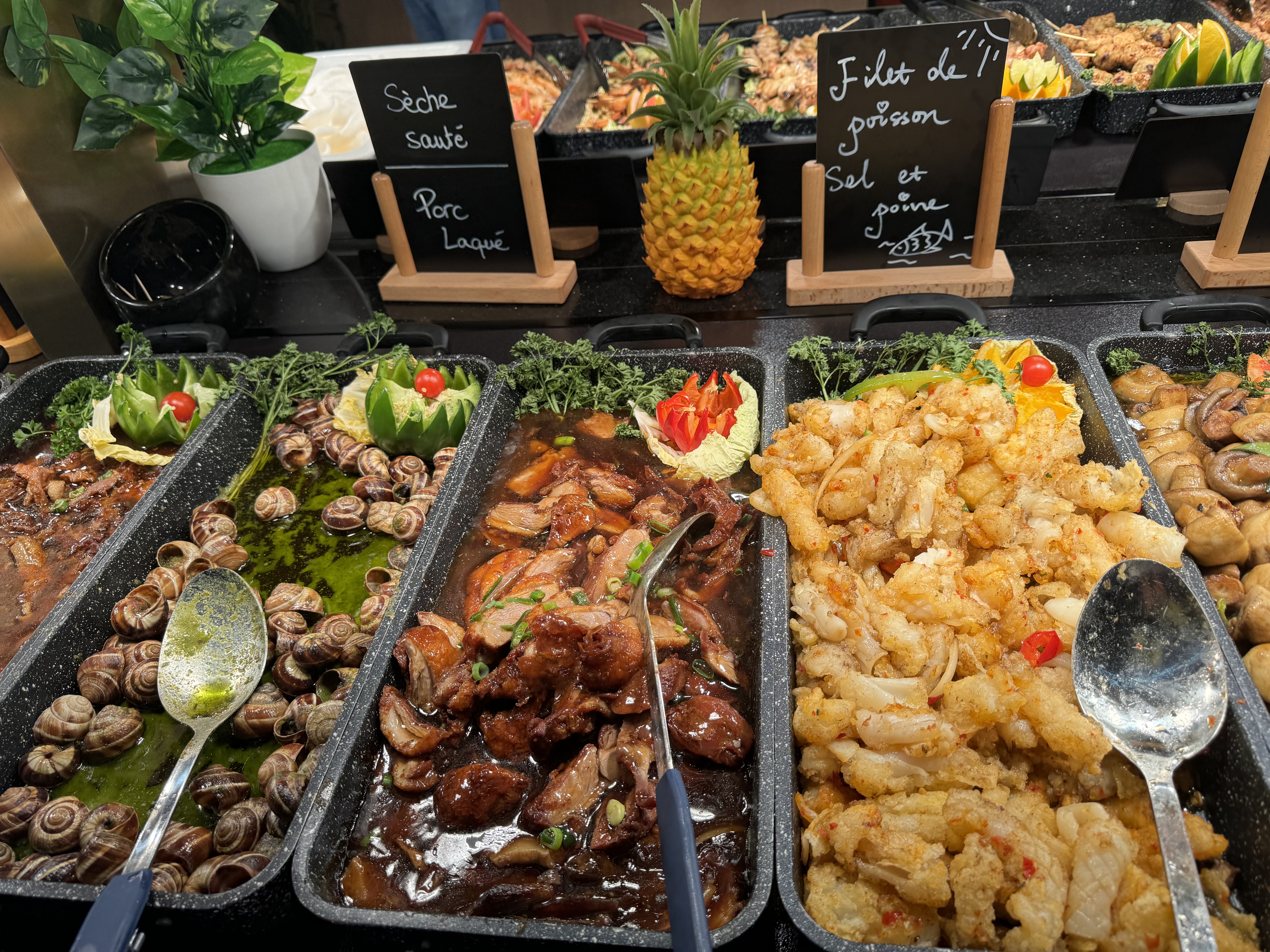 Wowwww A faire et à refaire ! !!! Buffet à volonté asiatique (makis, sushis, wok, plats type traiteur...) mais aussi indien, pizzeria, entrée française (crudités, foi gras, fruits de mer), des grillades, des poissons, des fromages et desserts de ouffff Bref.... A faire et à refaire!!! ;)