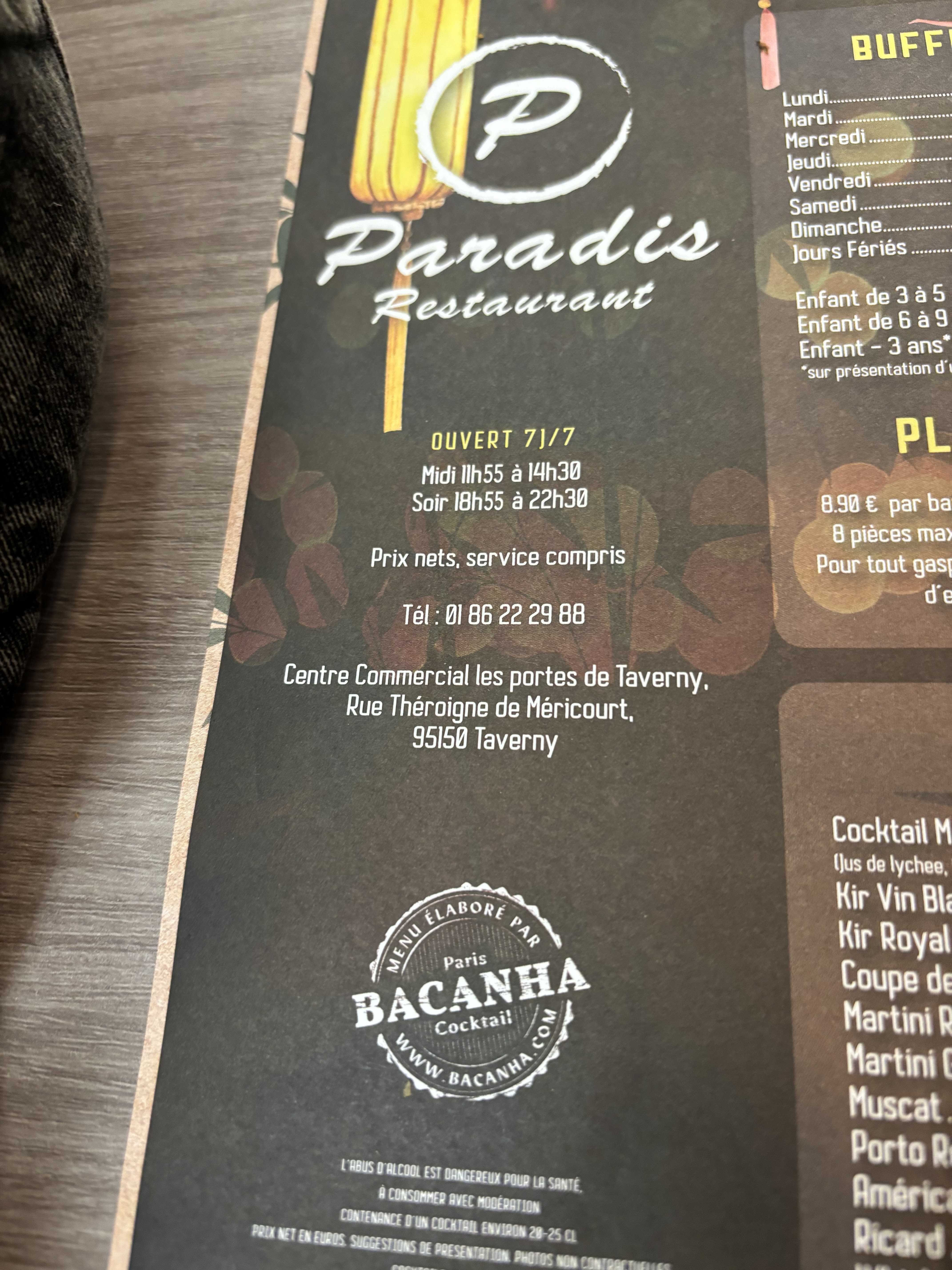 Fraîchement ouvert depuis le 1er Mars 2024, implanté aux Portes de Taverny. Ce restaurant de buffet à volonté surfe comme ses concurrents sur le même concept d'un large choix de plats: pizza, sushis, fruits de mer, entrées froides, grillades, plats cuisinés, etc...pour satisfaire le plus grand nombre. Pour faire encore mieux et encore plus que ses concurrents, celui-ci se démarque par une offre ultra impressionnante de superbes suhis très variés, des cheese naans préparés dans les règles de l'art, une multitude de verrines de desserts aussi beaux que gourmands et une machine de glace a l'italienne en libre service. La déco est très soignée et recherchée avec des petits salons, des cottages et une salle One Peace à côté de l'espace de jeux pour enfants. Pour avoir essayé beaucoup de buffets à volonté, le Paradis tient bien ses promesses d'une destination gourmande sans aucune fausse note ! En espérant qu'il saura maintenir sur la durée ce bon niveau de qualité et de propreté ! Pour l'heure, le paradis des papilles est bien aux Portes de Taverny ! Instant gourmand et effet waouh garanti ! Bravo à toute l'équipe qui d'ailleurs est très sympatique.