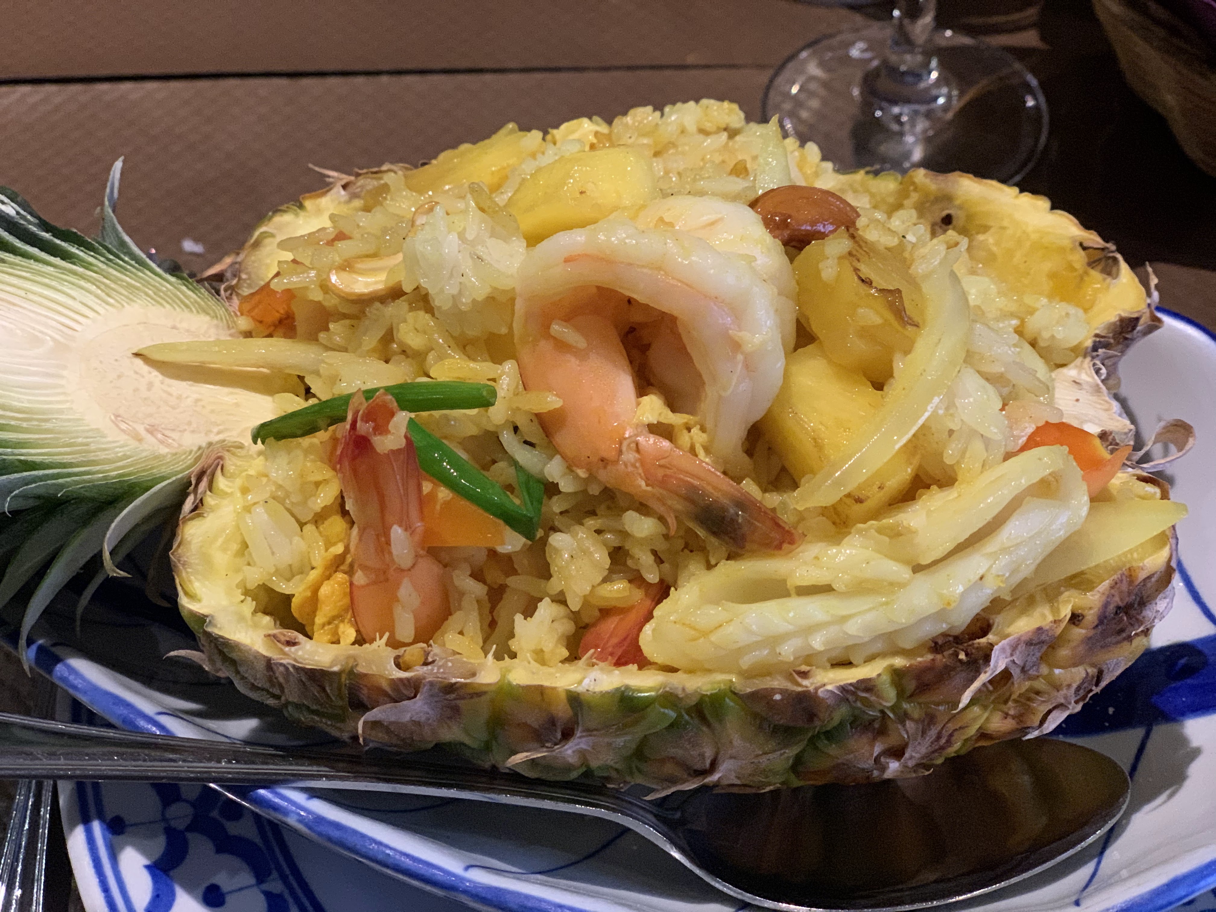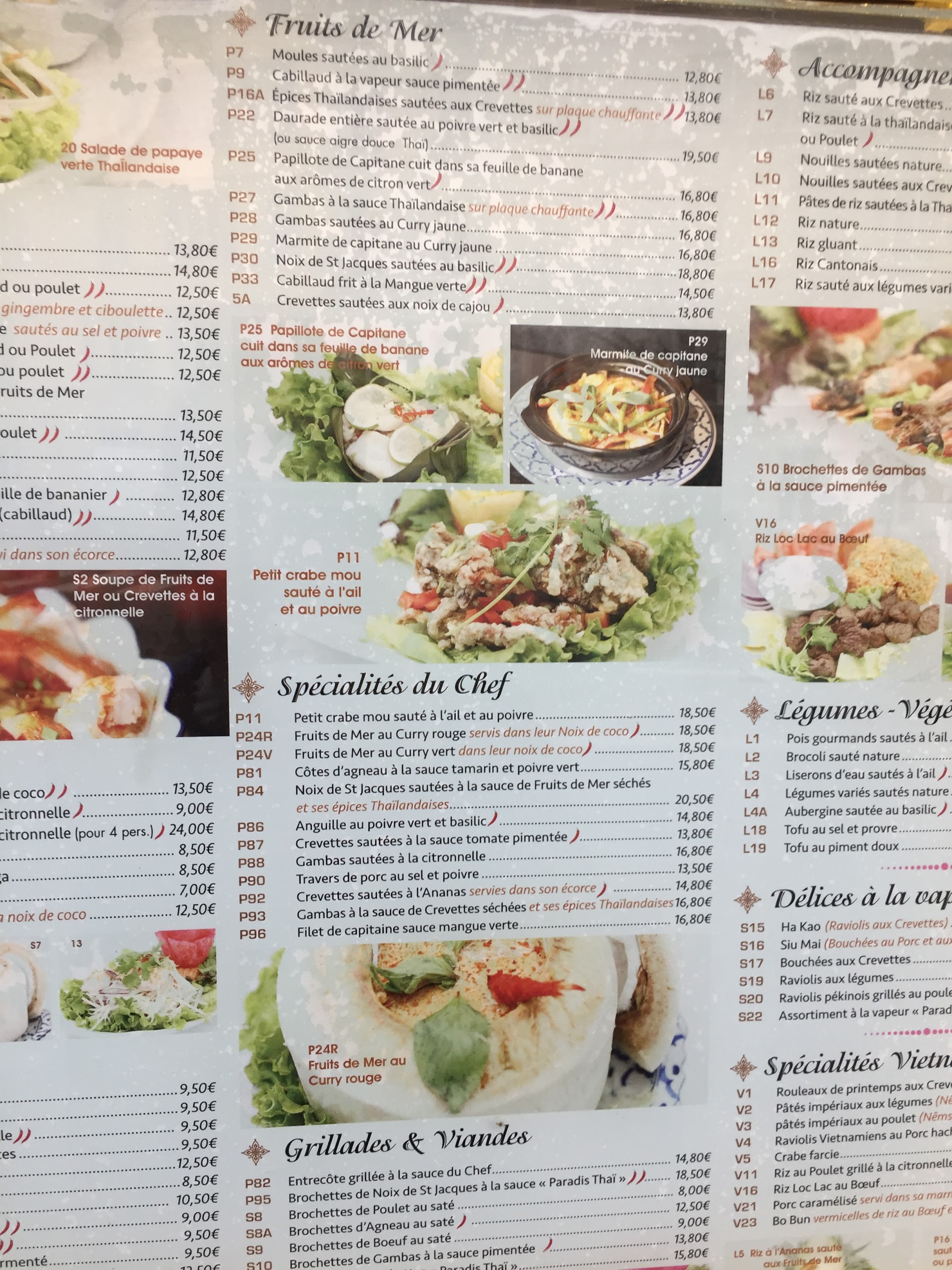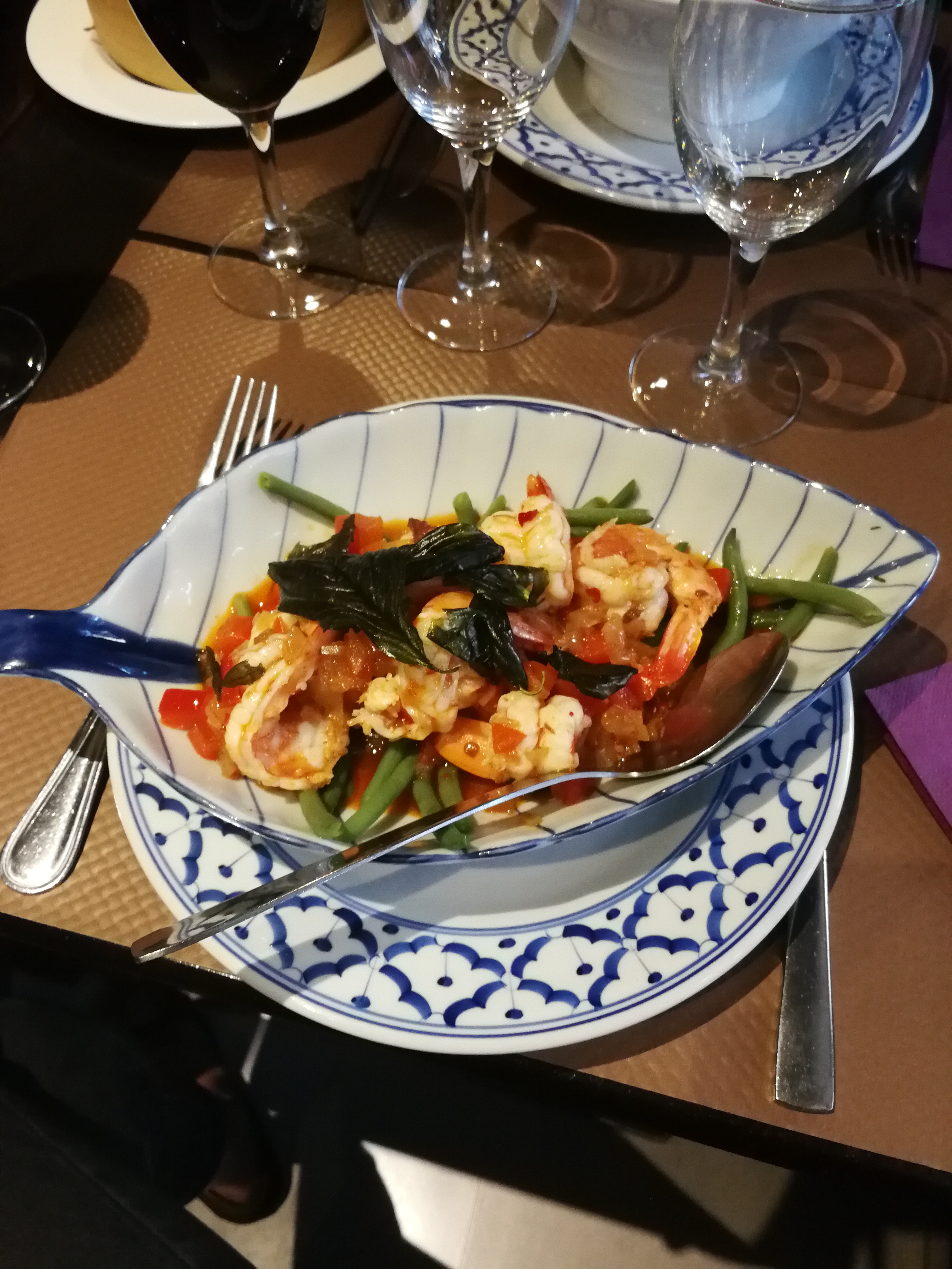 Curry rouge et jaune au légumes absolument délicieux Beignets flambés à l ananas directement sous nos yeux bon et beau Serveur a l écoute , accueillant et présent sans être envahissant Toilette propre Poissons qui nous accueillent à l entrée Cadre très sympathique On y retournera