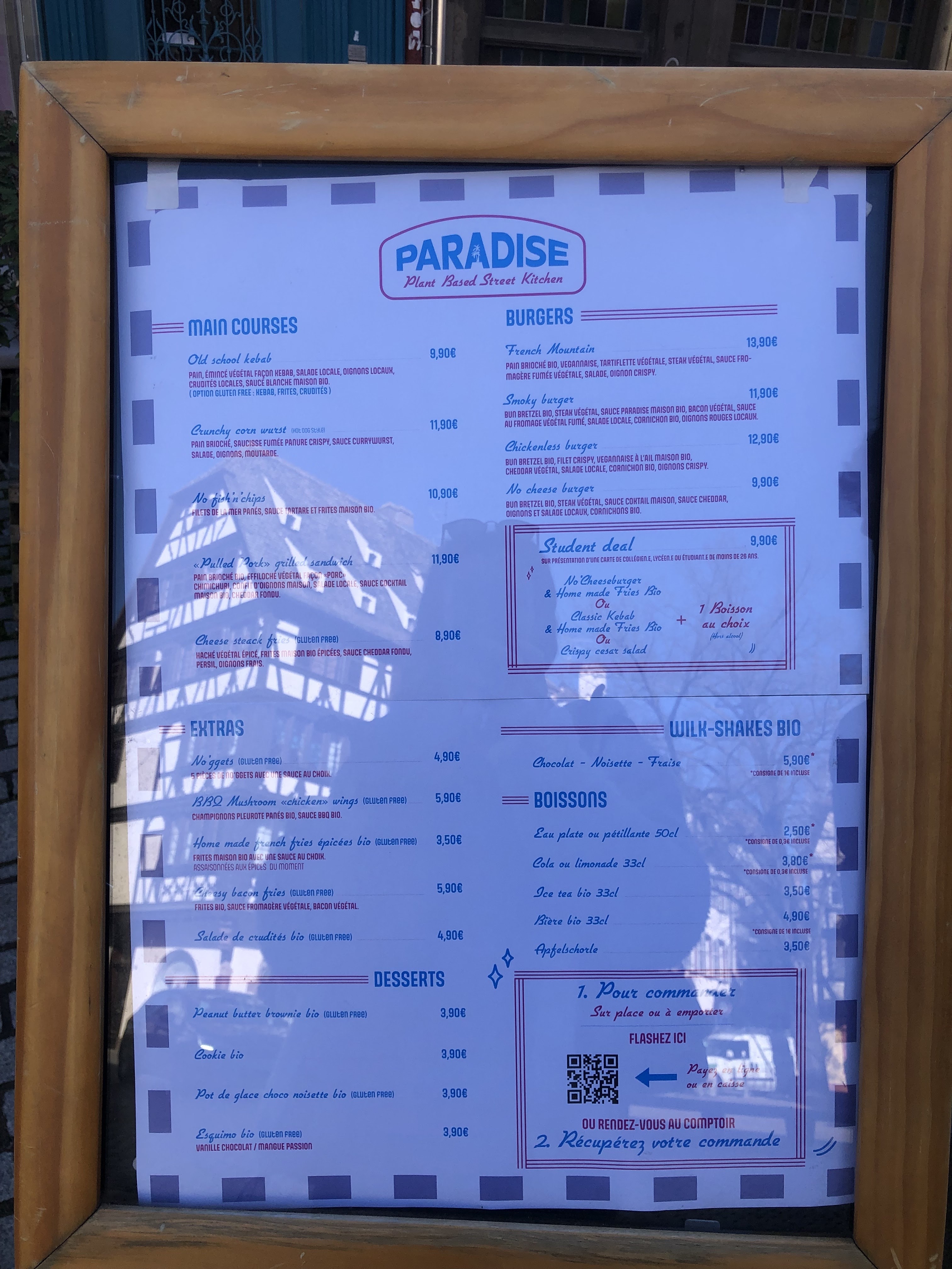 Si la nourriture est plutôt bonne, elle ne vaut pas ce prix excessif, lunaire comparé à d'autres enseignes strasbourgeoises de fast food végane ! Partout ailleurs, on proposerait un menu combiné pour moins de 15 euros : chez Paradise, on paie séparément le burger + les frites + la boisson pour environ 20 euros. Dommage ! Un restaurant 100% végane est toujours une bonne nouvelle, mais celui-ci ne fait que confirmer leur réputation d'être inaccessibles financièrement. Enfin, le service n'est ni dynamique ni souriant, et les lumières bleues/roses assez désagréables. J'irai ailleurs en attendant que ça change !