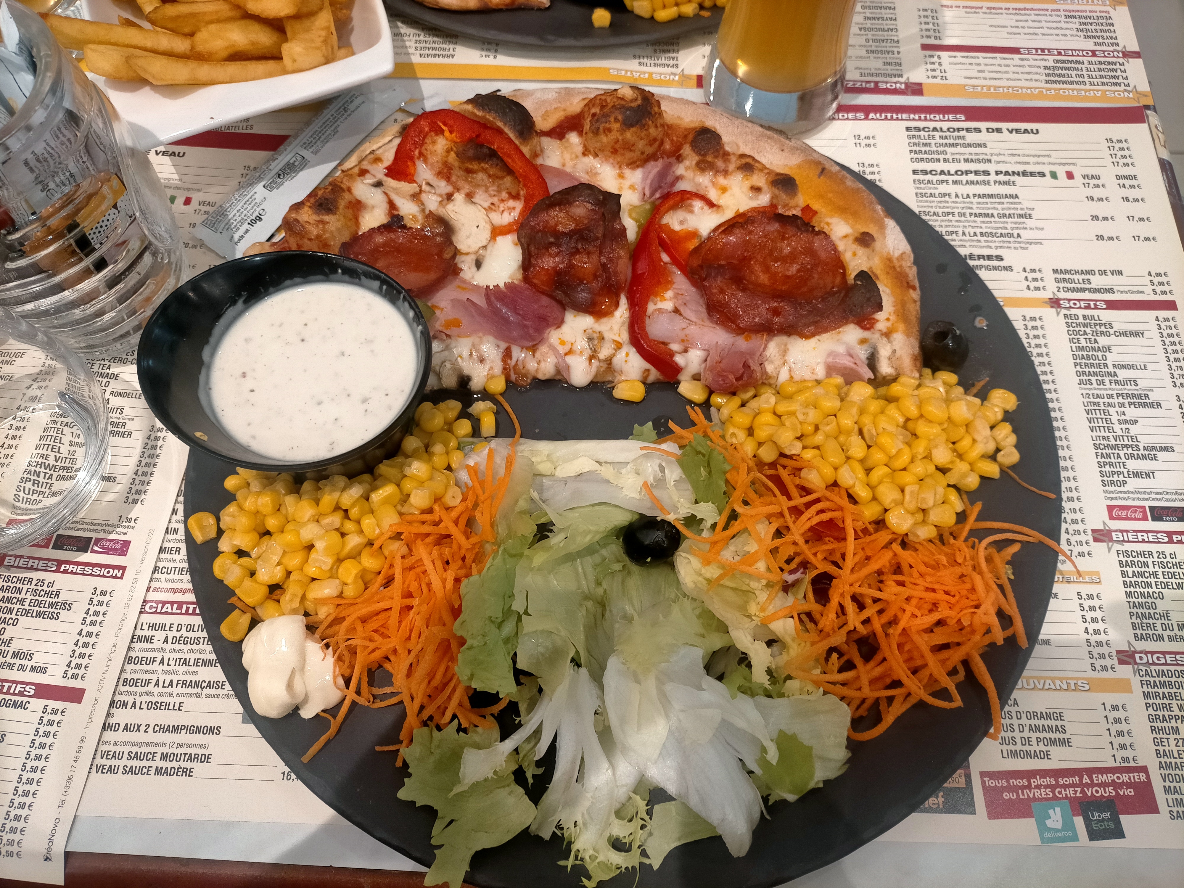 Correct sans plus, pizza noix de Saint Jacques au goût de bœuf fumé renvoyée en cuisine reçu pâtes aux (4) Scampis à la place ...