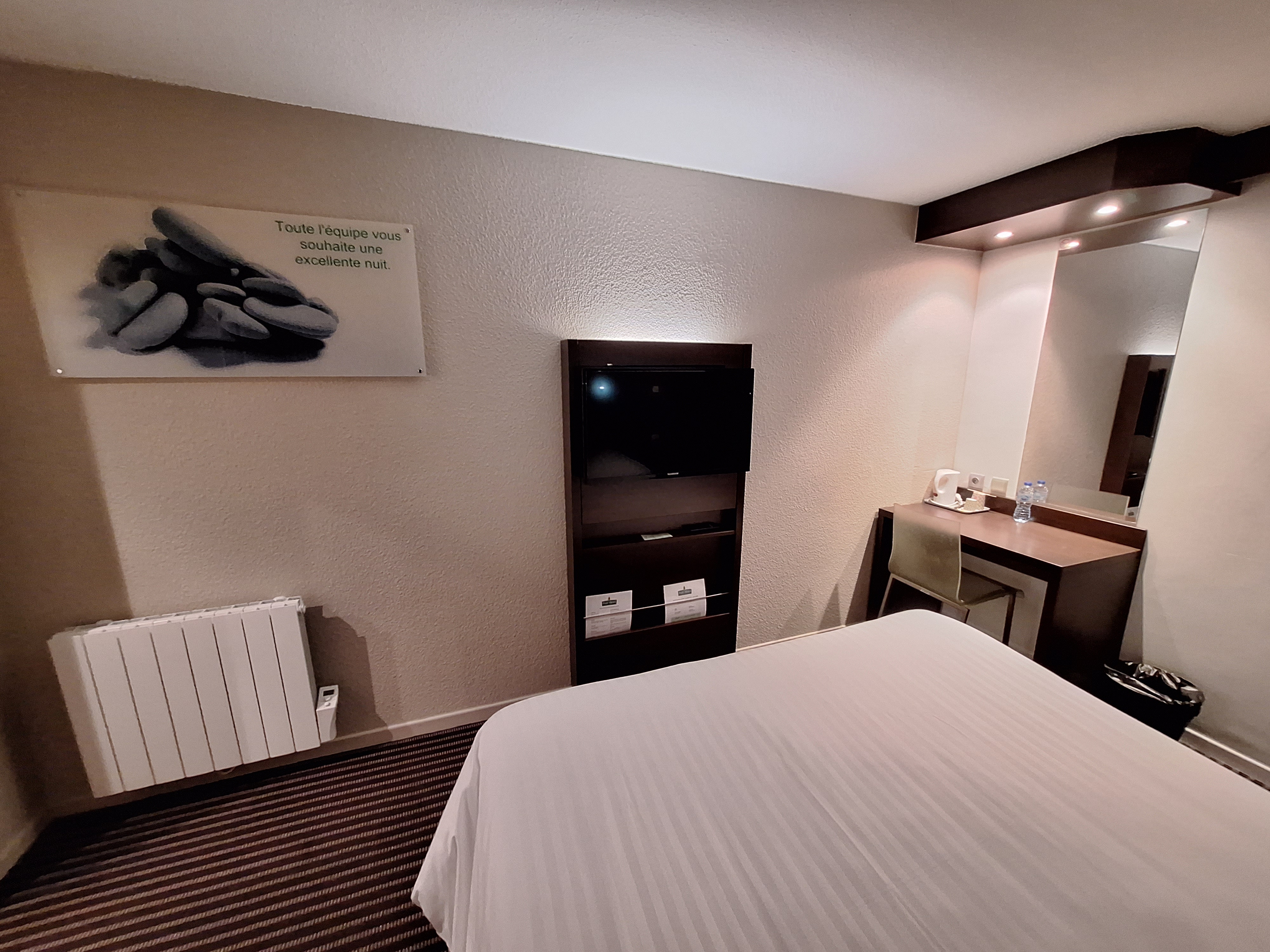 Confort, accueil et propreté au top, mais les 107 € sans petit déjeuner un 28 décembre en semaine ne son pas justifié Et encore moins quand on se fait réveiller à 8h30 pas le personnel pour faire la chambre ...