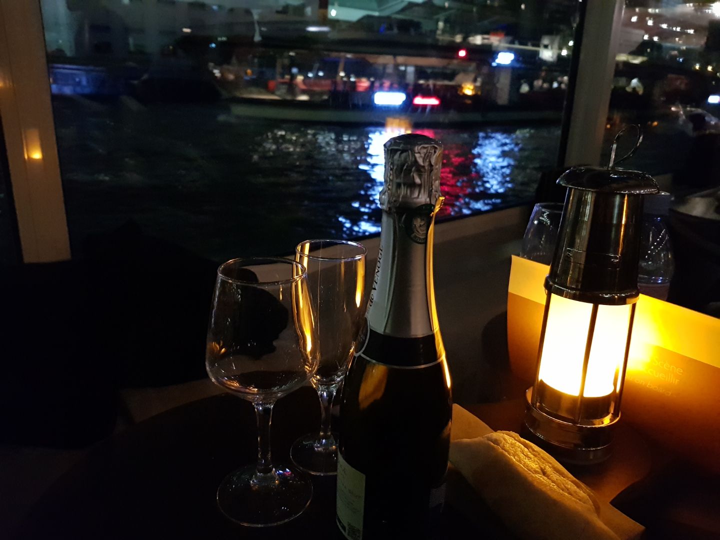 Nous nous attendions a un diner plus cosy … et nous avons attendus sous une pluie battante pour embarquer (pas de structure pour se mettre a l’abri … j’avais commander une deuxieme bouteille de champagne qui est arrivee tres tardivement … donc je ne conseille pas pour un diner cosy