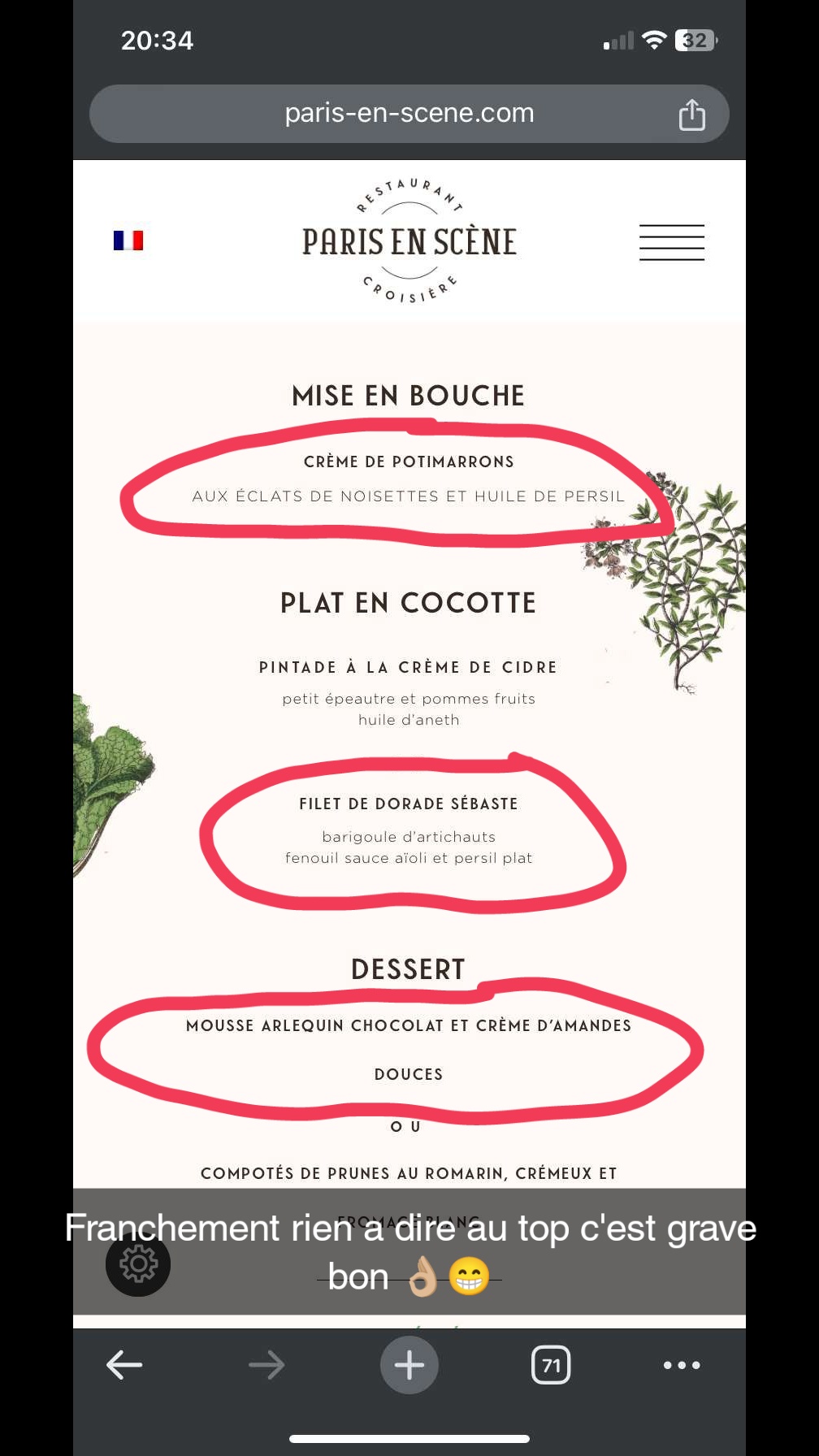 Arrivés devant notre table le hoste etait un peu rude en parlant avec des gens deja installés à notre place ( il les a littéralement virés). Au niveau de la cuisine c'etait ok sans plus (mention negative pour le dessert a la mague qui a le gout d'huile de poisson). Au niveau du service rapide tak tak tak et la serveuse était sympa. Un peu deçus pour le changement d'itineraire à cause de la montée de l'eau de la seine donc on n'a pas pu admirer paris et ses ponts.
