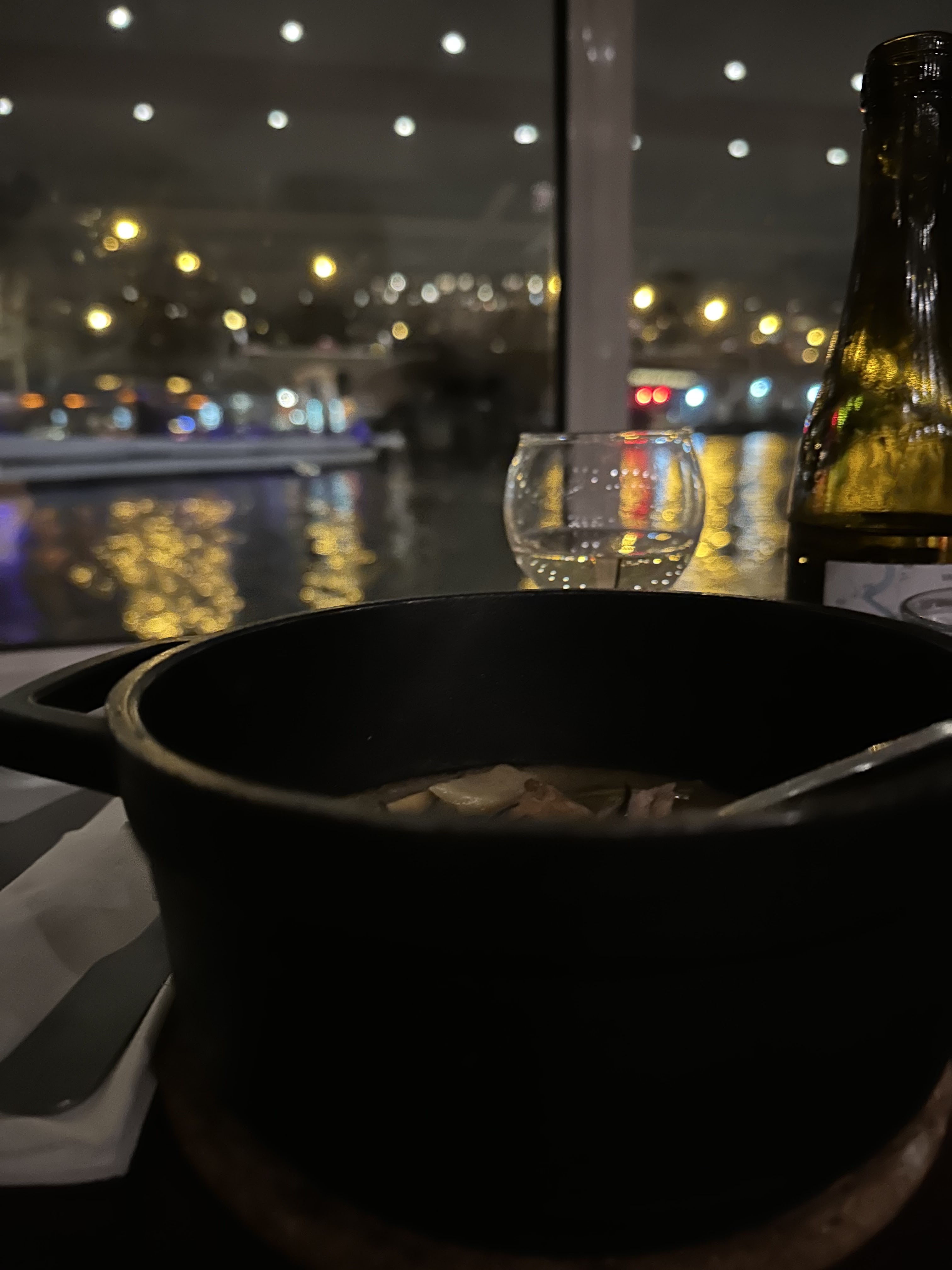 Dîner croisière magnifique, mais qui ne vaut pas toujours sont prix. • a part la cocotte qui est magnifique, l’entrée (un bête taboulé) et le dessert (mousse industrielle) sont décevants. • il y a une ambiance de vol Ryanair, on l’on essaie de vous faire dépenser encore plus (cocktails, session photo, …). C’est extrêmement dommage. • les lumières du bateau font reflet sur les vitres. Pas possible donc de faire de belles photos. Il y a donc de la place pour améliorer le service à bord. Car les autres croisières ne font pas mieux.
