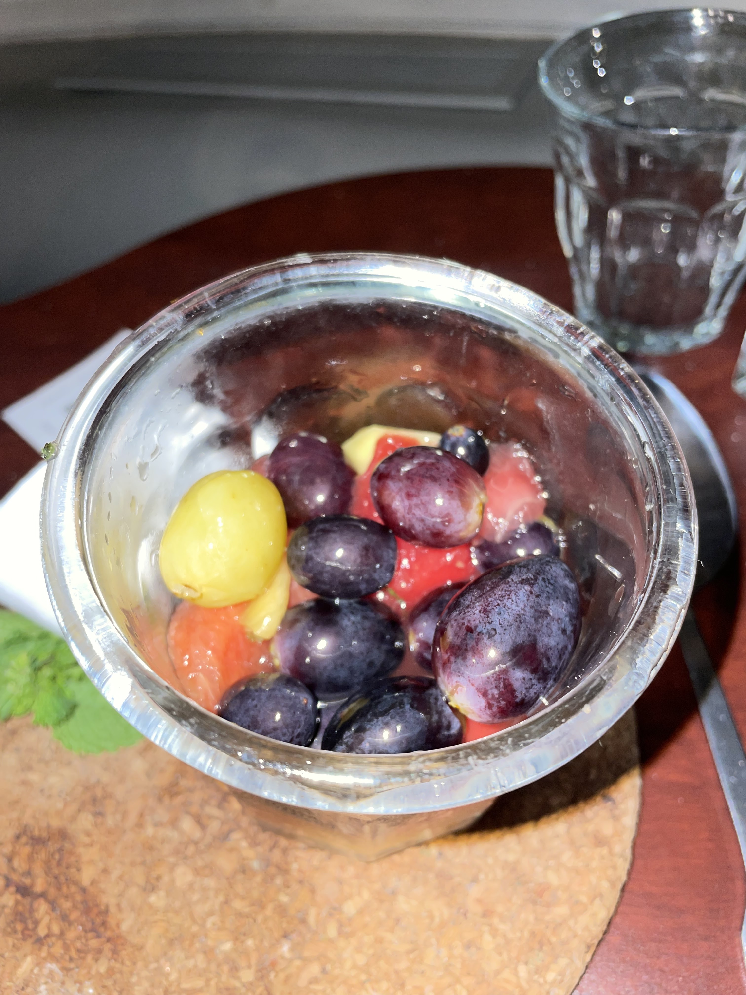 Nous avons demandé deux repas véganes et ils sont arrivé congelé comme les fruits du de dessert d’ailleurs . Le serveur nous a dit que le repas vegan n’était pas prévue voilà pourquoi rien était prêt . Mais alors pourquoi le mettre à la carte ? Ensuite nous sommes 3 personnes sur les 11 à s’être levés pour fumer . Le server est venue nous dire de régler une première fois , puis une deuxième fois . Et il nous a demandé de contacter nos amies par téléphone car elle étaient au toilette pour le règlement . Nous sommes sur un bateau , sauf erreur de ma par impossible de nous enfuire,sauf à la nage.