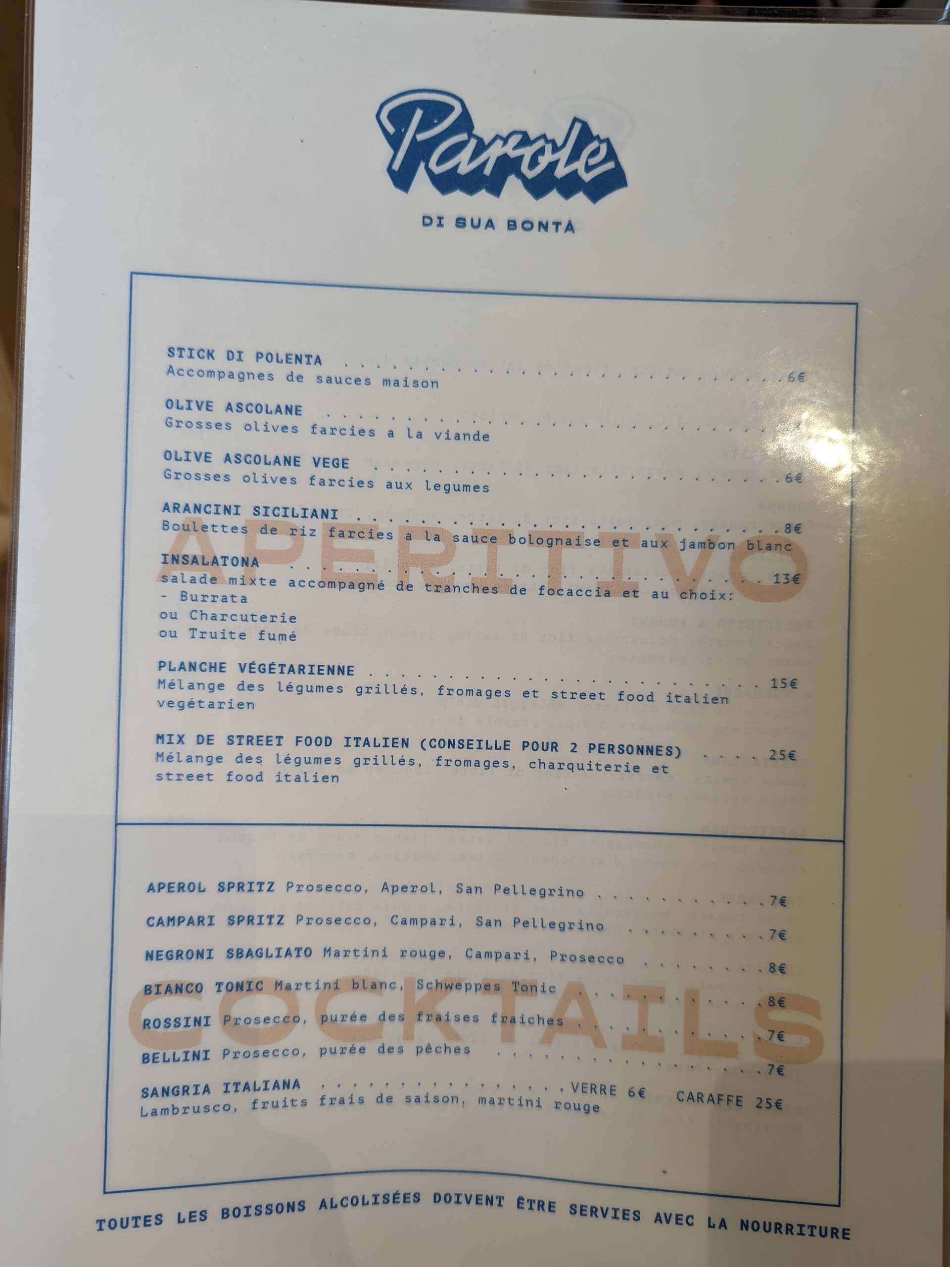 Un mot me vient tout de suite à l'esprit aprés un repas chez Parole : ENCORE Tout est bon, produits frais, spécialités italiennes, aperitivo, spritz, allez y les yeux fermés. Bravo aux équipes qui transmettent ce bel état d'esprit et cette envie de rester jusqu'a la fermeture ! BRAVO