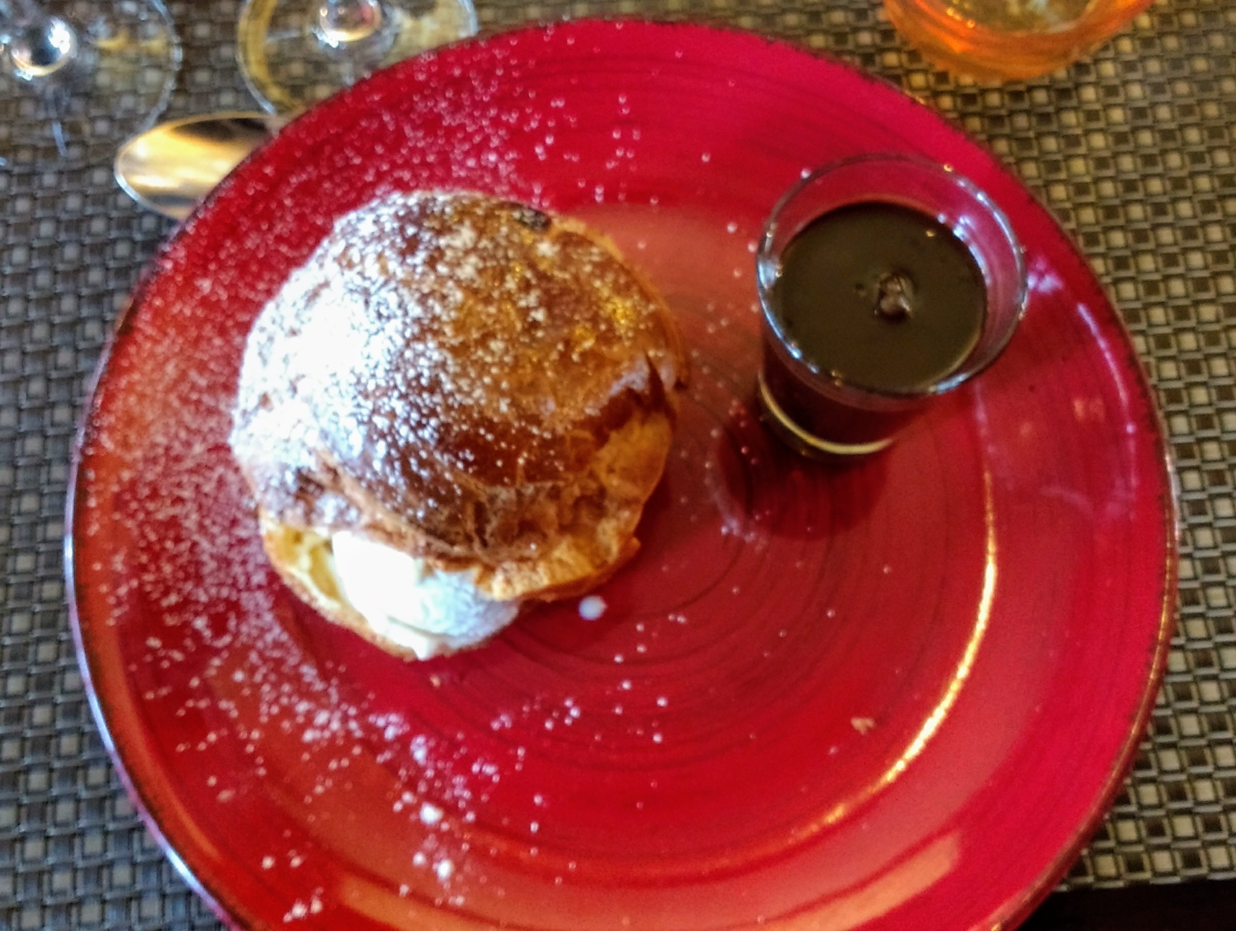 Amuse bouche excellent Bon risotto de légumes Pour la profiterole glace noisette, la pâte à chou était un peu sèche En salle, serveurs souriants mais sujets à maladresse