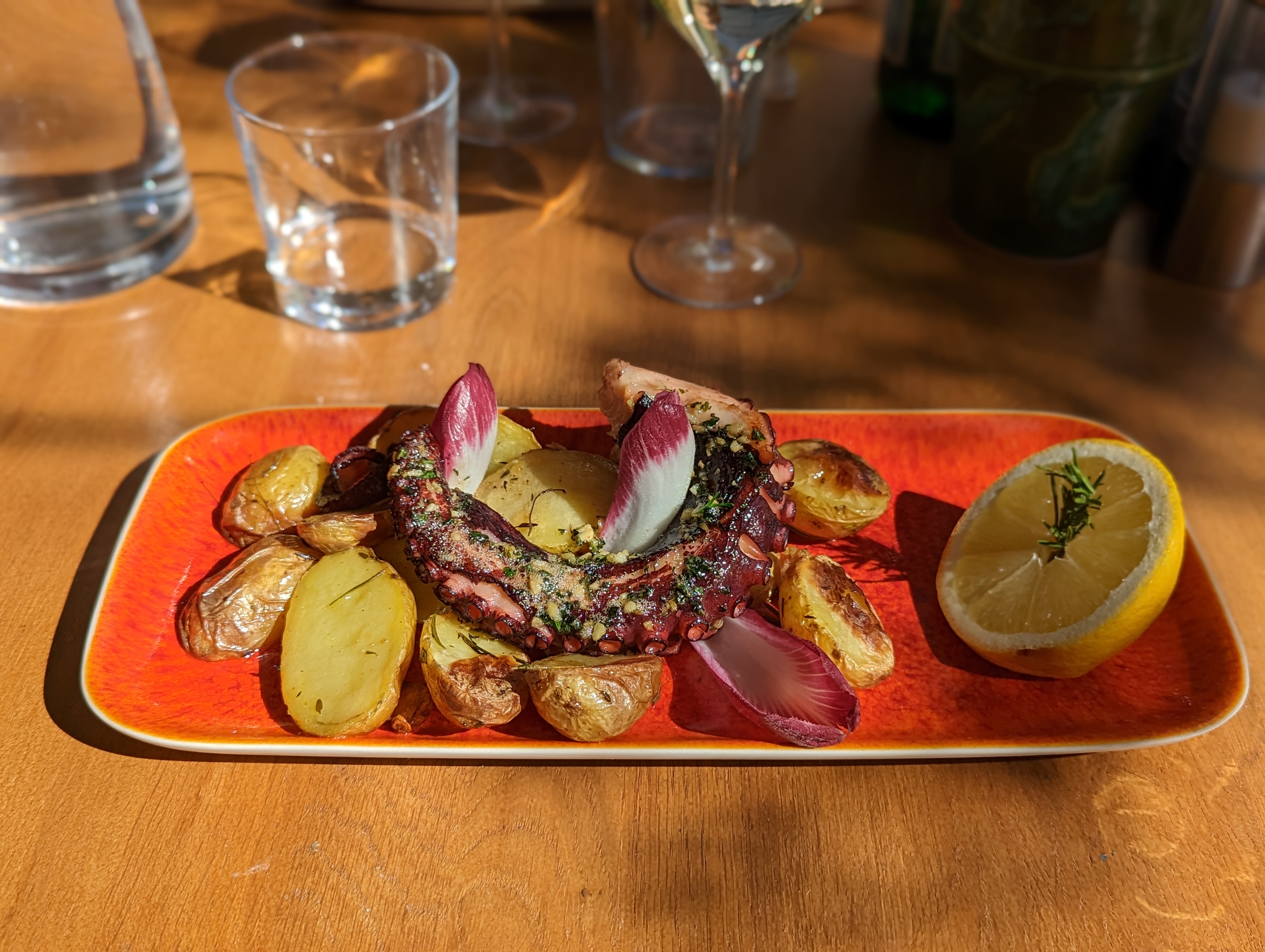 Le restaurant était complètement vide d'autres clients, ce qui était étrange puisque nous y sommes allés pendant les heures de dîner. Le menu se compose de petits plats de « tapas ». Nous avons commandé de la purée de pommes de terre, de la soupe aux lentilles et des gnocchis. Tous les plats étaient bons mais je recommanderais de saler la purée de pommes de terre. Le personnel était gentil.