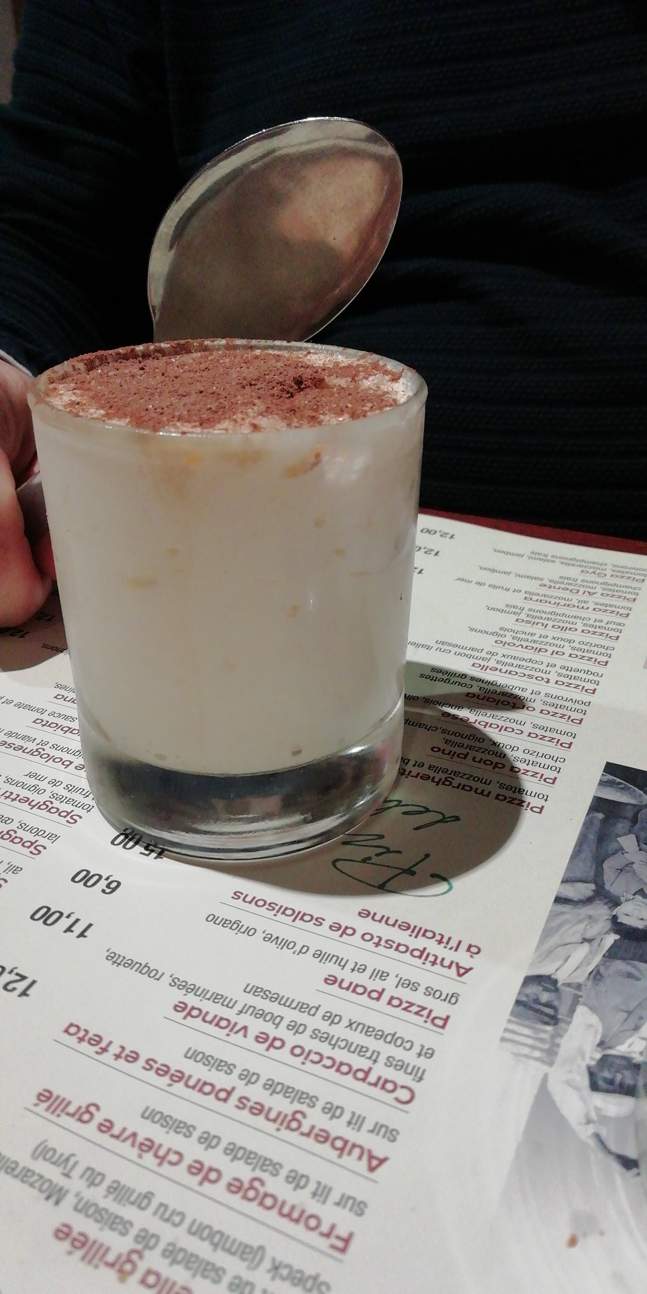 Le tiramisu n'était vraiment pas bon. Beaucoup de crème et un morceau de biscuit à la cuillère, le tout servi dans une petite verrine pour 6€. Nous avons aimés nos plats.