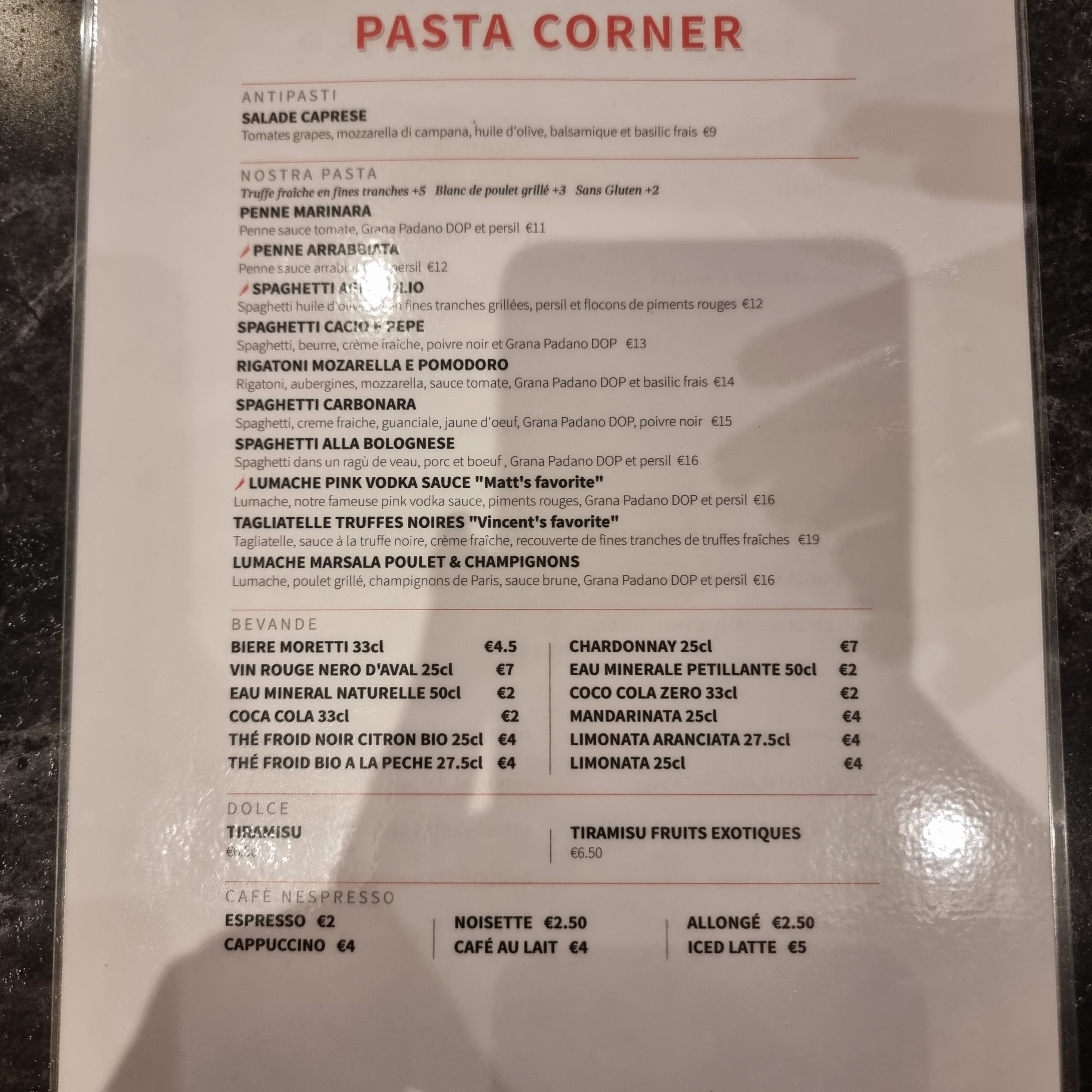 Le restaurant ne ce nome plus Pasta corner. Aillant mangé un midi avec ma soeur une demis heures à peine être sortis je me retrouve malade… Les produits ne devaient pas être très frais…. Dommage car le personnel reste tout de même agréable…