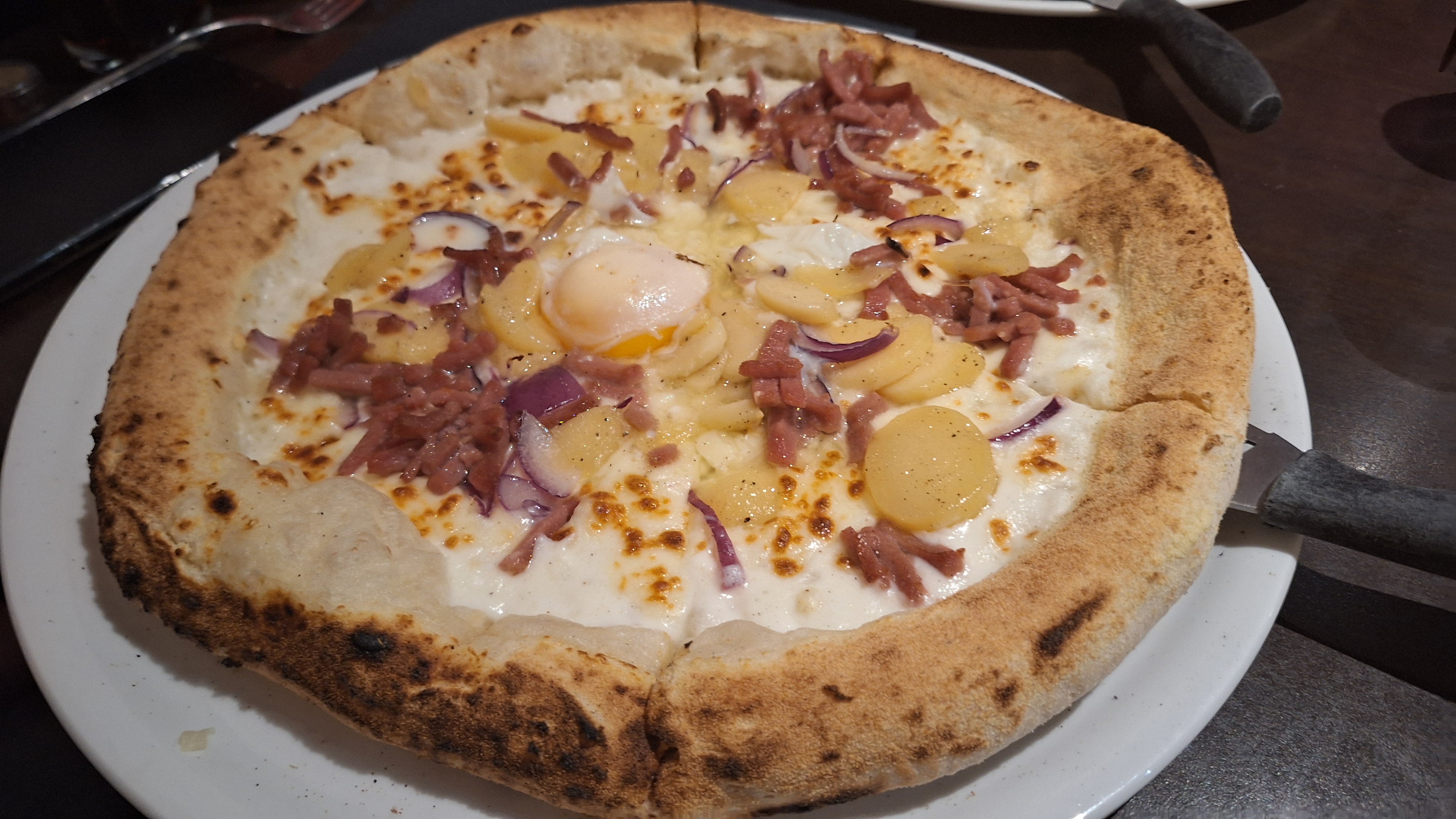 Excellente pizza, pâte a pizza délicieuse. Le feu de bois fait toute la différence, je recommande vivement.
