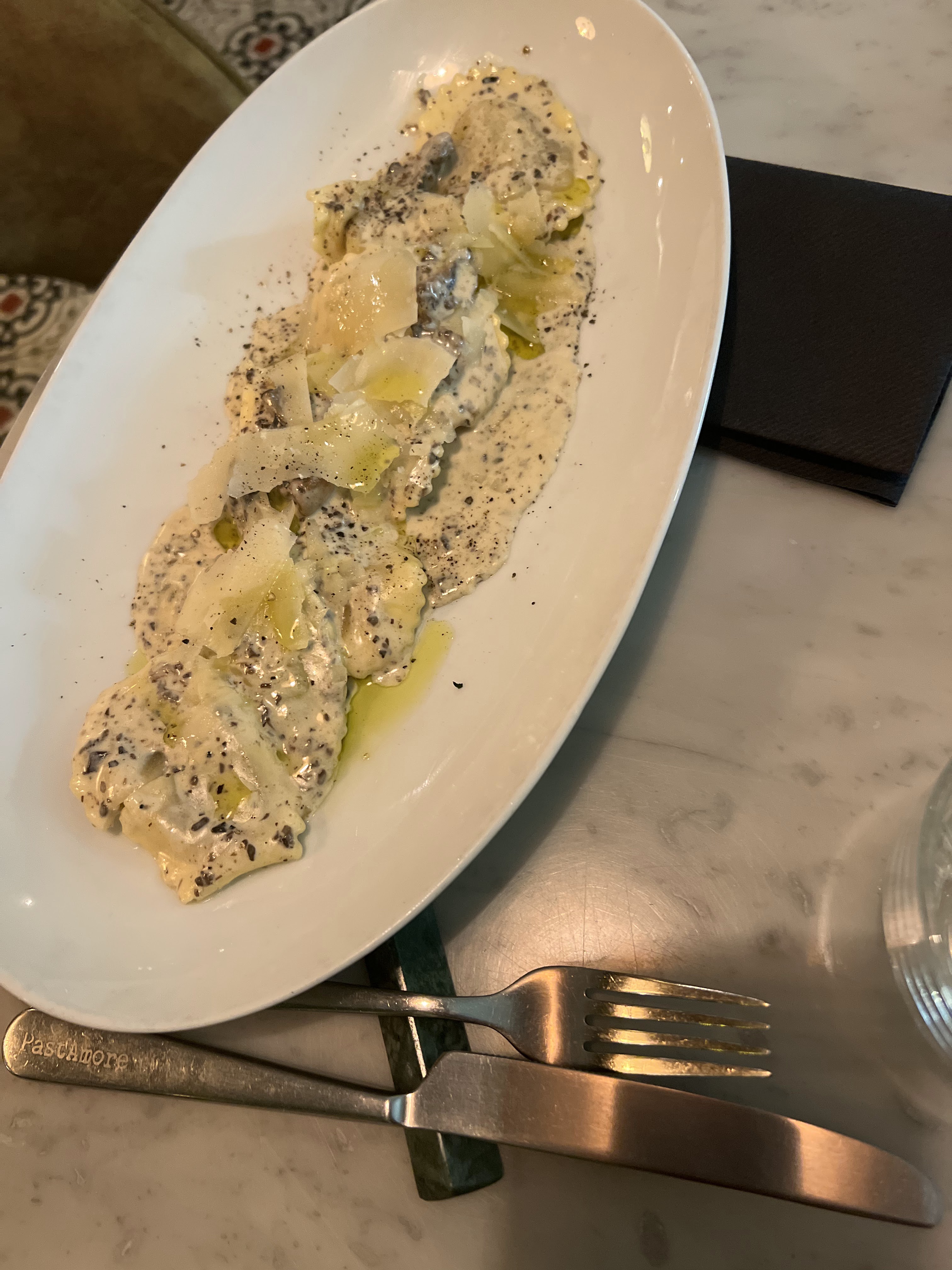 Restaurant de pâtes excellent. Nous y avons mangé deux fois en deux semaines. Je n'ai pas pu changer de plat tellement il était bon. J'ai pris à chaque fois les raviolis aux champignons et à la crème de truffe, une merveille. La première fois, j'avais pris en boisson un cocktail Ameretto sunrise excellent et très bien présenté. La seconde fois, j'ai pris un verre de vin Coltri, très bon pour accompagner le repas. Nous avions partagé, en entrée, une burrata aux jambon sec, très bonne. Le cadre du restaurant est également très mignon, avec de jolies peintures murales. C'est un restaurant dont je garderai précieusement le nom.
