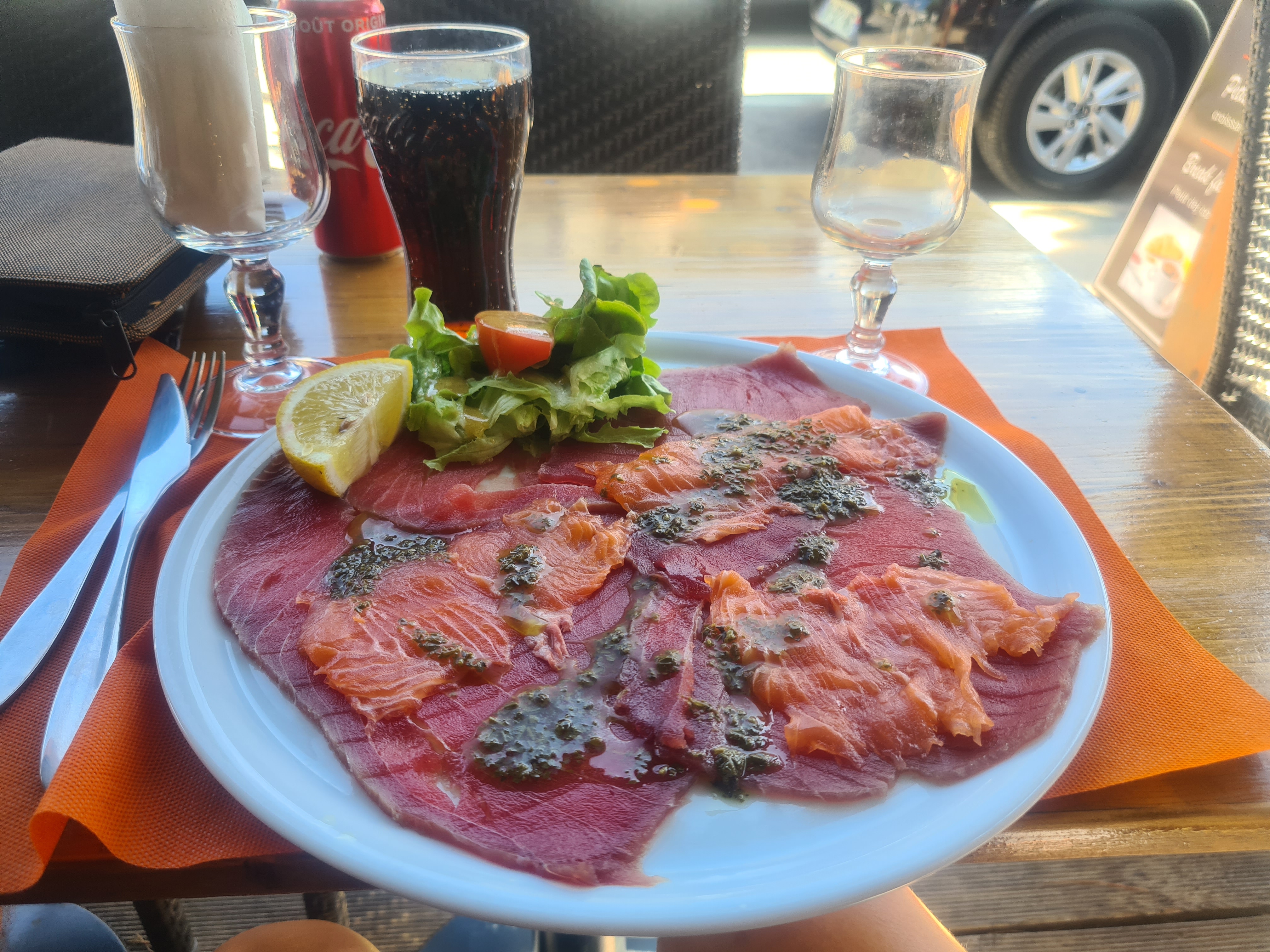 Petite pause le midi avant d’aller se baigner, nous avons opté pour la suggestion du chef (carpaccio de bœuf), nous nous sommes régalés !