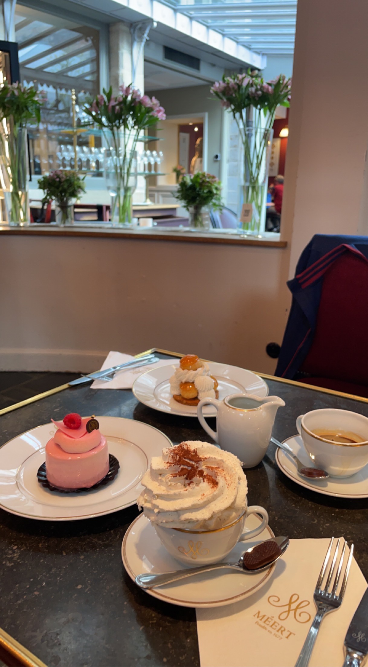 Meert c’est aussi un restaurant à découvrir ! Une carte efficace et des assiettes bien dressées et délicieuses ! En bonus, toutes les pâtisseries de l’établissement disponible en dessert! miammmm Bravo !! Personnel agréable. Salle avec une décoration unique ! Réservation en ligne facile et même par téléphone sans soucis. Je recommande vivement cet établissement !
