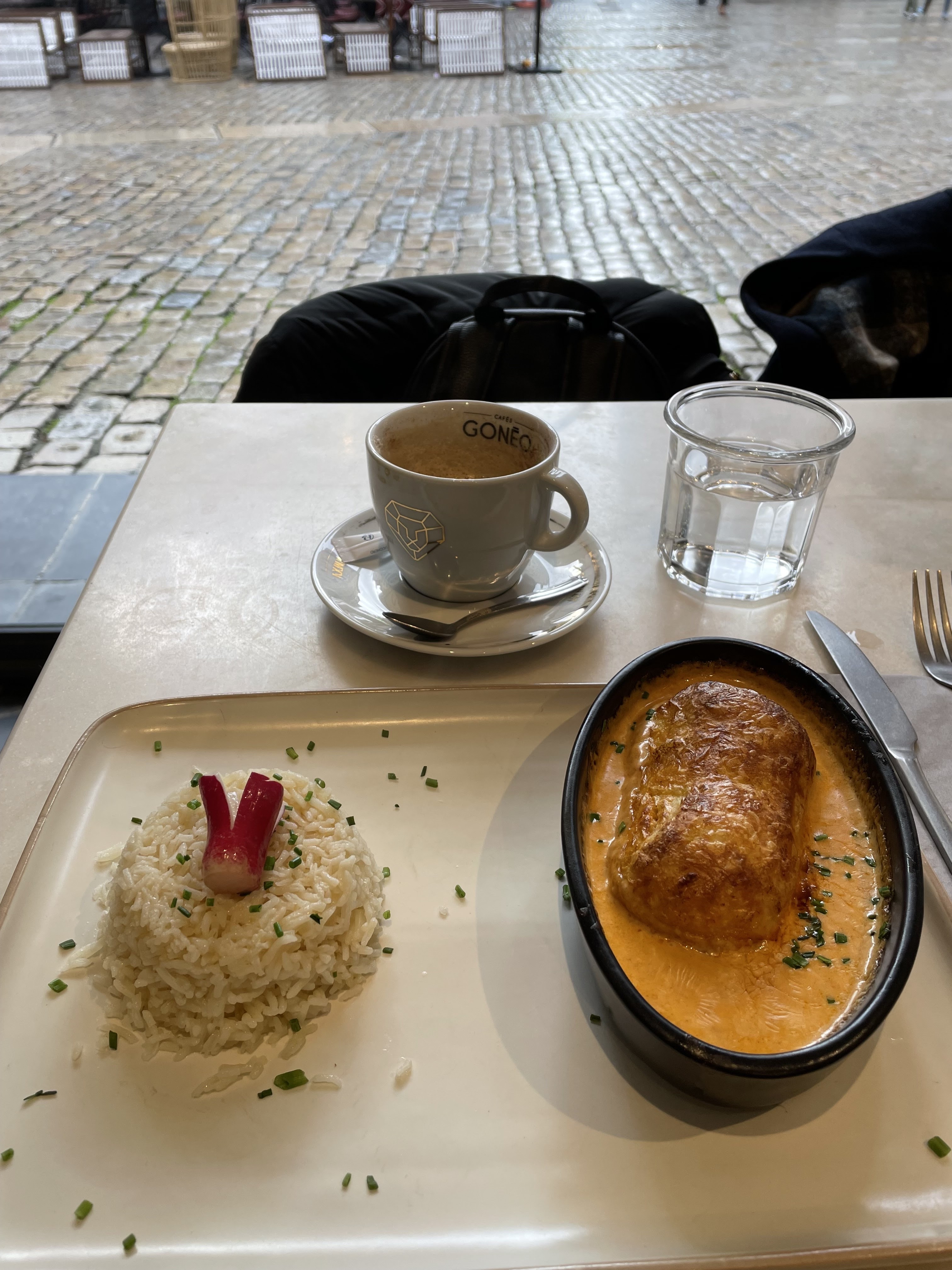 Nous avons eu Le croq hype et Quenelle sauce homardine (sur recommandation du propriétaire) et ils étaient tous les deux super ! La quenelle sauce homardine est un plat qu'on n'a jamais mangé auparavant et c'était tellement savoureux ! On nous a servi une bouteille d'eau fraîche (je pense que c'est quelque chose de spécifique aux restaurants lyonnais) et nous avons également eu un capucino et un kir (avec du chardonnay). Nous avons parlé en anglais avec le propriétaire et c'était super, et il était également très sympathique et gentil.