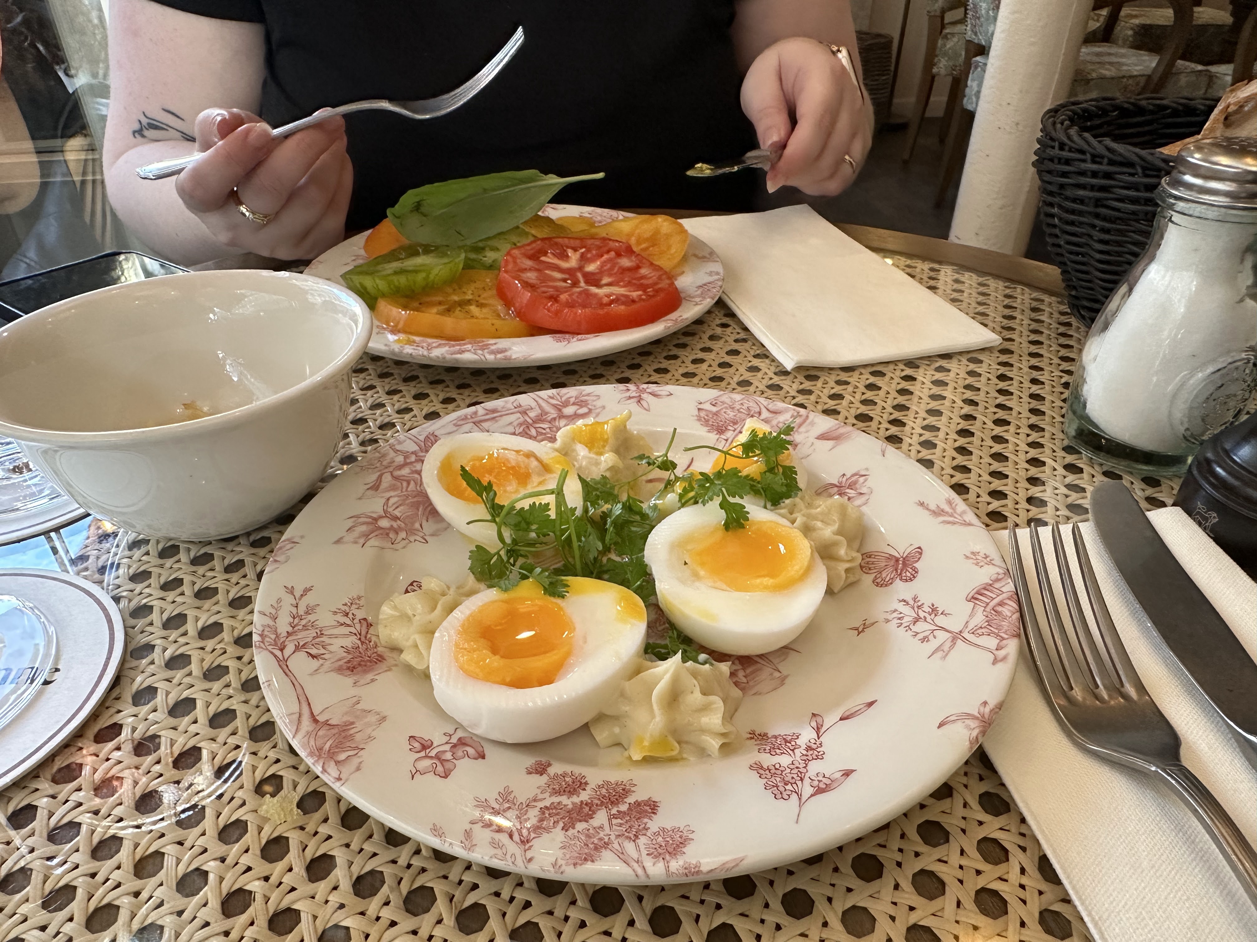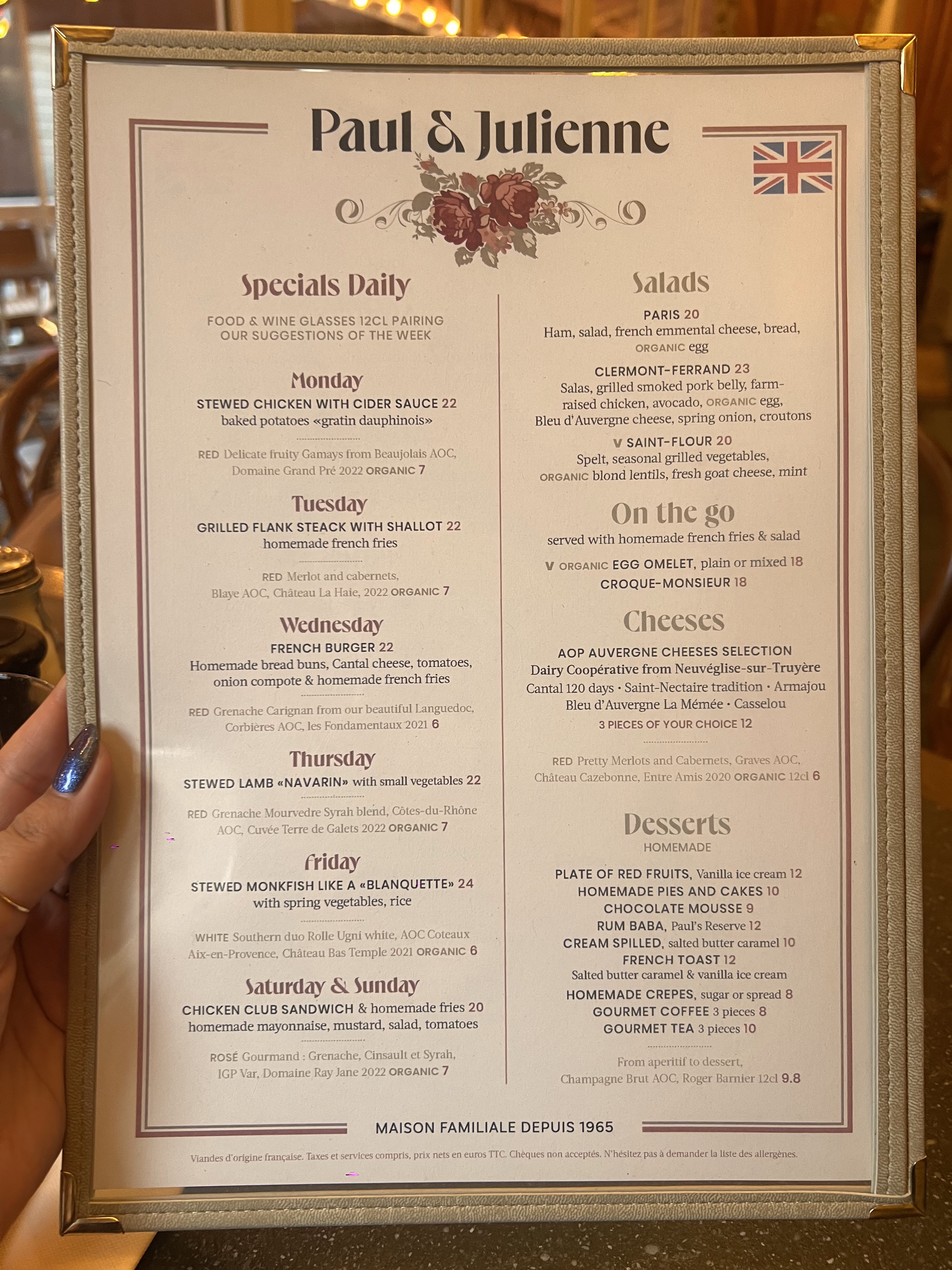 Quel véritable joyau à quelques pas des Galeries Lafayette près de l'opéra. Paul et Julienne ressemblaient à un lieu de petit-déjeuner très accueillant lors de notre première matinée à Paris et idéalement situé à quelques pâtés de maisons de notre hôtel. Dès que nous sommes entrés, nous avons été accueillis avec le sourire et conduits à un coin le long de la plaque de verre donnant sur la rue. Nous n'étions pas sûrs de la taille des portions, nous avons donc commandé quelques articles et, pour notre plus grand plaisir, des tas de plats absolument délicieux ont commencé à apparaître. Le petit plateau de charcuterie et de fromages était assez grand pour 4 personnes avec une belle sélection de fromages affinés et de salumi, la baguette est grillée. et chauds, les œufs étaient frais de la ferme biologique avec ce jaune orange vif caractéristique. C'était tellement bon que nous y sommes retournés pour le dessert le soir même. Les desserts sont tous faits maison et un menu itinérant si bon que nous y sommes retournés pour 3 repas supplémentaires. Dans une ville qui compte des milliers d’excellents restaurants, ne croyez pas au battage médiatique, celui-ci s’est démarqué comme un véritable joyau. On reviendra certainement