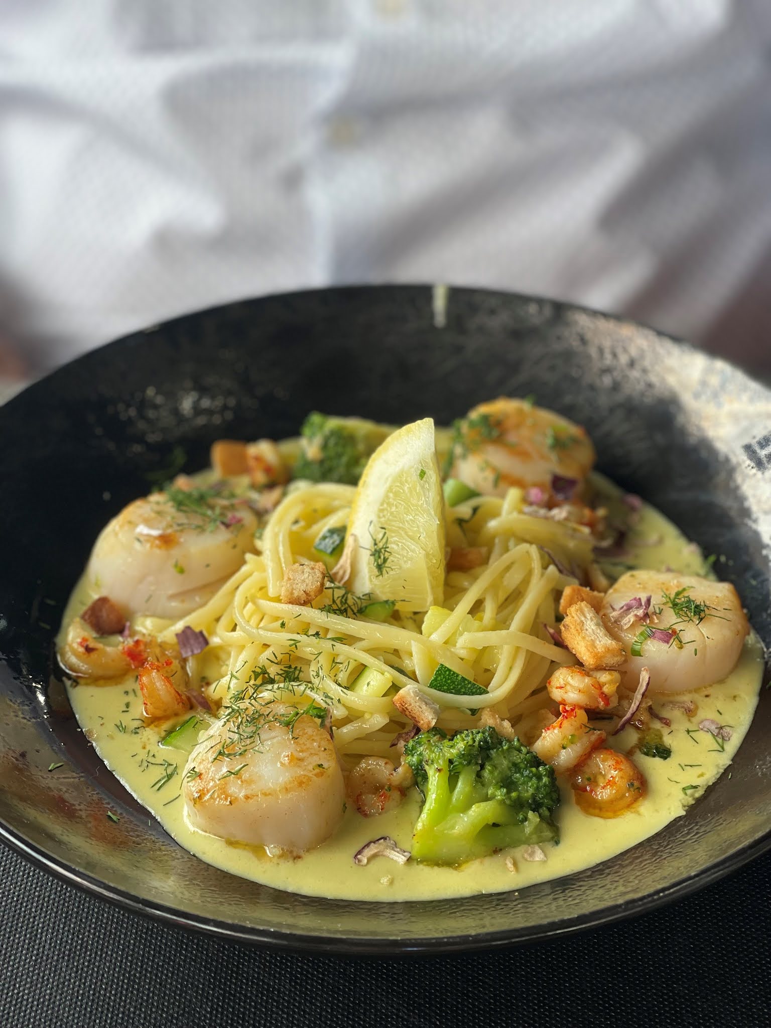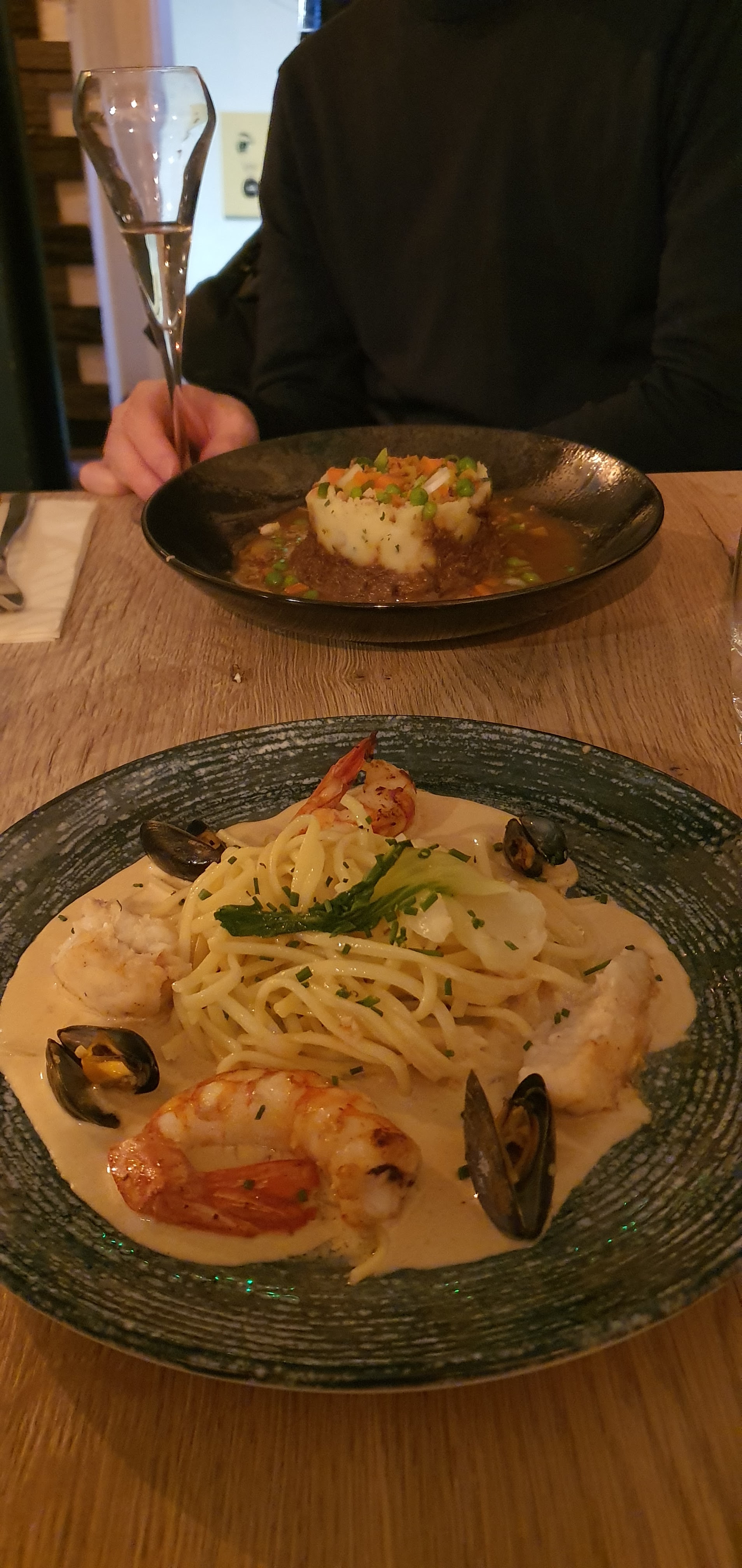 Bonne nourriture, service amical, le tout à des prix raisonnables. J'ai eu le vol au vent aux fruits de mer pour commencer et les linguines aux pétoncles pour le plat principal. OH avait poêlé le thon pour commencer et la dorade pour le plat principal. Tout est délicieux. Occupé même le lundi soir, je vous recommande donc de réserver.