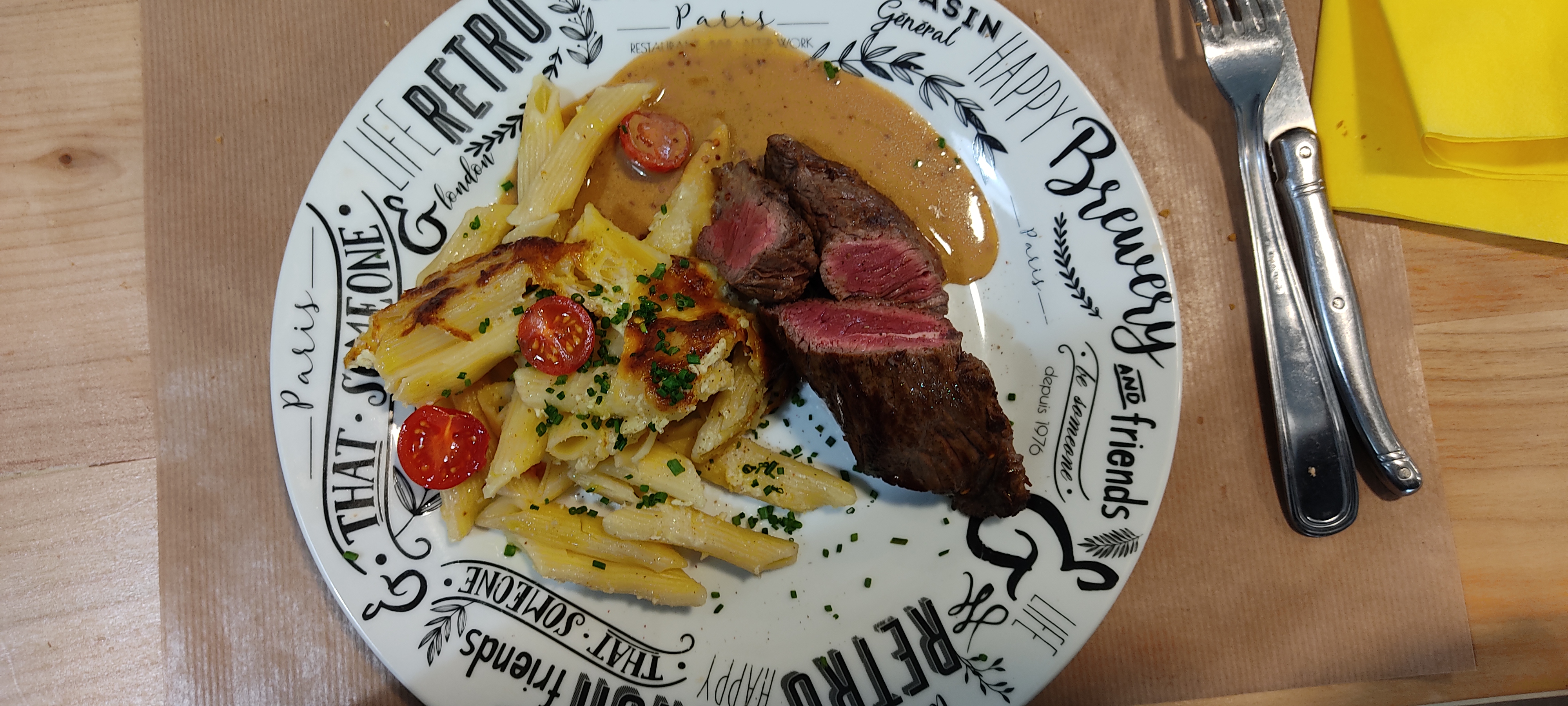 Repas en amoureux, rapport qualité prix très bon , la cote de bœuf est très tendre et très bonne , pareil pour le magret , desserts maison et tout aussi bon que les plats , Je recommande vivement ce lieux Gros + le cadre Seul petit bémol, pas de sauce pour accompagner la côte de bœuf.